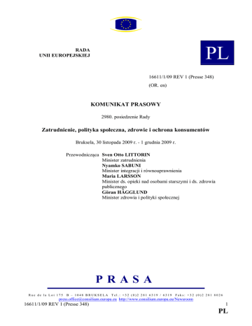 PL RADA UII EUROPEJSKIEJ 16611/1/09 REV 1 (Presse 348) (OR. en) KOMUIKAT PRASOWY 2980. posiedzenie Rady Zatrudnienie, polityka społeczna, zdrowie i ochrona konsumentów Bruksela, 30 listopada 2009 r. - 1 grudnia 2009 r. Przewodnicząca Sven Otto LITTORI Minister zatrudnienia yamko SABUI Minister integracji i równouprawnienia Maria LARSSO Minister ds. opieki nad osobami starszymi i ds. zdrowia publicznego Göran HÄGGLUD Minister zdrowia i polityki społecznej PRASA Rue de la Loi 175 B – 1048 BRUKSELA T el.: +32 (0)2 281 6319 / 6319 Fak s: +32 (0 )2 281 8026 [email protected] http://www.consilium.europa.eu/Newsroom 16611/1/09 REV 1 (Presse 348) 1 PL 30.XI.2009 Główne wyniki posiedzenia Rady Rada przeprowadziła dwie jawne debaty orientacyjne. W pierwszej debacie skupiono się na tym, jak wyjść z kryzysu i przygotować się do strategii lizbońskiej na okres po roku 2010. W tym kontekście ministrowie przyjęli konkluzje w sprawie działań na rzecz większego uczestnictwa w rynku pracy − wychodzenie z kryzysu i przygotowywanie się do strategii lizbońskiej na okres po roku 2010. W drugiej debacie zwrócono uwagę na równość płci: wzmacnianie wzrostu gospodarczego i zatrudnienia. Ministrowie przyjęli równieŜ konkluzje na ten temat. Ponadto Rada przyjęła konkluzje na następujące tematy: • zdrowe i godne starzenie się; oraz • weryfikacja realizacji pekińskiej platformy działania „Pekin 15+”: przegląd prac Rada osiągnęła porozumienie polityczne w następujących sprawach: • projekt dyrektywy nadającej skutek prawny zmienionemu porozumieniu ramowemu dotyczącemu urlopu rodzicielskiego, które zostało zawarte przez partnerów społecznych na szczeblu europejskim, w szczególności w zakresie zwiększenia wymiaru urlopu rodzicielskiego z trzech do czterech miesięcy dla kaŜdego z rodziców, • decyzja upowaŜniająca państwa członkowskie do ratyfikowania konwencji Międzynarodowej Organizacji Pracy dotyczącej pracy w sektorze rybołówstwa; oraz • projekt dyrektywy w sprawie zasady równego traktowania kobiet i męŜczyzn prowadzących działalność na własny rachunek. Ministrowie przyjęli konkluzje na następujące tematy: • innowacyjne zachęty do opracowywania skutecznych antybiotyków, • bezpieczna i skuteczna opieka zdrowotna dzięki e-zdrowiu; oraz • alkohol a zdrowie. Ministrowie przeprowadzili wymianę poglądów na temat pandemii grypy typu A(H1N1) w ramach aktualizacji i działań następczych po posiedzeniu Rady w dniu 12 października 2009 r. na podstawie informacji przekazanych przez prezydencję. Bez debaty Rada przyjęła zalecenie wzywające państwa członkowskie do podjęcia kroków prawnych, aby chronić ich obywateli przed naraŜeniem na dym tytoniowy. 16611/1/09 REV 1 (Presse 348) 2 PL 30.XI.2009 SPIS TREŚCI1 UCZESTICY .............................................................................................................................. 5 OMAWIAE PUKTY Zatrudnienie i polityka społeczna .................................................................................................... 7 Wychodzenie z kryzysu i przygotowanie agendy lizbońskiej na okres po roku 2010 ....................... 7 Zmienione porozumienie ramowe w sprawie urlopu rodzicielskiego ............................................... 9 Zdrowe i godne starzenie się ......................................................................................................... 10 Konwencja dotycząca pracy w sektorze rybołówstwa.................................................................... 10 Równość płci: wzmacnianie wzrostu gospodarczego i zatrudnienia............................................... 11 Pekińska platforma działania – „Pekin 15+”.................................................................................. 11 Ochrona socjalna osób prowadzących działalność na własny rachunek i małżonków współpracujących.......................................................................................................................... 12 Równe traktowanie bez względu na religię, niepełnosprawność, wiek lub orientację seksualną ..... 13 Zdrowie ........................................................................................................................................ 13 Prawa pacjentów w transgranicznej opiece zdrowotnej.................................................................. 13 Innowacyjne zachęty do opracowywania skutecznych antybiotyków............................................. 14 Bezpieczna i skuteczna opieka zdrowotna dzięki e-zdrowiu .......................................................... 15 Pakiet farmaceutyczny .................................................................................................................. 16 Alkohol a zdrowie......................................................................................................................... 17 Pandemia grypy typu A(H1N1)..................................................................................................... 17 Sprawy różne ................................................................................................................................ 19 Zagadnienia dotyczące zatrudnienia i polityki społecznej .............................................................. 19 1 Jeżeli deklaracje, konkluzje lub rezolucje zostały przez Radę formalnie przyjęte, jest to zaznaczone w tytule danego punktu, a tekst jest umieszczony w cudzysłowie. Dokumenty, do których odesłano w tekście, są dostępne na internetowej stronie Rady (http://www.consilium.europa.eu). Gwiazdką oznaczono akty przyjęte wraz z oświadczeniami do protokołu Rady przeznaczonymi do wiadomości publicznej; oświadczenia te można znaleźć na wyżej wspomnianej internetowej stronie Rady lub uzyskać z biura prasowego. 16611/1/09 REV 1 (Presse 348) 3 PL 30.XI.2009 Zagadnienia dotyczące zdrowia..............