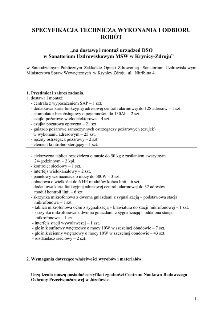 SPECYFIKACJA TECHNICZA WYKONANIA I ODBIORU ROBÓT „na dostawę i montaż urządzeń DSO w Sanatorium Uzdrowiskowym MSW w Krynicy-Zdroju” w Samodzielnym Publicznym Zakładzie Opieki Zdrowotnej Sanatorium Uzdrowiskowym Ministerstwa Spraw Wewnętrznych w Krynicy Zdroju ul. Nitribitta 4. 1. Przedmiot i zakres zadania. a. dostawa i montaż: - centrala z wyposażeniem SAP – 1 szt. - dodatkowa karta funkcyjnej adresowej centrali alarmowej do 128 adresów – 1 szt. - akumulator bezobsługowy o pojemności do 130Ah – 2 szt. - czujki pożarowe wielodetektorowe – 4 szt. - czujka pożarowa optyczna – 21 szt. - gniazdo pożarowe samoczynnych ostrzegaczy pożarowych (czujek) w wykonaniu adresowym – 25 szt. - ręczny ostrzegacz pożarowy – 2 szt. - element kontrolno-sterujący – 1 szt. - elektryczna tablica rozdzielcza o masie do 50 kg z zasilaniem awaryjnym 24-godzinnym – 2 kpl. - kontroler sieciowy – 1 szt. - interfejs wielokanałowy – 2 szt. - panelowy wzmacniacz o mocy do 500W – 3 szt. - obudowa o wielkości do 6 HE modułów końca linii – 6 szt. - dodatkowa karta funkcyjnej adresowej centrali alarmowej do 32 adresów moduł kontroli linii – 6 szt. - skrzynka mikrofonowa z dwoma gniazdami z sygnalizacją – podstawowa stacja mikrofonowa – 1 szt. - tablica mikrofonowa 6Gm z sygnalizacją – klawiatura do stacji mikrofonowej – 1 szt. - skrzynka mikrofonowa z dwoma gniazdami z sygnalizacją – oddalona stacja mikrofonowa – 1 szt. - interfejs stacji wywoławczej – 1 szt. - głośnik sufitowy wnętrzowy o mocy 10W w szczelnej obudowie – 7 szt. - głośnik ścienny wnętrzowy o mocy 10W w szczelnej obudowie – 43 szt. - rozdzielacz sieciowy – 2 szt. 2. Wymagania dotyczące właściwości wyrobów i materiałów. Urządzenia muszą posiadać certyfikat zgodności Centrum Naukowo-Badawczego Ochrony Przeciwpożarowej w Józefowie. 1 - centrala z wyposażeniem SAP z 4 liniami adresowalnymi z rozbudową do 8 linii, napięcie podstawowe 230V, z dodatkową kartą funkcyjnej adresowej centrali alarmowej do 128 adresów, pamięć zdarzeń 2000, pamięć alarmów 9999, układ pracy linii dozorowej pętlowy lub promieniowy. - elektryczne tablice rozdzielcze o masie do 50 kg z zasilaniem awaryjnym 24-godzinnym w stanie czuwania oraz 30 minut w stanie emisji komunikatów. Zasilanie 3 fazowe. W jednej szafie znajdować się będą : kontroler sieciowy, interfejs wielokanałowy, 3 szt. wzmacniaczy 2x250W, 2 szt. wzmacniaczy 1x500W, 2 półki z akumulatorami. W drugiej szafie znajdować się będą: interfejs wielokanałowy, 5 szt. wzmacniaczy 2x250W, 1 szt. wzmacniacz 1x500W, 2 półki z akumulatorami. Rozprowadzenie napięcia 48V. Zgodnie z PN-EN 54-4/A2. - kontroler sieciowy do systemów nagłośnieniowych oraz dźwiękowych systemów ostrzegawczych, w pełni cyfrowy z 4 wejściami i wyjściami audio, sterowanie i przełączenie do 28 kanałów audio, 8 nadzorowanych wejść sterujących i 5 wyjść sterujących, interfejs umożliwiający konfigurację –sterowanie-diagnostykę oraz logowanie, cyfrowa pamięć komunikatów, pamięć ostatnich 200 zdarzeń awarii. Zgodność z IEC 60849. - interfejs wielokanałowy, obsługa do 16 kanałów, złącze nadmiarowej sieci optycznej Zgodność z IEC 60065. - panelowy wzmacniacz o mocy do 500W, klasy D o wysokiej sprawności, impulsowe zasilacze sieciowe, działanie przy zasilaniu sieciowym i akumulatorowym, wejście lokalnego sygnału audio. Zgodność z IEC 60065. - interfejs stacji wywoławczej, możliwość dołączenia zdalnej stacji wywoławczej, dwa nadzorowane wejścia sterujące, wbudowany procesor DSP do przetwarzania sygnału audio. Do wszystkich urządzeń należy dołączyć opis, dane techniczne od producenta - DTR 2