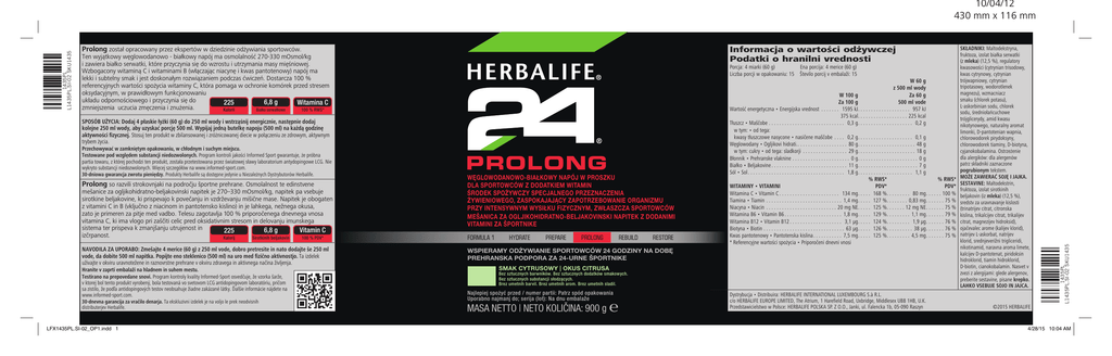 Informacja o wartości odżywczej Podatki o hranilni vrednosti Prolong został opracowany przez ekspertów w dziedzinie odżywiania sportowców. Ten wyjątkowy węglowodanowo - białkowy napój ma osmolalność 270-330 mOsmol/kg i zawiera białko serwatki, które przyczynia się do wzrostu i utrzymania masy mięśniowej. Wzbogacony witaminą C i witaminami B (włączając niacynę i kwas pantotenowy) napój ma lekki i subtelny smak i jest doskonałym rozwiązaniem podczas ćwiczeń. Dostarcza 100 % referencyjnych wartości spożycia witaminy C, która pomaga w ochronie komórek przed stresem oksydacyjnym, w prawidłowym funkcjonowaniu układu odpornościowego i przyczynia się do 6,8 g Witamina C 225 zmniejszenia uczucia zmęczenia i znużenia. Białko serwatkowe 100 % RWS* Kalorii SPOSÓB UŻYCIA: Dodaj 4 płaskie łyżki (60 g) do 250 ml wody i wstrząśnij energicznie, następnie dodaj kolejne 250 ml wody, aby uzyskać porcję 500 ml. Wypijaj jedną butelkę napoju (500 ml) na każdą godzinę aktywności fizycznej. Stosuj ten produkt w zbilansowanej i zróżnicowanej diecie w połączeniu ze zdrowym, aktywnym trybem życia. Przechowywać w zamkniętym opakowaniu, w chłodnym i suchym miejscu. Testowane pod względem substancji niedozwolonych. Program kontroli jakości Informed Sport gwarantuje, że próbna partia towaru, z której pochodzi ten produkt, została przetestowana przez światowej sławy laboratorium antydopingowe LCG. Nie wykryto substancji niedozwolonych. Więcej szczegółów na www.informed‐sport.com. 30-dniowa gwarancja zwrotu pieniędzy. Produkty Herbalife są dostępne jedynie u Niezależnych Dystrybutorów Herbalife. Prolong so razvili strokovnjaki na področju športne prehrane. Osmolalnost te edinstvene mešanice za ogljikohidratno-beljakovinski napitek je 270–330 mOsmol/kg, napitek pa vsebuje sirotkine beljakovine, ki prispevajo k povečanju in vzdrževanju mišične mase. Napitek je obogaten z vitamini C in B (vključno z niacinom in pantotensko kislino) in je lahkega, nežnega okusa, zato je primeren za pitje med vadbo. Telesu zagotavlja 100 % priporočenega dnevnega vnosa vitamina C, ki ima vlogo pri zaščiti celic pred oksidativnim stresom in delovanju imunskega sistema ter prispeva k zmanjšanju utrujenost in 6,8 g Vitamin C 225 izčrpanost. Sirotkinih beljakovin 100 % PDV* Kalorij NAVODILA ZA UPORABO: Zmešajte 4 merice (60 g) z 250 ml vode, dobro pretresite in nato dodajte še 250 ml vode, da dobite 500 ml napitka. Popijte eno steklenico (500 ml) na uro med fizično aktivnostjo. Ta izdelek uživajte v okviru uravnotežene in raznovrstne prehrane v okviru zdravega in aktivnega načina življenja. Hranite v zaprti embalaži na hladnem in suhem mestu. Testirano na prepovedane snovi. Program kontroly kvality Informed-Sport osvedčuje, že vzorka šarže, v ktorej bol tento produkt vyrobený, bola testovaná vo svetovom LCG antidopingovom laboratóriu, pričom sa zistilo, že podľa antidopingových testov neobsahuje žiadne zakázané látky. Ďalšie informácie nájdete na www.informed-sport.com. 30-dnevna garancija za vračilo denarja. Ta ekskluzivni izdelek je na voljo le prek neodvisnih distributerjev Herbalife. LFX1435PL.SI-02_OP1.indd 1 PROLONG WĘGLOWODANOWO-BIAŁKOWY NAPÓJ W PROSZKU DLA SPORTOWCÓW Z DODATKIEM WITAMIN ŚRODEK SPOŻYWCZY SPECJALNEGO PRZEZNACZENIA ŻYWIENIOWEGO, ZASPOKAJAJĄCY ZAPOTRZEBOWANIE ORGANIZMU PRZY INTENSYWNYM WYSIŁKU FIZYCZNYM, ZWŁASZCZA SPORTOWCÓW MEŠANICA ZA OGLJIKOHIDRATNO-BELJAKOVINSKI NAPITEK Z DODANIMI VITAMINI ZA ŠPORTNIKE formula 1 HYDRATE prepare prolong rebuild restore Porcja: 4 miarki (60 g) Ena porcija: 4 merice (60 g) Liczba porcji w opakowaniu: 15 Število porcij v embalaži: 15 W 60 g z 500 ml wody W 100 g Za 60 g Za 100 g 500 ml vode Wartość energetyczna • Energijska vrednost . . . . . . . . 1595 kJ. . . . . . . . . . . . . . . . . . . . . 957 kJ 375 kcal. . . . . . . . . . . . . . . . . . . 225 kcal Tłuszcz • Maščobe. . . . . . . . . . . . . . . . . . . . . . . . . . . . . . 0,3 g. . . . . . . . . . . . . . . . . . . . . . 0,2 g w tym: • od tega: kwasy tłuszczowe nasycone • nasičene maščobe . . . . . 0,2 g. . . . . . . . . . . . . . . . . . . . . . 0,1 g Węglowodany • Ogljikovi hidrati.. . . . . . . . . . . . . . . . . . . 80 g. . . . . . . . . . . . . . . . . . . . . . 48 g w tym: cukry • od tega: sladkorji . . . . . . . . . . . . . . . . . 29 g. . . . . . . . . . . . . . . . . . . . . . 18 g Błonnik • Prehranske vlaknine. . . . . . . . . . . . . . . . . . . . . . 0 g. . . . . . . . . . . . . . . . . . . . . . . 0 g Białko • Beljakovine. . . . . . . . . . . . . . . . . . . . . . . . . . . . . 11 g. . . . . . . . . . . . . . . . . . . . . . . 7 g Sól • Sol. . . . . . . . . . . . . . . . . . . . . . . . . . . . . . . . . . . . . . 1,8 g. . . . . . . . . . . . . . . . . . . . . . 1,1 g % RWS* % RWS* WITAMINY • VITAMINI PDV* PDV* Witamina C • Vitamin C. . . . . . . . . . . . . . . . . . . . . . . . 134 mg. . . . . . 168 %. . . . . . . . . . 80 mg. . . . . . 100 % Tiamina • Tiamin. . . . . . . . . . . . . . . . . . . . . . . . . . . . . 1,4 mg. . . . . . 127 %. . . . . . . . 0,83 mg. . . . . . . 75 % Niacyna • Niacin . . . . . . . . . . . . . . . . . . . . . . . . . . . 20 mg NE. . . . . . 125 %. . . . . . . 12 mg NE. . . . . . . 75 % Witamina B6 • Vitamin B6. . . . . . . . . . . . . . . . . . . . . . 1,8 mg. . . . . . 129 %. . . . . . . . . 1,1 mg. . . . . . . 79 % Witamina B12 • Vitamin B12. . . . . . . . . . . . . . . . . . . . . 3,1 μg. . . . . . 124 %. . . . . . . . . . 1,9 μg. . . . . . . 76 % Biotyna • Biotin. . . . . . . . . . . . . . . . . . . . . . . . . . . . . . . 63 μg. . . . . . 126 %. . . . . . . . . . 38 μg. . . . . . . 76 % Kwas pantotenowy • Pantotenska kislina. . . . . . . . . . . 7,5 mg. . . . . . 125 %. . . . . . . . . 4,5 mg. . . . . . . 75 % * Referencyjne wartości spożycia • Priporočeni dnevni vnosi WSPIERAMY ODŻYWIANIE SP