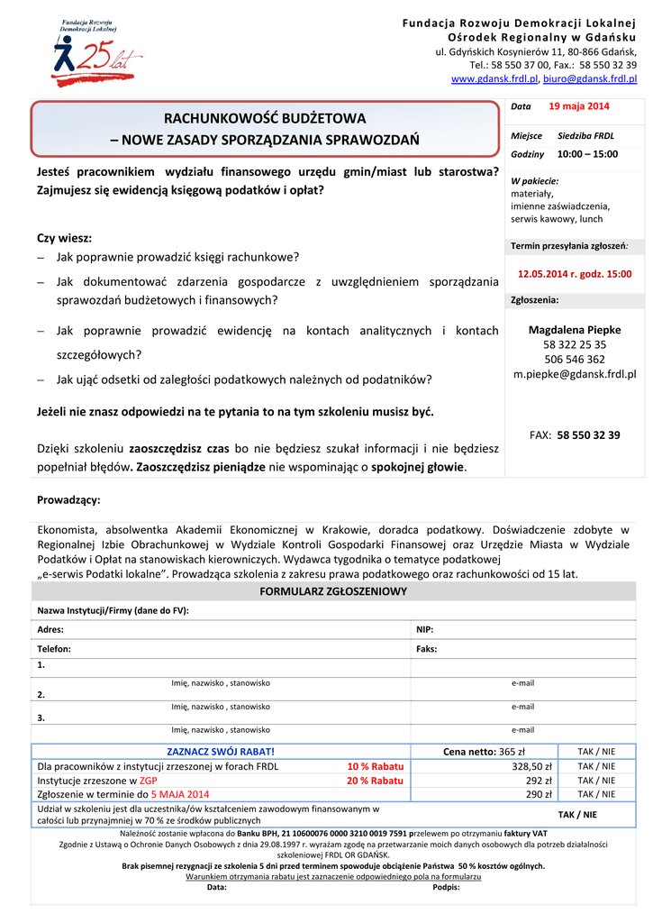 Fundacja Rozwoj u Demokracji Lokal nej Ośrodek Regionalny w Gdańs ku ul. Gdyńskich Kosynierów 11, 80-866 Gdańsk, Tel.: 58 550 37 00, Fax.: 58 550 32 39 www.gdansk.frdl.pl, [email protected] Data RACHUNKOWOŚĆ BUDŻETOWA – NOWE ZASADY SPORZĄDZANIA SPRAWOZDAŃ 19 maja 2014 Miejsce Siedziba FRDL Godziny 10:00 – 15:00 Jesteś pracownikiem wydziału finansowego urzędu gmin/miast lub starostwa? Zajmujesz się ewidencją księgową podatków i opłat? W pakiecie: Czy wiesz: Jak poprawnie prowadzić księgi rachunkowe? Termin przesyłania zgłoszeń: Jak dokumentować zdarzenia gospodarcze z uwzględnieniem sporządzania sprawozdań budżetowych i finansowych? Jak poprawnie prowadzić ewidencję na kontach analitycznych i kontach szczegółowych? Jak ująć odsetki od zaległości podatkowych należnych od podatników? materiały, imienne zaświadczenia, serwis kawowy, lunch 12.05.2014 r. godz. 15:00 Zgłoszenia: Magdalena Piepke 58 322 25 35 506 546 362 [email protected] Jeżeli nie znasz odpowiedzi na te pytania to na tym szkoleniu musisz być. FAX: 58 550 32 39 Dzięki szkoleniu zaoszczędzisz czas bo nie będziesz szukał informacji i nie będziesz popełniał błędów. Zaoszczędzisz pieniądze nie wspominając o spokojnej głowie. Prowadzący: Ekonomista, absolwentka Akademii Ekonomicznej w Krakowie, doradca podatkowy. Doświadczenie zdobyte w Regionalnej Izbie Obrachunkowej w Wydziale Kontroli Gospodarki Finansowej oraz Urzędzie Miasta w Wydziale Podatków i Opłat na stanowiskach kierowniczych. Wydawca tygodnika o tematyce podatkowej „e-serwis Podatki lokalne”. Prowadząca szkolenia z zakresu prawa podatkowego oraz rachunkowości od 15 lat. FORMULARZ ZGŁOSZENIOWY Nazwa Instytucji/Firmy (dane do FV): Adres: NIP: Telefon: Faks: 1. Imię, nazwisko , stanowisko e-mail Imię, nazwisko , stanowisko e-mail Imię, nazwisko , stanowisko e-mail 2. 3. ZAZNACZ SWÓJ RABAT! Dla pracowników z instytucji zrzeszonej w forach FRDL Instytucje zrzeszone w ZGP Zgłoszenie w terminie do 5 MAJA 2014 10 % Rabatu 20 % Rabatu Udział w szkoleniu jest dla uczestnika/ów kształceniem zawodowym finansowanym w całości lub przynajmniej w 70 % ze środków publicznych Cena netto: 365 zł 328,50 zł 292 zł 290 zł TAK / NIE TAK / NIE TAK / NIE TAK / NIE TAK / NIE Należność zostanie wpłacona do Banku BPH, 21 10600076 0000 3210 0019 7591 przelewem po otrzymaniu faktury VAT Zgodnie z Ustawą o Ochronie Danych Osobowych z dnia 29.08.1997 r. wyrażam zgodę na przetwarzanie moich danych osobowych dla potrzeb działalności szkoleniowej FRDL OR GDAŃSK. Brak pisemnej rezygnacji ze szkolenia 5 dni przed terminem spowoduje obciążenie Państwa 50 % kosztów ogólnych. Warunkiem otrzymania rabatu jest zaznaczenie odpowiedniego pola na formularzu Data: Podpis: Program szkolenia: 1. Ogólne zasady ewidencji księgowej podatków (wykorzystanie kont syntetycznych planu kont urzędu jako jednostki budżetowej). 2. Konta ewidencji syntetycznej służące do ewidencji z tytułu podatków (omówienie zasad działania kont, podział na konta bilansowe i pozabilansowe, przedstawienie księgowań na poszczególnych kontach). 3. Ewidencja na kontach analitycznych i kontach szczegółowych. 4. Ewidencja przypisów, odpisów, wpłat i zwrotów podatków – przedstawienie księgowań. Pojęcia „przypis”, „odpis”, „należności uboczne” w ewidencji organu podatkowego. 5. Ujęcie odsetek od zaległości podatkowych należnych od podatników. 6. Prowadzenie kont pozabilansowych w zakresie podatków. 7. Rodzaje dowodów księgowych stanowiących podstawę do zapisów w księdze rachunkowej (dokumentowanie przypisów, odpisów, wygaśnięcia zobowiązania podatkowego oraz zwrotów). 8. Zasady sporządzania sprawozdania jednostkowego Rb-27S z wykonania planu dochodów budżetowych z tytułu podatków i opłat na podstawie danych z księgowości podatkowej. 9. Dane wykazywane w kolumnie „Należności”, „Dochody wykonane” i „Dochody otrzymane”. 10. „Należności pozostałe do zapłaty” i „Zaległości netto” w sprawozdaniu Rb-27 S 11. Ustalenie skutków decyzji wydanych przez organ podatkowy w zakresie umorzeń zaległości podatkowych i rozłożenia na raty oraz odroczenia terminu płatności. 12. Ujęcie należności podatkowych w sprawozdaniu Rb - N. 13. Wykazywanie danych w zakresie należności i zobowiązań w bilansie jednostki budżetowej. 14. Odpisy aktualizujące należności (zasady, ewidencja księgowa, informacje uzupełniające w bilansie).