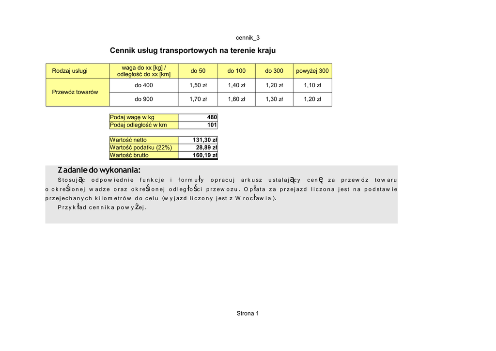 cennik_3 Cennik usług transportowych na terenie kraju Rodzaj usługi waga do xx [kg] / odległość do xx [km] do 50 do 100 do 300 powyżej 300 do 400 1,50 zł 1,40 zł 1,20 zł 1,10 zł do 900 1,70 zł 1,60 zł 1,30 zł 1,20 zł Przewóz towarów Podaj wagę w kg Podaj odległość w km Wartość netto Wartość podatku (22%) Wartość brutto 480 101 131,30 zł 28,89 zł 160,19 zł Z adanie do wykonania: S to su j ąc o d p o w i ed n i e f u n k c j e i f o r m u ły o p r ac u j ar k u sz u st al aj ąc y c en ę z a p r z ew ó z to w ar u o o k r e śl o n ej w ad z e o r az o k r e śl o n ej o d l eg ło śc i p r z ew o z u . O p łata z a p r z ej az d l i c z o n a j est n a p o d staw i e p r z ej ec h an y c h k i l o m etr ó w d o c el u (w y j az d l i c z o n y j est z W r o c ław i a). P r z y k ład c en n i k a p o w y żej . Strona 1 cennik_p1 Cennik usług transportowych na terenie kraju – sposoby rozwiązań Przykład 1 od 0 do 50 Rodzaj usługi Przewóz towarów waga do xx [kg] / odległość do xx [km] 400 900 od 51 do 100 od 101 do 300 powyżej 300 0 51 101 301 1,50 zł 1,70 zł 1,40 zł 1,60 zł 1,20 zł 1,30 zł 1,10 zł 1,20 zł od 0 do 50 od 51 do 100 od 101 do 300 powyżej 300 Zagnieżdzone funkcje”Jeżeli” oraz „wyszukaj poziomo” Przykład 2 Rodzaj usługi Przewóz towarów waga do xx [kg] / odległość do xx [km] 400 900 50 100 300 301 1,50 zł 1,70 zł 1,40 zł 1,60 zł 1,20 zł 1,30 zł 1,10 zł 1,20 zł Zagnieżdzone funkcje: Jeżeli Przykład 3 Rodzaj usługi Przewóz towarów waga do xx [kg] / odległość do xx [km] do 400 do 900 do 50 do 100 do 300 powyżej 300 1,50 zł 1,70 zł 1,40 zł 1,60 zł 1,20 zł 1,30 zł 1,10 zł 1,20 zł Strona 2 Zagnieżdzone funkcje: Jeżeli przyklad_zagniezdzanie Uczniowie – oceny z zachowania Nazwisko Anioł Bocian Cebula Diakon Elkon Fanfara Gruszka Jurczyk imię Katarzyna Jan Roman Marlena Mariusz Małgorzata Leszek Bolesław ilość punktów Ocen z zachowania 15 negatywna 10 negatywna 26 pozytywna 30 pozytywna 50 wyróżniająca 48 wyróżniająca 25 negatywna 45 pozytywna Warunki graniczne < 26 negatywna 26 do 45 pozytywna >45 wyróżniająca Przykład zagnieżdżania funkcji: Z ag n i e żd żan i e f u n k c j i j e żel i w z al e żn o śc i o d w ar u n k ó w g r an i c z n y c h . Strona 3