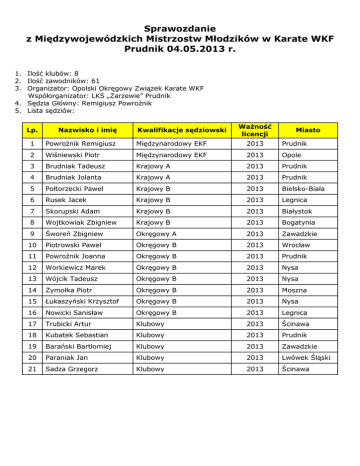 Sprawozdanie z Międzywojewódzkich Mistrzostw Młodzików w Karate WKF Prudnik 04.05.2013 r. 1. Ilość klubów: 8 2. Ilość zawodników: 61 3. Organizator: Opolski Okręgowy Związek Karate WKF Współorganizator: LKS „Zarzewie” Prudnik 4. Sędzia Główny: Remigiusz Powroźnik 5. Lista sędziów: Lp. Nazwisko i imię Kwalifikacje sędziowski Ważność licencji Miasto 1 Powroźnik Remigiusz Międzynarodowy EKF 2013 Prudnik 2 Wiśniewski Piotr Międzynarodowy EKF 2013 Opole 3 Brudniak Tadeusz Krajowy A 2013 Prudnik 4 Brudniak Jolanta Krajowy A 2013 Prudnik 5 Połtorzecki Paweł Krajowy B 2013 Bielsko-Biała 6 Rusek Jacek Krajowy B 2013 Legnica 7 Skorupski Adam Krajowy B 2013 Białystok 8 Wojtkowiak Zbigniew Krajowy B 2013 Bogatynia 9 Śworeń Zbigniew Okręgowy A 2013 Zawadzkie 10 Piotrowski Paweł Okręgowy B 2013 Wrocław 11 Powroźnik Joanna Okręgowy B 2013 Prudnik 12 Workiewicz Marek Okręgowy B 2013 Nysa 13 Wójcik Tadeusz Okręgowy B 2013 Nysa 14 Żymołka Piotr Okręgowy B 2013 Moszna 15 Łukaszyński Krzysztof Okręgowy B 2013 Nysa 16 Nowicki Sanisław Okręgowy B 2013 Legnica 17 Trubicki Artur Klubowy 2013 Ścinawa 18 Kubatek Sebastian Klubowy 2013 Prudnik 19 Barański Bartłomiej Klubowy 2013 Zawadzkie 20 Paraniak Jan Klubowy 2013 Lwówek Śląski 21 Sadza Grzegorz Klubowy 2013 Ścinawa Wyniki konkurencji Kata indywidualne młodziczek 9.1 – 7.3 kyu Miejsce Nazwisko Imię Data ur. Płeć Nazwa klubu Wojew. Nr licencji Dyscyplina Pkt Powiat Gmina 1 Kowalska Anna 08.08.2001 K KSA Atemi Bielsko-Biała śląskie 8/19/S/09 Karate WKF 3 Bielsko-Biała Bielsko-Biała 2 Kruczek Magdalena 05.12.2000 K LKS Zarzewie Prudnik opolskie 45/74/S/12 Karate WKF 2 Prudnik Prudnik 3 Tupko Zuzanna 04.12.2000 K KK Shotokan Krapkowice opolskie Karate WKF 1 Krapkowice Krapkowice 3 Jarska Aniela 26.02.2001 K KK Tora Legnica dolnośląskie Karate WKF 1 Legnica Legnica Dyscyplina Pkt Kata indywidualne młodziczek 6.1 kyu i wyższe Miejsce Nazwisko Imię Data ur. Płeć Nazwa klubu Wojew. Nr licencji Powiat Gmina 1 Wieczorek Mirella 11.03.2000 K KSA Budokan Wrocław dolnośląskie 67/59/S/11 Karate WKF 3 Wrocław Wrocław 2 Grzeczkowicz Daria 15.11.2000 K KK Nidan Zawadzkie opolskie 70/35/S/09 Karate WKF 2 Strzelce Op. Zawadzie 3 Abratańska Weronika 06.08.2000 K KSA Atemi Bielsko-Biała śląskie 8/20/S/09 Karate WKF 1 Bielsko-Biała Bielsko-Biała 3 Niżyńska Julia 07.03.2001 K LKS Zarzewie Prudnik opolskie 45/78/S/13 Karate WKF 1 Prudnik Prudnik Nr licencji Dyscyplina Pkt Kata indywidualne młodzików 9.1 – 7.3 kyu Miejsce Nazwisko Imię Data ur. Płeć Nazwa klubu Wojew. Powiat Gmina 1 Słota Jakub 08.12.2000 M KSA Budokan Wrocław dolnośląskie 67/62/S/11 Karate WKF 3 Wrocław Wrocław 2 Dubniański Kacper 13.02.2001 M KSA Budokan Wrocław dolnośląskie Karate WKF 2 Wrocław Wrocław 3 Stawicki Marcin 01.12.2000 M KSA Budokan Wrocław dolnośląskie 67/94/S/12 Karate WKF 1 Wrocław Wrocław 3 Bania Dominik 27.12.2000 M KSA Budokan Wrocław dolnośląskie 67/94/S/12 Karate WKF 1 Wrocław Wrocław Dyscyplina Pkt Kata indywidualne młodzików 6.1 kyu i wyższe Miejsce Nazwisko Imię Data ur. Płeć Nazwa klubu Wojew. Nr licencji Powiat Gmina 1 Dobrzyński Mikołaj 23.06.2000 M KSA Atemi Bielsko-Biała śląskie 8/18/S/09 Karate WKF 3 Bielsko-Biała Bielsko-Biała 2 Bartoszewski Kamil 05.12.2000 M LKS Zarzewie Prudnik opolskie 45/48/S/09 Karate WKF 2 Prudnik Prudnik 3 Jabłoński Paweł 23.08.1999 M KK Tora Legnica dolnośląskie 30/62/S/10 Karate WKF 1 Legnica Legnica 3 Bajorek Bartosz 05.05.1999 M KSA Budokan Wrocław dolnośląskie 67/55/S/11 Karate WKF 1 Wrocław Wrocław Kumite indywidualne młodziczek –40kg Miejsce Nazwisko Imię Data ur. Płeć Nazwa klubu Wojew. Nr licencji Dyscyplina Pkt Powiat Gmina 1 Wieczorek Mirella 11.03.2000 K KSA Budokan Wrocław dolnośląskie 67/59/S/11 Karate WKF 3 Wrocław Wrocław 2 Kruczek Magdalena 05.12.2000 K LKS Zarzewie Prudnik opolskie Karate WKF 2 Prudnik Prudnik 3 Szmigielska Natalia 2000 K Karate Goju Ryu Ścinawa dolnośląskie Karate WKF 1 Lubań Ścinawa 3 Niżyńska Julia 07.03.2001 K LKS Zarzewie Prudnik opolskie 45/78/S/13 Karate WKF 1 Prudnik Prudnik Nr licencji Dyscyplina Pkt Karate WKF 3 Lubań Ścinawa 45/74/S/12 Kumite indywidualne młodziczek –50kg Miejsce Nazwisko Imię Data ur. Płeć Nazwa klubu Wojew. 2000 K Karate Goju Ryu Ścinawa dolnośląskie Powiat Gmina 1 Wojciechowska Roksana 2 Grzeczkowicz Daria 15.11.2000 K KK Nidan Zawadzkie opolskie 70/35/S/09 Karate WKF 2 Strzelce Op. Zawadzie 3 Tomczyk Weronika 19.04.2001 K KK Shotokan Krapkowice opolskie 28/18/S/09 Karate WKF 1 Krapkowice Krapkowice 3 Ratajska Emilia 06.06.2000 K LKS Zarzewie Prudnik opolskie 45/68/S/12 Karate WKF 1 Prudnik Prudnik Kumite indywidualne młodziczek +50kg Miejsce Nazwisko Imię Data ur. Płeć Nazwa klubu Wojew. Nr licencji Dyscyplina Pkt Powiat Gmina 1 Abratańska Weronika 06.08.2000 K KSA Atemi Bielsko-Biała śląskie 8/20/S/09 Karate WKF 3 Bielsko-Biała Bielsko-Biała 2 Kowalska Anna 08.08.2001 K KSA Atemi Bielsko-Biała śląskie 8/19/S/09 Karate WKF 2 Bielsko-Biała Bielsko-Biała 3 Szałowska Jagoda 17.02.2001 K KK Tora Legnica dolnośląskie Karate WKF 1 Legnica Legnica 3 Jarska Aniela 26.02.2001 K KK Tora Legnica dolnośląskie Karate WKF 1 Legnica Legnica Kumite indywidualne młodzików –35kg Miejsce Nazwisko Imię Data ur. Płeć Nazwa klubu Wojew. Nr licencji Dyscyplina Pkt Powiat Gmina 1 Wojciechowski Adrian 20.04.2000 M KSA Budokan Wrocław dolnośląskie 67/83/S/12 Karate WKF 3 Wrocław Wrocław 2 Wyszyński Paweł 16.03.2001 M LKS Zarzewie Prudnik opolskie 45/81/S/13 Karate WKF 2 Prudnik Prudnik 3 Słota Jakub 08.12.2000 M KSA Budokan Wrocław dolnośląskie 67/62/S/11 Karate WKF 1 Wrocław Wrocław 3 Stawicki Marcin 01.12.2000 M KSA Budokan Wrocław dolnośląskie 67/94/S/12 Karate WKF 1 Wrocław Wrocław Kumite indywidualne młodzików –40 kg Miejsce Nazwisko Imię Data ur. Płeć Nazwa klubu Wojew. Nr licencji Dyscyplina 