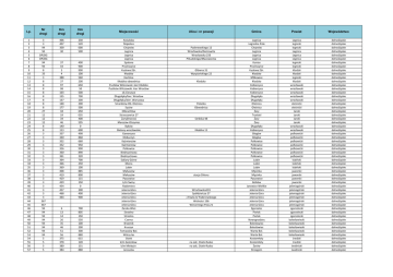 Lp. Nr drogi Km drogi Hm drogi 1 2 3 4 5 6 7 8 9 10 11 12 13 14 15 16 17 18 19 20 21 22 23 24 25 26 27 28 29 30 31 32 33 34 35 36 37 38 39 40 41 42 43 44 45 46 47 48 49 50 51 52 53 54 55 56 57 3 3 94 94 DP/DG DP/DG 94 94 8 33 3 8 8 8 8 8 8 8 8 27 12 12 12 8 8 3 3 3 3 3 3 3 3 3 3 3 3 3 3 3 3 3 3 367 367 94 94 94 94 94 94 94 94 5 5 5 5 406 407 300 30 230 520 000 500 37 43 3 4 388 37 97 98 103 135 137 148 177 18 19 34 46 140 113 337 340 352 352 356 360 361 364 366 369 408 410 419 429 454 457 468 464 400 900 900 100 560 200 650 50 500 700 200 200 500 650 035 400 595 0 600 498 868 660 950 990 890 320 700 250 100 885 800 115 150 0 300 400 900 6 13 14 26 35 46 51 56 375 378 380 384 700 805 150 550 100 200 300 880 615 128 131 880 Miejscowość Koiszków Mąkolice Chojnów Legnica Legnica Legnica Spalona Prochowice Kudowa Zdr. Kłodzko Kochlice Kłodzko obwodnica Pustków Wilczowski .kier Kłodzko Pustków Wilczowski. kier Wrocław ok.Cieszyce Długołęka/kier. Wrocław Długołęka/kier. Warszawa Smardzów Ob. Oleśnica Syców Olbrachtów Strzeszowice 27 Żary(Krosno) Marszów-Olszyniec Byków Bielany wrocławskie Gaworzyce Kłobuczyn Kaźmierzów Kaźmierzów Polkowice Biedrzychowa Biedrzychowa Szklary Górne Obora Lubin Małuszów Małuszów Paszowice k/m Świny Radomierz Jelenia Góra Jelenia Góra Jelenia Góra Jelenia Góra Jelenia Góra Żarska Wieś Strzelno Strzelno Czerna Brzeźnik Kruszyn Tomaszów Bol. Wilczy las Osiek k/m Gościsław k/m Mielęcin Jaroszów Ulica i nr posesji Paderewskiego 12 Wrocławska/Ziemowita Wrocławska 233 Piłsudskiego/Mazowiecka Główna 31 Wyspiańskiego 22 Kłodzko Polanka Obwodnica Serbska 48 Kłodzka 11 stacja Orlenu Wrocławska101 Spółdzielcza 27 J.Pawła II/ Paderewskiego Wolności 196 Wincentego Pola 21 na odc. Osiek-Rusko na odc. Osiek-Rusko Gmina Powiat Województwo Legnica Legnickie Pole Chojnów Legnica Legnica Legnica Kunice Prochowice Kudowa Zdr. Kłodzko Miłkowice Kłodzko Kobierzyce Kobierzyce Kobierzyce Długołęka Długołęka Oleśnica Oleśnica Żary Trzebiel Żary Żary Długołęka Kobierzyce Głogów Głogów Polkowice Polkowice Polkowice Polkowice Polkowice Lubin Lubin Lubin Męcinka Męcinka Paszowice Bolków Janowice Wielkie Jelenia Góra Jelenia Góra Jelenia Góra Jelenia Góra Jelenia Góra Zgorzelec Pieńsk Pieńsk Nowogrodziec Bolesławiec Bolesławiec Warta Bol. Warta Bol. Kostomłoty Kostomłoty Żarów Strzegom Legnica legnicki legnicki Legnica Legnica Legnica legnicki legnicki kłodzki kłodzki legnicki kłodzki wrocławski wrocławski wrocławski wrocławski wrocławski oleśnicki oleśnicki żarski żarski żarski żarski wrocławski wrocławski polkowicki polkowicki polkowicki polkowicki polkowicki polkowicki polkowicki lubiński lubiński lubiński jaworski jaworski jaworski jaworski jeleniogórski jeleniogórski jeleniogórski jeleniogórski jeleniogórski jeleniogórski zgorzelecki zgorzelecki zgorzelecki bolesławiecki bolesławiecki bolesławiecki bolesławiecki bolesławiecki średzki średzki świdnicki świdnicki dolnośląskie dolnośląskie dolnośląskie dolnośląskie dolnośląskie dolnośląskie dolnośląskie dolnośląskie dolnośląskie dolnośląskie dolnośląskie dolnośląskie dolnośląskie dolnośląskie dolnośląskie dolnośląskie dolnośląskie dolnośląskie dolnośląskie dolnośląskie dolnośląskie dolnośląskie dolnośląskie dolnośląskie dolnośląskie dolnośląskie dolnośląskie dolnośląskie dolnośląskie dolnośląskie dolnośląskie dolnośląskie dolnośląskie dolnośląskie dolnośląskie dolnośląskie dolnośląskie dolnośląskie dolnośląskie dolnośląskie dolnośląskie dolnośląskie dolnośląskie dolnośląskie dolnośląskie dolnośląskie dolnośląskie dolnośląskie dolnośląskie dolnośląskie dolnośląskie dolnośląskie dolnośląskie dolnośląskie dolnośląskie dolnośląskie dolnośląskie 58 59 60 61 62 63 64 65 66 67 68 69 70 71 72 73 74 75 76 77 78 79 80 81 82 83 84 85 86 87 88 89 90 91 92 93 94 95 96 97 98 99 100 101 102 103 104 105 106 107 108 109 110 111 112 113 114 115 116 117 5 5 5 5 5 8 8 8 8 8 8 12 12 12 12 12 8 12 12 12 3 DG 25 223 80 DG 10 DG 80 80 80 91 1 62 55 15 DG DG 15 1 1 1 1 1 10 15 10 91 91 5 5 91 16 16 10 10 5 5 5 5 385 388 394 396 408 54 59 66 72 80 89 100 105 125 126 131 43 125 131 100 387 689 338 566 346 159 980 350 660 525 100 406 600 800 50 000 716 990 50 716 600 600 279 300 79 90 200 400 215 146 148 157 205 218 240 172 369 108 117 17 94 129 16 14 299 302 49 64 68 81 200 610 800 300 900 800 350 290 700 0 70 110 720 50 886 470 689 202 500 685 200 322 Jaroszów k/m Strzegom Strzegom m.Sławiska Granica Sady Dolne Braszowice Ząbkowice Śl. Szklary Nowa Wieś Niemczańska Wilków Wielki Mleczna Buczyna Radwanice Serby Serby Wilków Dębowina Serby Wilków Buczyna Kochlice Bydgoszcz Bydgoszcz Bydgoszcz Bydgoszcz Bydgoszcz Solec Kujawski Toruń Toruń Toruń Toruń Toruń Włocławek Modzerowo Świerkocin Inowrocław Inowrocław Janikowo Gniewkowo Chełmno Grubno Jeleniec Otłoczyn Brudnowo Trzeciewnica Kwieciszewo Skępe Bzowo Górna Grupa Niewieścin Żnin Wiąg Kłódka Kłódka Dybowo Cierpice Stryszek Zamość Szkocja Wąsosz x z DW 345 Główna 50 Główna /Cicha Głogowska 3 Główna 50 Głogowska 3 Nakielska 297 Grunwaldzka 137 Szubińska 107 Fordońska 412 Wojska Polskiego 6 Leśna Bydgoska 82 ul. Szosa Lubicka, na wys. Łyskowskiego 1 Lubicka 37 Przy Kaszowniku 7 ul. Grudziądzka 96-102 ul. Toruńska 108 Poznańska 308 Niepodległości 7 Przemysłowa na wys. bud. Wilkońskiego 10-12 Inowrocławska Łunawska Powstańców Wlp. Szpitalna 51 Strzegom Strzegom Strzegom Strzegom Bolków Ząbkowice Śl. Ząbkowice Śl. Ząbkowice Śl. Niemcza Niemcza Jordanów Śl. Radwanice Radwanice Głogów Głogów Kotla Ząbkowice Śl. Głogów Kotla Radwanice Legnica Bydgoszcz Bydgoszcz Bydgoszcz Bydgoszcz Bydgoszcz Solec Kujawski Toruń Toruń Toruń Toruń Toruń Włocławek Włocławek Grudziądz Inowrocław Inowrocław Janikowo Gn