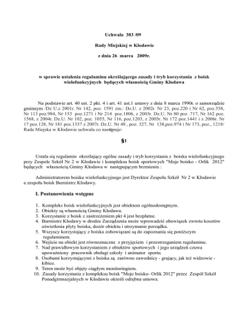Uchwała 303 /09 Rady Miejskiej w Kłodawie z dnia 26 marca 2009r. w sprawie ustalenia regulaminu określającego zasady i tryb korzystania z boisk wielofunkcyjnych będących własnością Gminy Kłodawa Na podstawie art. 40 ust. 2 pkt. 4 i art. 41 ust.1 ustawy z dnia 8 marca 1990r. o samorządzie gminnym /Dz U.z 2001r. Nr 142, poz. 1591 zm.: Dz.U. z 2002r. Nr 23, poz.220 i Nr 62, poz.558, Nr 113 poz.984, Nr 153 poz.1271 i Nr 214 poz.1806, z 2003r. Dz.U. Nr 80 poz .717, Nr 162 poz. 1568, z 2004r. Dz.U. Nr 102, poz. 1055, Nr 116, poz.1203, z 2005r. Nr 172 poz.1441 i z 2006r. Nr 17 poz.128, Nr 181 poz.1337 z 2007r. Dz.U. Nr 48 , poz. 327, Nr 138,poz.974 i Nr 173, poz., 1218/ Rada Miejska w Kłodawie uchwala co następuje: §1 Ustala się regulamin określający ogólne zasady i tryb korzystania z boiska wielofunkcyjnego przy Zespole Szkół Nr 2 w Kłodawie i kompleksu boisk sportowych "Moje boisko - Orlik 2012" będących własnością Gminy Kłodawa w następującym brzmieniu : Administratorem boiska wielofunkcyjnego jest Dyrektor Zespołu Szkół Nr 2 w Kłodawie a zespołu boisk Burmistrz Kłodawy. I. Postanowienia wstępne 1. Kompleks boisk wielofunkcyjnych jest obiektem ogólnodostępnym. 2. Obiekty są własnością Gminy Kłodawa. 3. Korzystanie z boisk z zastrzeżeniem pkt 4 jest bezpłatne. 4. Burmistrz Kłodawy w drodze Zarządzenia może wprowadzić obowiązek zwrotu kosztów oświetlenia płyty boiska, dozór obiektu i utrzymanie porządku. 5. Wszyscy korzystający z boiska zobowiązani są do zapoznania się poniższym regulaminem. 6. Wejście na obiekt jest równoznaczne z przyjęciem i przestrzeganiem regulaminu. 7. Nad prawidłowym korzystaniem z obiektów sportowych i jego urządzeń czuwa upoważniony pracownik obsługi szkoły i animator sportu. 8. Osobami korzystającymi z boiska są zarówno zawodnicy - grający, jak też widzowie kibice. 9. Teren może być objęty ciągłym monitoringiem. 10. Zasady korzystania z kompleksu boisk "Moje boisko- Orlik 2012" przez Zespół Szkół Ponadgimnazjalnych w Kłodawie określi odrębna umowa. II. Harmonogram korzystania z obiektów i jego urządzeń 1. Kompleks boisk jest otwarty cały tydzień /ramowe godziny otwarcia obiektu: 8.00-22.00/ Harmonogram ustala dyrekcja Zespołu Szkół Nr 2 w Kłodawie i Zespołu Szkół Ponadgimnazjalnych w Kłodawie w porozumieniu z animatorem sportu. 2. W okresie wakacyjnym obowiązuje odrębny harmonogram korzystania z obiektu. 3. Uczniowie wymienionych szkół w pkt 1 korzystają z boisk podczas zajęć w godzinach pracy szkoły. 4. Grupy zorganizowane i pozostali chętni korzystają z boiska poza godzinami pracy szkoły. 5. Istnieje możliwość wcześniejszej rezerwacji obiektów dla grup zorganizowanych u administratora obiektu. 6. Administrator obiektu zastrzega sobie prawo do odwołania zaplanowanych wcześniej zajęć na obiekcie w celu przeprowadzenia imprez sportowo- rekreacyjnych , widowiskowych lub innych po uprzednim uzgodnieniu z zainteresowanymi. 7. Kluby sportowe działające na terenie gminy Kłodawa mogą nieodpłatnie korzystać z boiska po uprzednim zapisaniu się u instruktora sportu. 8. Osoby przebywające na boiskach mogą korzystać z pomieszczeń socjalnych. III. Zakres odpowiedzialności 1. Za uczniów korzystających z obiektów podczas zajęć edukacyjnych odpowiada prowadzący zajęcia. 2. Za osoby nieletnie korzystające z obiektów poza godzinami pracy szkoły odpowiadają rodzice lub opiekunowie. 3. Osoby dorosłe korzystają z obiektów na własną odpowiedzialność. 4. Za wypadki zaistniałe z powodu nieprzestrzegania regulaminu administrator nie ponosi odpowiedzialności. 5. Administrator oraz pracownicy szkoły nie ponoszą odpowiedzialności za rzeczy pozostawione na terenie boiska. 6. Za szkody materialne powstałe na skutek nieprawidłowego korzystania z boiska i znajdujących się na nim urządzeń odpowiadają korzystający a w przypadku osób niepełnoletnich ich rodzice lub opiekunowie. IV. Na terenie obiektów zabrania się 1. Używania butów piłkarskich na wysokich i metalowych korkach oraz kolców. 2. Niszczenia urządzeń sportowych i płyty boiska . 3. Wchodzenia na ogrodzenie i urządzenia sportowe. 4. Palenia tytoniu, spożywania posiłków oraz żucia gumy. 5. Spożywania, wnoszenia i przebywania pod wpływem alkoholu. 6. Zaśmiecania,wnoszenia napojów w szklanych opakowaniach. 7. Przeszkadzania w zajęciach lub grze. 8. Zakłócania porządku i używania wulgarnych słów. 9. Przebywania na terenie osobom poniżej 15 roku życia po zmroku, z wyjątkiem zorganizowanych grup sportowych. 10. Wprowadzania zwierząt. 11. Korzystania z boisk bez zgody pracownika obsługi Zespołu Szkół nr 2 lub animatora. 12. Wprowadzania i użytkowania sprzętu niezgodnego z przeznaczeniem boisk np. rower, motorower,deskorolka, rolki, itp. 13. Przebywania i korzystania z obiektów poza godzinami otwarcia. V. Korzystających z obiektu zobowiązuje się do 1. Niezwłocznego zgłoszenia pracownikowi obsługi szkoły lub animatorowi sportu uszkodzeń ujawnionych po poprzednich użytkownikach. 2. Niezwłocznego zgłoszenia pracownikowi obsługi szkoły lub animatorowi sportu uszkodzeń spowodowanych przez swoją grupę. 3. Zachowanie porządku i czystości oraz zachowania się w sposób kulturalny. VI. Postanowienia końcowe 1. Osoby korzystające z obiektów i nieprzestrzegające niniejszego regulaminu ponoszą odpowiedzialność na podstawie obowiązujących przepisów prawa. 2. Administrator ma prawo do odwołania zajęć ze względu na złe warunki atmosferyczne, techniczne lub z innych przyczyn. 3. Administrator ma prawo interpretacji spraw objętych regulaminem w sytuacjach spornych. 4. Administrator określi szczegółowe przepisy dotyczące korzystania z obiektów. §2 Wykonanie uchwały powierza się Burmistrzowi Kłodawy. §3 Uchwała wchodzi w życie po upływie 14 dni od dnia ogłoszenia w Dzienniku Urzędowym Województwa Wielkopolskiego. Przewodni