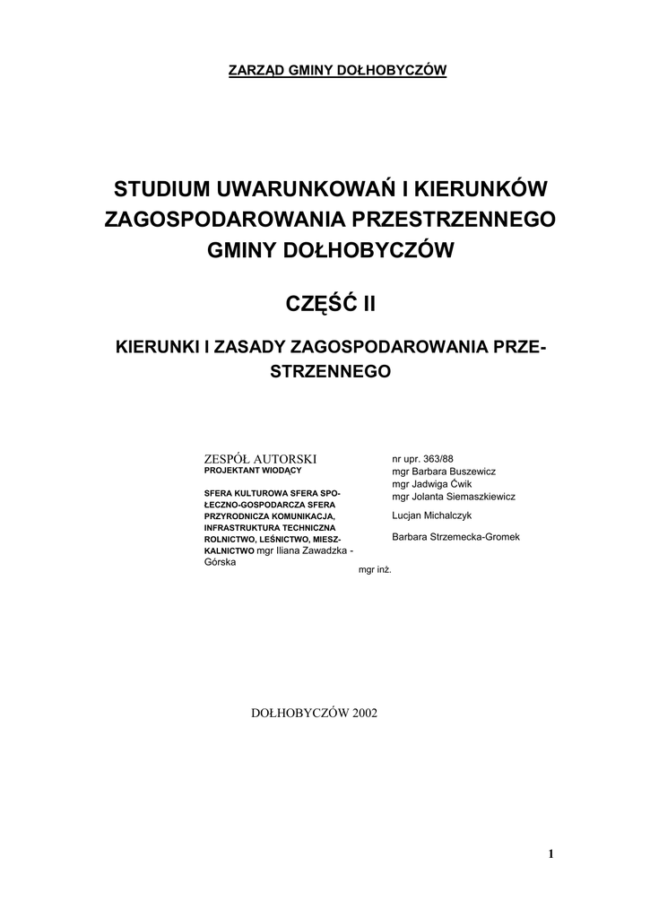 ZARZĄD GMINY DOŁHOBYCZÓW STUDIUM UWARUNKOWAŃ I KIERUNKÓW ZAGOSPODAROWANIA PRZESTRZENNEGO GMINY DOŁHOBYCZÓW CZĘŚĆ II KIERUNKI I ZASADY ZAGOSPODAROWANIA PRZESTRZENNEGO ZESPÓŁ AUTORSKI nr upr. 363/88 mgr Barbara Buszewicz mgr Jadwiga Ćwik mgr Jolanta Siemaszkiewicz PROJEKTANT WIODĄCY SFERA KULTUROWA SFERA SPOŁECZNO-GOSPODARCZA SFERA PRZYRODNICZA KOMUNIKACJA, INFRASTRUKTURA TECHNICZNA ROLNICTWO, LEŚNICTWO, MIESZKALNICTWO mgr Iliana Zawadzka - Górska Lucjan Michalczyk Barbara Strzemecka-Gromek mgr inż. DOŁHOBYCZÓW 2002 1 WÓJT GMINY DOŁHOBYCZÓW Załącznik Nr do Uchwały Nr Rady Gminy Dołhobyczów z dnia STUDIUM UWARUNKOWAŃ I KIERUNKÓW ZAGOSPODAROWANIA PRZESTRZENNEGO GMINY DOLHOBYCZÓW ZMIANA STUDIUM KIERUNKI ZAGOSPODAROWANIA PRZESTRZENNEGO Autor opracowania: Projektant M.P.Z.P. mgr inż. Piotr Rabiega ul. T. Zamojskiego 2/3 22-600 Tomaszów Lubelski tel. 505 790 092 Zmiana studium została wyróżniona w tekście studium czcionką koloru czerwonego, a na rysunku studium oznaczeniami wyróżnionymi w legendzie. Dołhobyczów 2015/2016r. 2 SPIS TREŚCI USTALENIA OGÓLNE ..................................................................................................................................................................... 4 1. 1.1. WSTĘP............................................................................................................................................................................................................................................ 4 1.2. CELE ROZWOJOWE GMINY ............................................................................................................................................................................................................. 4 1.3. INNE USTALENIA ....................................................................................................................................................................................................................... 4 1.4. PROBLEMY ROZWOJOWE ........................................................................................................................................................................................................ 5 1.5. PODSTAWA PRAWNA OPRACOWANIA .................................................................................................................................................................................. 6 POLITYKA OSIĄGANIA CELÓW ROZWOJU GMINY ............................................................................................................. 7 2. 2.1. KIERUNKI I ZASADY OCHRONY WARTOŚCI I ZASOBÓW ŚRODOWISKA PRZYRODNICZEGO .............................................................................................................. 7 2.2. KIERUNKI I ZASADY OCHRONY DÓBR KULTURY .......................................................................................................................................................................... 11 2.3. PROGNOZY DEMOGRAFICZNE ORAZ POLITYKA ZATRUDNIENIA I ZMNIEJSZANIA BEZROBOCIA .................................................................................................... 15 KIERUNKI I ZASADY ROZWOJU INFRASTRUKTURY SPOŁECZNEJ I MIESZKALNICTWA ................................................................................................................... 17 2.4. 2.4.1. Usługi publiczne...............................................................................................................................................................17 2.4.2. Kierunki rozwoju usług komercyjnych ..............................................................................................................................19 2.4.3. Mieszkalnictwo .................................................................................................................................................................20 2.5. KIERUNKI I ZASADY ROZWOJU PRZEDSIĘBIORCZOŚCI I DROBNEJ WYTWÓRCZOŚCI ..................................................................................................................... 20 2.6. ROZWÓJ ROLNICTWA ORAZ KIERUNKI ROZWOJU LEŚNICTWA ................................................................................................................................... 21 2.6.1. Kierunki i zasady rozwoju rolnictwa i jego otoczenia .......................................................................................................21 2.6.2. Kierunki i zasady rozwoju rolnictwa .................................................................................................................................23 2.7. KIERUNKI ROZWOJU FUNKCJI REKREACJI .................................................................................................................................................................................... 24 2.8. KIERUNKI I ZASADY ROZWOJU KOMUNIKACJI ............................................................................................................................................................................. 26 2.9. KIERUNKI ROZWOJU INFRASTRUKTURY TECHNICZNEJ ................................................................................................................................................................ 27 2.9.1. Zaopatrzenie w wodę ........................................................................................................................................................27 2.9.2. Odprowadzanie i oczyszczanie ścieków ............................................................................................................................28 2.9.3. Gospodarka odpadami stałymi .........................................................................................................................................29 2.9.4. Elektroenergetyka .............................................................................................................................