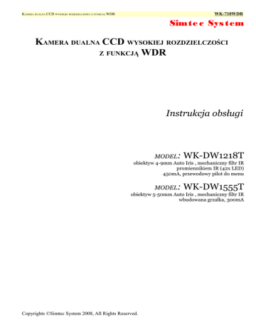 WK-710WDR KAMERA DUALNA CCD WYSOKIEJ ROZDZIELCZOŚCI Z FUNKCJĄ WDR Simte c Sys tem KAMERA DUALNA CCD WYSOKIEJ ROZDZIELCZOŚCI Z FUNKCJĄ WDR Instrukcja obsługi MODEL: WK-DW1218T obiektyw 4-9mm Auto Iris , mechaniczny filtr IR promiennikiem IR (42x LED) 450mA, przewodowy pilot do menu MODEL: WK-DW1555T obiektyw 5-50mm Auto Iris , mechaniczny filtr IR wbudowana grzałka, 300mA Copyrights ©Simtec System 2008, All Rights Reserved. KAMERA DUALNA CCD WYSOKIEJ ROZDZIELCZOŚCI Z FUNKCJĄ WDR WK-710WDR WSKAZÓWKI OGÓLNE I ŚRODKI OSTROŻNOŚCI Jak obchodzić się z kamerą - Należy unikać wstrząsów, uderzeń, itp. Kamera może ulec uszkodzeniu poprzez nieprawidłowe obchodzenie się z nią lub nieprawidłowe przechowywanie. Bezpieczeństwo elektryczne - By uniknąć porażenia prądem, nie należy usuwać osłon i śrub. W kamerze nie ma części możliwych do naprawienia przez użytkownika. W razie awarii, należy się kontaktować z wyspecjalizowanymi serwisami. Wymagania środowiskowe - Nie wolno korzystać z kamery ani przechowywać jej w miejscach bardzo gorących i bardzo zimnych, wilgotnych i nadmiernie suchych oraz w pobliżu źródeł silnych pól magnetycznych lub promieniowania elektromagnetycznego takich jak odbiorniki radiowe lub przekaźniki telewizyjne. Czyszczenie - Do czyszczenia produktu należy używać delikatnych suchych materiałów, a w przypadku poważnych zabrudzeń używać delikatnych środków. Nie należy dotykać powierzchni przetwornika obrazu lub soczewek. Po przypadkowym dotknięciu do wyczyszczenia powierzchni należy użyć miękkiej szmatki nasączonej alkoholem. Zamontowanie kamery - Nigdy nie kierować kamery w kierunku słońca lub bardzo jasnych obiektów, nawet gdy kamera jest wyłączona. Nie wolno korzystać z kamery ani przechowywać jej w pobliżu lamp fluorescencyjnych lub obiektów odbijających światło oraz niestałych lub migoczących źródłach światła. Transport - Kamera powinna być zabezpieczona przed naciskiem, wibracjami oraz wilgocią podczas transportu i przechowywania. Powinna być transportowana w częściach, w oryginalnym opakowaniu. Uszkodzenia spowodowane nieprawidłowym transportem nie są objęte gwarancją. Instalacja - Kamerę należy zainstalować w przewidzianym dla niej położeniu. Nie należy narażać części kamery na uszkodzenie mechaniczne. Wszelkie czynności serwisowe powinny być wykonane przez wykwalifikowaną osobę. Nie należy samodzielnie rozkręcać obudowę kamery, wewnątrz nie ma żadnych części które można samodzielnie naprawić. Wszystkie naprawy powinny zostać wykonane przez wykwalifikowany serwis. ➢ ➢ ➢ ➢ ➢ ➢ ➢ Przed podłączeniem kamery należy uważnie przeczytać tę instrukcję, by uniknąć uszkodzeń spowodowanych nieprawidłowym montażem lub użytkowaniem. Kamera może pracować wyłącznie przy określonym napięciu zasilania. Należy przestrzegać instrukcji dotyczących bezpieczeństwa umieszczonych na kamerze. Jeśli do wnętrza obudowy dostanie się ciecz lub ciało obce, należy odłączyć kamerę od źródła zasilania i zlecić jej sprawdzenie przez autoryzowanego przedstawiciela handlowego przed ponownym użyciem. Jeśli z urządzenia zacznie się wydobywać jakikolwiek nienormalny zapach lub dym, należy przestać użytkować produkt. W takiej sytuacji należy natychmiast odłączyć źródło zasilania i skontaktować się z serwisem. (Dalsze użytkowanie urządzenia może doprowadzić do pożaru lub porażenia prądem). Urządzenie to zostało przetestowane i jest zgodne z ograniczeniami dotyczącymi urządzenie cyfrowych klasy B. Ograniczenia te służą zapewnieniu właściwej ochrony przed szkodliwymi zakłóceniami w instalacjach mieszkalnych. To urządzenie może generować, wykorzystywać i emitować energię o częstotliwości radiowej. Jeśli nie zostanie zamontowane i nie będzie używane zgodnie z instrukcjami, może powodować szkodliwe zakłócenia łączności radiowej. Kompatybilność elektromagnetyczna (EMC) Urządzenie jest przeznaczone do zastosowań ogólnych w systemach telewizji przemysłowej (CCTV) w środowiskach mieszkalnych, komercyjnych lub przemysłowych. Aby zapewnić prawidłowe działanie i uniknąć problemów dotyczących zakłóceń elektromagnetycznych, uradzenie należy zamontować zgodnie z aktualnie obowiązującymi instrukcjami montażu dotyczącymi kompatybilności elektromagnetycznej. Urządzenia spełniają wymagania zawarte w dyrektywach oraz przepisach krajowych wprowadzających dyrektywy: • Kompatybilność elektromagnetyczna EMC 89/336/EEC ze zmianami • Niskonapięciowa LVD 73/23/EEC ze zmianą, w przypadku sprzętu elektrycznego przeznaczonego do użytkowania przy napięciu nominalnym od 50VAC do 1000VAC oraz od 75VDC do 1500VDC. Niniejsze urządzenie zostało oznakowane zgodnie z Dyrektywą WEEE (2002/96/EC), dotyczącą zużytego sprzętu elektrycznego i elektronicznego. Zapewniając prawidłowe złomowanie przyczyniają się Państwo do ograniczenia ryzyka wystąpienia negatywnego wpływu produktu na środowisko i zdrowie ludzi, które mogłoby zaistnieć w przypadku niewłaściwej utylizacji urządzenia. Symbol umieszczony na produkcie lub dołączonych do niego dokumentach oznacza, że niniejszy produkt nie jest klasyfikowany jako odpad z gospodarstwa domowego. Urządzenie należy oddać do odpowiedniego punktu utylizacji odpadów w celu recyklingu. Aby uzyskać dodatkowe informacje dotyczące recyklingu niniejszego produktu należy skontaktować się z przedstawicielem władz lokalnych, dostawcą usług utylizacji odpadów lub sklepem, gdzie nabyto produkt. KAMERA DUALNA CCD WYSOKIEJ ROZDZIELCZOŚCI Z FUNKCJĄ WDR WK-710WDR INFORMACJE OGÓLNE WDR (Wide Dynamic Range) Kamera z funkcją WDR jest pomocna w obszarach o bardzo różnych poziomach oświetlenia. Szeroki zakres dynamiki pozwala na realistyczne odwzorowanie zarówno ciemnych jak i jasnych obszarów w monitorowanym obszarze 560TV Lines Ujed
