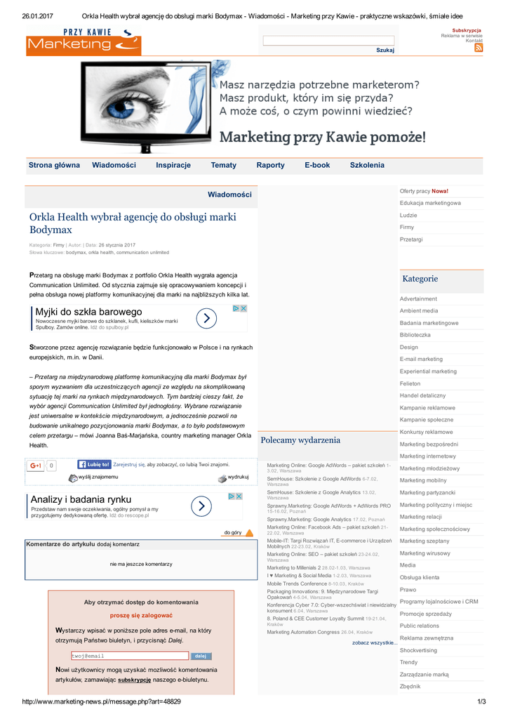 26.01.2017 Orkla Health wybrał agencję do obsługi marki Bodymax Wiadomości Marketing przy Kawie praktyczne wskazówki, śmiałe idee Subskrypcja Reklama w serwisie Kontakt Szukaj Strona główna Wiadomości Inspiracje Tematy Raporty Ebook Szkolenia Oferty pracy Nowa! Wiadomości Edukacja marketingowa Orkla Health wybrał agencję do obsługi marki Bodymax Ludzie Firmy Przetargi Kategoria: Firmy | Autor: | Data: 26 stycznia 2017 Słowa kluczowe: bodymax, orkla health, communication unlimited Przetarg na obsługę marki Bodymax z portfolio Orkla Health wygrała agencja Kategorie Communication Unlimited. Od stycznia zajmuje się opracowywaniem koncepcji i pełna obsługa nowej platformy komunikacyjnej dla marki na najbliższych kilka lat. Advertainment Myjki do szkła barowego Ambient media Nowoczesne myjki barowe do szklanek, kufli, kieliszków marki Spulboy. Zamów online. Idź do spulboy.pl Badania marketingowe Biblioteczka Stworzone przez agencję rozwiązanie będzie funkcjonowało w Polsce i na rynkach Design europejskich, m.in. w Danii. Email marketing Experiential marketing – Przetarg na międzynarodową platformę komunikacyjną dla marki Bodymax był Felieton sporym wyzwaniem dla uczestniczących agencji ze względu na skomplikowaną sytuację tej marki na rynkach międzynarodowych. Tym bardziej cieszy fakt, że Handel detaliczny wybór agencji Communication Unlimited był jednogłośny. Wybrane rozwiązanie Kampanie reklamowe jest uniwersalne w kontekście międzynarodowym, a jednocześnie pozwoli na budowanie unikalnego pozycjonowania marki Bodymax, a to było podstawowym Kampanie społeczne celem przetargu – mówi Joanna BaśMarjańska, country marketing manager Orkla Konkursy reklamowe Polecamy wydarzenia Health. Marketing bezpośredni Marketing internetowy 0 Lubię to! Zarejestruj się, aby zobaczyć, co lubią Twoi znajomi. wyślij znajomemu Marketing Online: Google AdWords – pakiet szkoleń 1 wydrukuj 3.02, Warszawa Marketing młodzieżowy SemHouse: Szkolenie z Google AdWords 67.02, Marketing mobilny Warszawa SemHouse: Szkolenie z Google Analytics 13.02, Analizy i badania rynku Warszawa Sprawny.Marketing: Google AdWords + AdWords PRO Przedstaw nam swoje oczekiwania, ogólny pomysł a my przygotujemy dedykowaną ofertę. Idź do rescope.pl 1516.02, Poznań do góry Marketing relacji Marketing Online: Facebook Ads – pakiet szkoleń 21 Marketing społecznościowy MobileIT: Targi Rozwiązań IT, Ecommerce i Urządzeń Mobilnych 2223.02, Kraków Marketing szeptany Marketing Online: SEO – pakiet szkoleń 2324.02, Marketing wirusowy Warszawa nie ma jeszcze komentarzy Marketing to Millenials 2 28.021.03, Warszawa Media I ♥ Marketing & Social Media 12.03, Warszawa Obsługa klienta Mobile Trends Conference 810.03, Kraków Packaging Innovations: 9. Międzynarodowe Targi Opakowań 45.04, Warszawa Aby otrzymać dostęp do komentowania Konferencja Cyber 7.0: Cyberwszechświat i niewidzialny konsument 6.04, Warszawa proszę się zalogować 8. Poland & CEE Customer Loyalty Summit 1921.04, Kraków Wystarczy wpisać w poniższe pole adres email, na który twoj@email Prawo Programy lojalnościowe i CRM Promocje sprzedaży Public relations Marketing Automation Congress 26.04, Kraków otrzymują Państwo biuletyn, i przycisnąć Dalej. Marketing polityczny i miejsc Sprawny.Marketing: Google Analytics 17.02, Poznań 22.02, Warszawa Komentarze do artykułu dodaj komentarz Marketing partyzancki zobacz wszystkie... Reklama zewnętrzna Shockvertising dalej Nowi użytkownicy mogą uzyskać mozliwość komentowania artykułów, zamawiając subskrypcję naszego ebiuletynu. Trendy Zarządzanie marką Zbędnik http://www.marketingnews.pl/message.php?art=48829 1/3