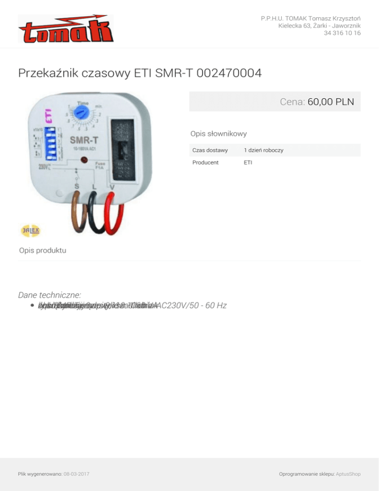 P.P.H.U. TOMAK Tomasz Krzysztoń Kielecka 63, Żarki - Jaworznik 34 316 10 16 Przekaźnik czasowy ETI SMR-T 002470004 Cena: 60,00 PLN Opis słownikowy Czas dostawy 1 dzień roboczy Producent ETI Opis produktu Dane techniczne: typ: SMR-T znamionowe zakresy ilość obciążenie ifunkcji: rodzaje czasowe: prądowe: 9napięcie zestyków: 0,1s 10 zasilania: - 10 -1160 xdni triak VAAC230V/50 - 60 Hz Plik wygenerowano: 08-03-2017 Powered by TCPDF (www.tcpdf.org) Oprogramowanie sklepu: AptusShop