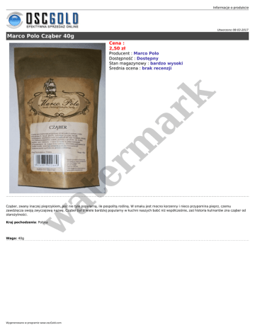 Informacje o produkcie Utworzono 08-03-2017 Marco Polo Cząber 40g Cena : 2,50 zł at er m ar k Producent : Marco Polo Dostępność : Dostępny Stan magazynowy : bardzo wysoki Średnia ocena : brak recenzji w Cząber, zwany inaczej pieprzykiem, jest nie tyle popularną, ile pospolitą rośliną. W smaku jest mocno korzenny i nieco przypomina pieprz, czemu zawdzięcza swoją zwyczajową nazwę. Cząber był o wiele bardziej popularny w kuchni naszych babć niż współcześnie, zaś historia kulinariów zna cząber od starożytności. Kraj pochodzenia: Polska Waga: 40g Wygenerowano w programie www.oscGold.com