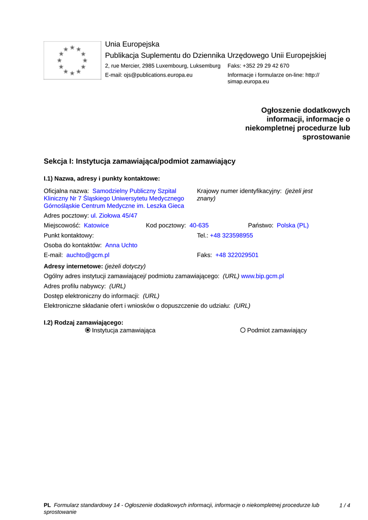 Unia Europejska Publikacja Suplementu do Dziennika Urzędowego Unii Europejskiej 2, rue Mercier, 2985 Luxembourg, Luksemburg Faks: +352 29 29 42 670 E-mail: [email protected] Informacje i formularze on-line: http:// simap.europa.eu Ogłoszenie dodatkowych informacji, informacje o niekompletnej procedurze lub sprostowanie Sekcja I: Instytucja zamawiająca/podmiot zamawiający I.1) Nazwa, adresy i punkty kontaktowe: Oficjalna nazwa: Samodzielny Publiczny Szpital Kliniczny Nr 7 Śląskiego Uniwersytetu Medycznego Górnośląskie Centrum Medyczne im. Leszka Gieca Krajowy numer identyfikacyjny: (jeżeli jest znany) _____ Adres pocztowy: ul. Ziołowa 45/47 Miejscowość: Katowice Kod pocztowy: 40-635 Punkt kontaktowy: _____ Państwo: Polska (PL) Tel.: +48 323598955 Osoba do kontaktów: Anna Uchto E-mail: [email protected] Faks: +48 322029501 Adresy internetowe: (jeżeli dotyczy) Ogólny adres instytucji zamawiającej/ podmiotu zamawiającego: (URL) www.bip.gcm.pl Adres profilu nabywcy: (URL) _____ Dostęp elektroniczny do informacji: (URL) _____ Elektroniczne składanie ofert i wniosków o dopuszczenie do udziału: (URL) _____ I.2) Rodzaj zamawiającego: Instytucja zamawiająca Podmiot zamawiający PL Formularz standardowy 14 - Ogłoszenie dodatkowych informacji, informacje o niekompletnej procedurze lub sprostowanie 1/4 Sekcja II: Przedmiot zamówienia II.1.1) Nazwa nadana zamówieniu: Dostawa wyposażenia medycznego II.1.2) Krótki opis zamówienia lub zakupu: (podano w pierwotnym ogłoszeniu) Dostawa wyposażenia medycznego Zad. 1 - Materac grzewczy Zad. 2 - Ssak elektryczny Zad. 3 - Aparat EKG 12-kanałowy Zad. 4 - Aparat do oznaczania ACT Zad. 5 - Defibrylator Zad. 6 - Kardiostymulator serca zewnętrzny dwujamowy Zad. 7 - Pompa infuzyjna dwustrzykawkowa Zad. 8 - Rejestrator Holterowski wraz z kartami pamięci Zad. 9 - Urządzenie do monitorowania ciśnienia wewnątrzczaszkowego, czujnik pomiarowy ICP Zad. 10 - Urządzenie do aktywnej regulacji temperatury pacjenta Zad. 11 - Wózek opatrunkowy, wózek anestetyczny Zad. 12 - Video-laryngoskop z zapasowym wziernikiem Szczegółowy opis przedmiotu zamówienia zawierają Załącznik 2b i 4 do SIWZ. 3.2. Wymagania Zamawiającego dotyczące przedmiotu zamówienia: 1) oferowany wyrób medyczny musi posiadać atesty, certyfikaty i być zarejestrowany zgodnie z przepisami prawa wymagającymi posiadania atestów, certyfikatów oraz rejestracji, 2) oferowany wyrób medyczny musi być wprowadzony do obrotu i używania zgodnie z wymaganiami ustawy z dnia 20 maja 2010 r. o wyrobach medycznych ( Dz. U. Nr 107, poz. 679 oraz z 2011 r. Nr 102, poz. 586), 3) oferowany wyrób medyczny musi odpowiadać normom lub specyfikacjom technicznym obowiązującym dla tego wyrobu; W przypadku, gdyby oferowany wyrób medyczny nie wymagał zgłoszenia do Prezesa Urzędu Rejestracji Produktów Leczniczych, Wyrobów Medycznych i Produktów Biobójczych Wykonawca zobowiązany jest do wykonania na własny koszt i we własnym zakresie wszelkich czynności niezbędnych do wypełnienia wszystkich wymogów prawa związanych z wprowadzeniem wyrobu do obrotu i używania na terenie Rzeczypospolitej Polskiej. Wykonawca zobowiązany jest wykonać takie czynności w terminach wynikających z obowiązujących przepisów oraz dostarczyć Zamawiającemu w tych terminach stosowne dokumenty potwierdzające wykonanie takich czynności. 3.3. W celu potwierdzenia, że oferowane dostawy odpowiadają wymaganiom określonym przez Zamawiającego Wykonawca jest zobowiązany złożyć wraz z ofertą: 1 Opis przedmiotu zamówienia sporządzony wg wzoru stanowiącego Załącznik 4 do SIWZ w odniesieniu do każdego zadania. - w formie oryginału lub kopii poświadczonej za zgodność z oryginałem przez Wykonawcę; W przypadku Wykonawców wspólnie ubiegających się o udzielenie zamówienia, o których mowa w art. 23 Pzp, dokumenty te składa pełnomocnik tych Wykonawców; II.1.3) Wspólny Słownik Zamówień (CPV) Główny przedmiot Słownik główny 33190000 Słownik uzupełniający (jeżeli dotyczy) PL Formularz standardowy 14 - Ogłoszenie dodatkowych informacji, informacje o niekompletnej procedurze lub sprostowanie 2/4 Sekcja IV: Procedura IV.1)Rodzaj procedury (podano w pierwotnym ogłoszeniu) Otwarta Ograniczona Ograniczona przyspieszona Negocjacyjna Negocjacyjna przyspieszona Dialog konkurencyjny Negocjacyjna z uprzednim ogłoszeniem Negocjacyjna bez uprzedniego ogłoszenia Negocjacyjna z publikacją ogłoszenia o zamówieniu Negocjacyjna bez publikacji ogłoszenia o zamówieniu Udzielenie zamówienia bez uprzedniej publikacji ogłoszenia o zamówieniu w Dzienniku Urzędowym Unii Europejskiej IV.2)Informacje administracyjne IV.2.1)Numer referencyjny: (podano w pierwotnym ogłoszeniu) DZ/3321/83/16 IV.2.2)Dane referencyjne ogłoszenia w przypadku ogłoszeń przesłanych drogą elektroniczną: Pierwotne ogłoszenie przesłane przez eNotices TED eSender Login: ENOTICES_Z-P Dane referencyjne ogłoszenia: 2016-081841 rok i numer dokumentu IV.2.3)Ogłoszenie, którego dotyczy niniejsza publikacja: Numer ogłoszenia w Dz.U.: 2016/S 125-223746 z dnia: 01/07/2016 (dd/mm/rrrr) IV.2.4)Data wysłania pierwotnego ogłoszenia: 28/06/2016 (dd/mm/rrrr) PL Formularz standardowy 14 - Ogłoszenie dodatkowych informacji, informacje o niekompletnej procedurze lub sprostowanie 3/4 Sekcja VI: Informacje uzupełniające VI.1) Ogłoszenie dotyczy: Procedury niepełnej Sprostowania Informacji dodatkowych VI.2) Informacje na temat niepełnej procedury udzielenia zamówienia: Postępowanie o udzielenie zamówienia zostało przerwane Postępowanie o udzielenie zamówienia uznano za nieskuteczne Zamówienia nie udzielono Zamówienie może być przedmiotem ponownej publikacji VI.3) Informacje do poprawienia lub dodania : VI.3.1) Zmiana oryginalnej informacji podanej przez instytucję zamawiającą Publikacja w witrynie TED niezgodna z oryginalną informacją, przekazaną przez instytucję zamawiającą Oba przypadki VI.3.