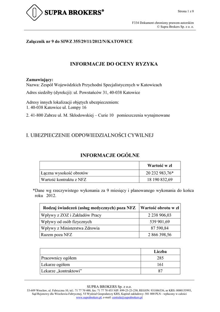 Strona 1 z 8 F334 Dokument chroniony prawem autorskim © Supra Brokers Sp. z o. o. Załącznik nr 9 do SIWZ 355/29/11/2012/N/KATOWICE INFORMACJE DO OCENY RYZYKA Zamawiający: Nazwa: Zespół Wojewódzkich Przychodni Specjalistycznych w Katowicach Adres siedziby (dyrekcji): ul. Powstańców 31, 40-038 Katowice Adresy innych lokalizacji objętych ubezpieczeniem: 1. 40-038 Katowice ul. Lompy 16 2. 41-800 Zabrze ul. M. Skłodowskiej – Curie 10 pomieszczenia wynajmowane I. UBEZPIECZENIE ODPOWIEDZIALNOŚCI CYWILNEJ INFORMACJE OGÓLNE Wartość w zł Łączna wysokość obrotów Wartość kontraktu z NFZ 20 232 983,76* 18 190 832,69 *Dane wg rzeczywistego wykonania za 9 miesięcy i planowanego wykonania do końca roku 2012. Rodzaj świadczeń (usług medycznych) poza NFZ Wpływy z ZOZ i Zakładów Pracy Wpływy od osób fizycznych Wpływy z Ministerstwa Zdrowia Razem poza NFZ Wartość obrotu w zł 2 238 906,03 539 901,69 87 590,84 2 866 398,56 Liczba 285 161 87 Pracownicy ogółem Lekarze ogółem Lekarze „kontraktowi” SUPRA BROKERS Sp. z o.o. 53-609 Wrocław, ul. Fabryczna 10, tel.: 71 77 70 400, fax: 71 77 70 455 NIP: 899-25-23-230, REGON: 931886336, nr KRS: 0000155993, Sąd Rejonowy dla Wrocławia-Fabrycznej, VI Wydział Gospodarczy KRS, Kapitał zakładowy: 501 800 PLN - wpłacony w całości www.suprabrokers.pl, e-mail: [email protected] Strona 2 z 8 F334 Dokument chroniony prawem autorskim © Supra Brokers Sp. z o. o. Pielęgniarki ogółem 46 Liczba przyjętych w ostatnim roku pacjentów 116 159 (rok 2011) - Lecznictwo otwarte Lecznictwo zamknięte Zakres świadczonych usług medycznych Poradnie specjalistyczne Fizykoterapia Diagnostyka specjalistyczna Stomatologia Zakres świadczonych usług pozamedycznych Wynajem pomieszczeń Podmiot leczniczy : prowadzi działalność w budynkach (pomieszczeniach) najmowanych od innych podmiotów posiada laboratorium diagnostyczne posiada laboratorium mikrobiologiczne posiada pracownię histopatologiczną prowadzi działalność w zakresie doskonalenia zawodowego kadr lekarskich, pielęgniarskich itp. Certyfikaty posiadane przez podmiot leczniczy Centralny Ośrodek Badań Jakości w Diagnostyce Laboratoryjnej – Łódź; Centralny Ośrodek Badań Jakości w Diagnostyce Mikrobiologicznej – Warszawa; Labquality – Helsinki Instytut fur Qualitassicherung SUPRA BROKERS Sp. z o.o. 53-609 Wrocław, ul. Fabryczna 10, tel.: 71 77 70 400, fax: 71 77 70 455 NIP: 899-25-23-230, REGON: 931886336, nr KRS: 0000155993, Sąd Rejonowy dla Wrocławia-Fabrycznej, VI Wydział Gospodarczy KRS, Kapitał zakładowy: 501 800 PLN - wpłacony w całości www.suprabrokers.pl, e-mail: [email protected] Strona 3 z 8 F334 Dokument chroniony prawem autorskim © Supra Brokers Sp. z o. o. INFORMACJE TECHNICZNE OCENA OCHRONY PRZECIWPOśAROWEJ ZASTOSOWANE ZABEZPIECZENIA PRZECIWPOśAROWE TAK gaśnice TAK hydranty wewnętrzne TAK NIE hydranty zewnętrzne NIE stałe urządzenia gaśnicze – urządzenia tryskaczowe NIE stałe urządzenia gaśnicze – gazowe NIE stałe urządzenia gaśnicze – pianowe lub proszkowe NIE urządzenia sygnalizujące powstanie poŜaru stały dozór NIE inne OCENA BUDYNKÓW I BUDOWLI Budynki stoją w zabudowie zwartej TAK* hydrant zewnętrzny zlokalizowany na sieci miejskiej ok. 75 m od hydrantu TAK NIE TAK Budynki stoją na posesji ogrodzonej NIE Posesja jest oświetlona TAK Konstrukcja budynków: materiały palne TAK materiały niepalne TAK materiały mieszane Budynki są wykonane z płyt warstwowych z palnym wypełnieniem np. styropianem lub pianką poliuretanową. Ściany działowe wykonane są z: TAK NIE materiałów palnych NIE materiałów palnych zabezpieczonych ognioodpornie NIE materiałów niepalnych TAK Wystrój wnętrz budynków wykonany jest z materiałów: materiałów palnych TAK materiałów palnych zabezpieczonych ognioodpornie materiałów niepalnych NIE TAK SUPRA BROKERS Sp. z o.o. 53-609 Wrocław, ul. Fabryczna 10, tel.: 71 77 70 400, fax: 71 77 70 455 NIP: 899-25-23-230, REGON: 931886336, nr KRS: 0000155993, Sąd Rejonowy dla Wrocławia-Fabrycznej, VI Wydział Gospodarczy KRS, Kapitał zakładowy: 501 800 PLN - wpłacony w całości www.suprabrokers.pl, e-mail: [email protected] Strona 4 z 8 F334 Dokument chroniony prawem autorskim © Supra Brokers Sp. z o. o. Ogniomury NIE Obiekty posiadają wymaganą i sprawną instalację odgromową Istnieją centralne wyłączniki prądu odcinające dopływ energii do wszystkich urządzeń Rodzaj istniejącej instalacji grzewczej: TAK ogrzewanie wodne TAK TAK ogrzewanie wodno-parowe NIE ogrzewanie elektryczne NIE * Stały dozór zapewniony jest w dni robocze poza godzinami pracy pracowników zatrudnionych przez Zespół Wojewódzkich Przychodni Specjalistycznych oraz w dni wolne od pracy 24 godziny na dobę. OCENA OCHRONY PRZECIWPOśAROWEJ TAK NIE Odległość od najbliŜszej jednostki straŜy poŜarnej 1 km Czas dojazdu jednostek straŜy poŜarnej 5 min Istnieje moŜliwość dojazdu jednostek straŜy poŜarnej o kaŜdej porze roku TAK Oznakowane są: drogi poŜarowe TAK drogi i wyjścia ewakuacyjne TAK lokalizacje sprzętu ppoŜ. Budynki są wyposaŜone w sprzęt ratowniczo-gaśniczy zgodnie z wymaganiami Istnieje regulamin ppoŜ. Pracownicy przechodzą szkolenie na wypadek poŜaru i prowadzenia akcji gaśniczej Zatrudniony jest specjalista z zakresu ochrony ppoŜ. TAK TAK TAK TAK TAK Istnieje zakładowa straŜ poŜarna NIE Przeprowadzane są regularne kontrole z ramienia straŜy poŜarnej NIE Prowadzi się kontrole sprzętu ratowniczo-gaśniczego TAK Na terenie zakładu znajdują się zbiorniki z wodą NIE Woda do gaszenia poŜaru dostarczana jest przy uŜyciu pomp NIE z miejskiej sieci wodociągowej Źródła dostarczenia wody SUPRA BROKERS Sp. z o.o. 53-609 Wrocław, ul. Fabryczna 10, tel.: 71 77 70 400, fax: 71 77 70 455 NIP: 899-25-23-230, REGON: 931886336, nr KRS: 0000155993, Sąd Rejonowy dla Wrocławia-Fabrycznej, VI Wydział Gospodarczy KRS, Kapitał zakładowy: 501 800 PLN - wpł