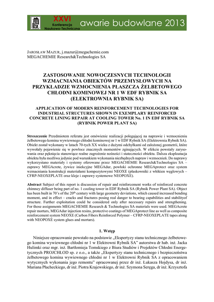 XXVI Konferencja Naukowo-Techniczna awarie budowlane 2013 JAROSŁAW MAZUR, [email protected] MEGACHEMIE Research&Technologies SA ZASTOSOWANIE NOWOCZESNYCH TECHNOLOGII WZMACNIANIA OBIEKTÓW PRZEMYSŁOWYCH NA PRZYKŁADZIE WZMOCNIENIA PŁASZCZA ŻELBETOWEGO CHŁODNI KOMINOWEJ NR 1 W EDF RYBNIK SA (ELEKTROWNIA RYBNIK SA) APPLICATION OF MODERN REINFORCEMENT TECHNOLOGIES FOR INDUSTRIAL STRUCTURES SHOWN IN EXEMPLARY REINFORCED CONCRETE LINING REPAIR AT COOLING TOWER No. 1 IN EDF RYBNIK SA (RYBNIK POWER PLANT SA) Streszczenie Przedmiotem referatu jest omówienie realizacji polegającej na naprawie i wzmocnieniu żelbetowego komina wywiewnego chłodni kominowej nr 1 w EDF Rybnik SA (Elektrownia Rybnik SA). Obiekt został wykonany w latach 70-tych XX wieku z dużymi odchyłkami od założonej geometrii, które wywołały pojawienie się w powłoce znacznych momentów zginających. W efekcie powstały zarysowania oraz pęknięcia stanowiące realne zagrożenie nośności i stateczności obiektu. Dalsza eksploatacja obiektu była możliwa jedynie pod warunkiem wykonania niezbędnych napraw i wzmocnień. Do naprawy wykorzystano materiały i systemy oferowane przez MEGACHEMIE Research&Technologies SA – zaprawy MEGAcrete, żywice iniekcyjne MEGAdur, powłoki ochronne MEGAprotect oraz system wzmacniania konstrukcji materiałami kompozytowymi NEOXE (płaskowniki z włókien węglowych – CFRP-NEOXEPLATE oraz kleje i zaprawy systemowe NEOPOXE). Abstract Subject of this report is discussion of repair and reinforcement works of reinforced concrete chimney diffuser being part of no. 1 cooling tower in EDF Rybnik SA (Rybnik Power Plant SA). Object has been built in 70’s of the 20th century with large geometry deviations, which caused increased bending moment, and in effect – cracks and fractures posing real danger to bearing capabilities and stabilityof structure. Further exploitation could be considered only after necessary repairs and strengthening. For those assignments MEGACHEMIE Research & Technologies SA materials were used. MEGAcrete repair mortars, MEGAdur injection resins, protective coatings of MEGAprotect line as well as composite reinforcement system NEOXE (Carbon Fibers Reinforced Polymer – CFRP-NEOXEPLATE tapes along with NEOPOXE system glues and mortars). 1. Wstęp Niniejsze opracowanie powstało na podstawie „Ekspertyzy stanu technicznego żelbetowego komina wywiewnego chłodni nr 1 w Elektrowni Rybnik SA” autorstwa dr hab. inż. Jacka Hulimki oraz mgr. inż. Bartłomieja Tomskiego z Biura Studiów i Projektów Chłodni Energetycznych PROJCHŁOD sp. z o.o., a także „Ekspertyzy stanu technicznego i bezpieczeństwa żelbetowego komina wywiewnego chłodni nr 1 w Elektrowni Rybnik SA z opracowaniem wytycznych wykonania jego remontu” opracowanej przez dr inż. Łukasza Hojdysa, dr inż. Mariana Płacheckiego, dr inż. Piotra Krajewskiego, dr inż. Szymona Seręga, dr inż. Krzysztofa 1024 Mazur J.: Zastosowanie nowoczesnych technologii wzmacniania obiektów przemysłowych… Chudyba oraz inż. Marka Kozłowskiego z Instytutu Materiałów i Konstrukcji Budowlanych Politechniki Krakowskiej. Fot. 1 Chłodnia nr 1 w EDF Rybnik SA 2. Stan projektowany chłodni kominowej Chłodnia kominowa nr 1 usytuowana jest w południowo-wschodniej części obszaru użytkowanego przez EDF Rybnik SA (Elektrownię Rybnik SA). Obiekt obsługuje bloki energetyczne nr 5 oraz nr 6. Podstawowe dane techniczne: – wysokość całkowita (od górnej krawędzi zbiornika): 120,00 m, – wysokość powłoki: 113,00 m, – poziom przewężenia (od górnej krawędzi zbiornika): 100,00 m, – promień powłoki u podstawy: 46,50 m, – promień powłoki w przewężeniu: 26,00 m, – promień powłoki u wylotu: 27,37 m, – grubość powłoki u podstawy: 0,60 m, – wysokość powłoki o zmiennej grubości (0,60÷0,14 m): 49,00 m, – stała grubość powłoki: 0,14 m, – grubość powłoki u wylotu: 0,25 m, – wysokość okna wlotowego: 7,00 m, – promień w osi ławy fundamentowej: 51,22 m, – głębokość zbiornika: 2,20 m, – krawędź słupa: 0,50 m, – liczba par słupów: 50. Referaty sponsorowane 1025 Rys. 1 Przekrój chłodni 3. Opis obiektu Powłoka omawianego obiektu została zaprojektowana w formie hiperboloidy obrotowej o zmiennej grubości płaszcza. W miejscu połączenia z słupami zastosowano lokalne pogrubienie w postaci pierścienia o wartości 0,60 m. W kolejnym etapie grubość płaszcza uległa zmianie w następujący sposób: na odcinku 13,0 m malała według funkcji hiperbolicznej do wartości 0,18 m, na kolejnych 36,0 m malała liniowo do 0,14 m, przez kolejne 59,0 m była w postaci stałej (0,14 m), a na ostatnich (najwyższych) 5,0 m rosła liniowo do 0,25 m. W górnej krawędzi powłoki został wykonany pierścień usztywniający, pełniący jednocześnie rolę obwodowej 1026 Mazur J.: Zastosowanie nowoczesnych technologii wzmacniania obiektów przemysłowych… galerii. Płaszcz został wykonany z betonu Rw = 250 kG/cm2 (25 MPa), plasowany według obecnych norm poniżej klasy C20/25. Zbrojenie południkowe i równoleżnikowe wykonane zostało z prętów φ16 mm, φ14 mm, φ12 mm i φ10 mm ze stali 34GS (A-III) i St0S (A-0). Płaszcz chłodni podparto na 50 parach słupów ukośnych w układzie „V”. Słupy wykonano jako prefabrykowane, o przekroju kwadratowym 0,50×0,50 m, wbetonowane w cokoły wyprowadzone z fundamentu pierścieniowego i dolny pierścień powłoki. Zgodnie z dokumentacją projektową słupy zostały wykonane z betonu Rw = 300 kG/cm2 (30 MPa), co według obecnych norm plasuje go nieco poniżej klasy C25/30. Zbrojenie główne wykonano z prętów φ22 mm ze stali 34GS (A-III), a strzemiona z prętów φ8 mm ze stali St0S (A-0). Zgodnie z dokumentacją projektową pierścieniowy fundament chłodni o przekroju 5,0×1,2 m, z cokołami pod słupami, został wykonany z betonu Rw = 300 kG/cm2 (30 MPa), co według obecnych norm plasuje go nieco poniżej klasy C25/30. Zb