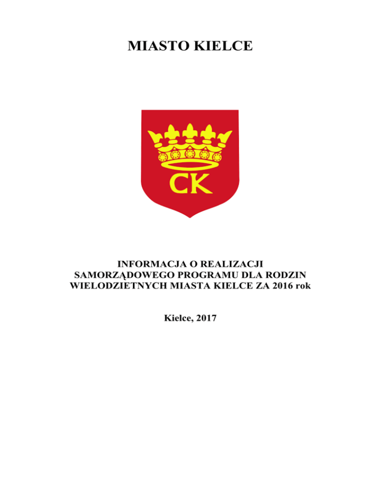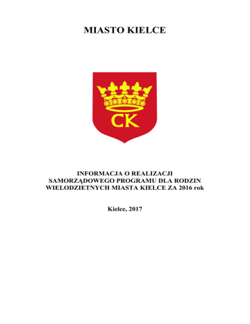 MIASTO KIELCE INFORMACJA O REALIZACJI SAMORZĄDOWEGO PROGRAMU DLA RODZIN WIELODZIETNYCH MIASTA KIELCE ZA 2016 rok Kielce, 2017 INFORMACJA O REALIZACJI SAMORZĄDOWEGO PROGRAMU DLA RODZIN WIELODZIETNYCH MIASTA KIELCE ZA 2016 ROK 1. Podstawy prawne funkcjonowania Programu: Samorządowy Program dla rodzin wielodzietnych Miasta Kielce, zwanym dalej „Programem”, jest realizowany przez Miejski Ośrodek Pomocy Rodzinie w Kielcach od 16 czerwca 2014 r. Stosownie do art. 27 ustawy z dnia 5 grudnia 2014 r. o Karcie Dużej Rodziny (t.j. Dz. U. z 2016 r. poz. 785 z późn.zm.) rada gminy może uchwalić samorządowy program przyznający uprawnienia członkom rodzin wielodzietnych. Jest to zadanie własne samorządu terytorialnego. Podkreślenia wymaga fakt, że samorządowe programy dla rodzin wielodzietnych poszerzają zakres ulg przysługujący rodzinom wielodzietnym w ramach ogólnopolskich uprawnień o zniżki lokalne – gminne. Zgodnie z przepisami cytowanej wyżej ustawy, Karta Dużej Rodziny przysługuje rodzinom z przynajmniej trójką dzieci, dotyczy to także rodzin zastępczych oraz rodzinnych domów dziecka. Przyznawana jest niezależnie od dochodu, wydawana jest bezpłatnie. Kartę Dużej Rodziny otrzymuje: - rodzic (rodzice) lub małżonek rodzica mający na utrzymaniu co najmniej troje dzieci dożywotnio, - dzieci w wieku do ukończenia 18. roku życia, - dzieci w wieku do ukończenia 25. roku życia – w przypadku gdy dziecko uczy się w: 1) szkole – do dnia 30 września następującego po końcu roku szkolnego, 2) szkole wyższej – do końca roku akademickiego - w przypadku dzieci legitymujących się orzeczeniem o umiarkowanym albo znacznym stopniu niepełnosprawności bez ograniczeń wiekowych. Każdy członek rodziny wielodzietnej posiada swoją własną Kartę Dużej Rodziny. Dokumentem potwierdzającym uprawnienia do korzystania z wprowadzonych przez Miasto Kielce uprawnień dla członków rodzin wielodzietnych jest Karta Dużej Rodziny wydana w ramach rządowego programu dla rodzin wielodzietnych, opatrzona identyfikatorem gminy Kielce: 2661011. 2. Struktura rodzin wielodzietnych korzystających z Programu: Na dzień 31 grudnia 2016 rok w Programie uczestniczyło 1467 rodzin wielodzietnych, zamieszkałych na terenie Miasta Kielce, w tym: 2657 osób dorosłych (rodzice i opiekunowie) oraz 4587 dzieci. Łącznie wydano 7714 sztuk Kart Dużej Rodziny. Wśród rodzin wielodzietnych, którym wydano Kartę Dużej Rodziny występują: - 1248 rodzin posiadających 3 dzieci, - 159 rodzin posiadających 4 dzieci, - 29 rodzin posiadających 5 dzieci, - 13 rodzin posiadających 6 dzieci, - 3 rodziny posiadające 7 dzieci i więcej, 3. Uprawnienia lokalne dla rodzin wielodzietnych Miasta Kielce: Rodziny wielodzietne obok zniżek ogólnopolskich mogą korzystać z następujących ulg i uprawnień lokalnych: - bezpłatny udział w imprezach biletowanych oraz bezpłatny udział w zajęciach prowadzonych przez miejskie instytucje kultury i miejskie jednostki organizacyjne: - Kieleckie Centrum Kultury w Kielcach - Dom Środowisk Twórczych w Kielcach - Dom Kultury „Zameczek” w Kielcach - Kielecki Teatr Tańca w Kielcach - Biuro Wystaw Artystycznych w Kielcach - Teatr Lalki i Aktora „Kubuś” w Kielcach - Muzeum Zabawek i Zabawy w Kielcach - Muzeum Historii Kielc - Wzgórze Zamkowe w Kielcach - bezpłatny wstęp do obiektów Miejskiego Ośrodka Sportu i Rekreacji: - Basen letni/Lodowisko - Kryta pływalnia FOKA - Kryta pływalnia DELFIN - Kryta pływalnia ORKA - Kryta pływalnia MORS - Kryta pływalnia JURAJSKA - bezpłatne przejazdy na podstawie biletu okresowego 90-dniowego dla trzeciego i kolejnego dziecka z rodziny wielodzietnej, do ukończenia 18 roku życia, a w przypadku pobierania nauki w szkole lub w szkole wyższej – nie dłużej niż do ukończenia 25 roku życia. Wykaz ulg jest ogólnie dostępny, można zapoznać się z nim na stronie internetowej Urzędu Miasta Kielce oraz Miejskiego Ośrodka Pomocy Rodzinie w Kielcach. Dodatkowo przeprowadzono akcję, propagującą wiedzę o Karcie Dużej Rodziny – przekazano do szkół, przedszkoli i żłobków kolorowe plakaty z podstawowymi informacjami o Programie. 4. Koszty realizacji Programu samorządowego dla rodzin wielodzietnych Miasta Kielce: Koszt uprawnień udzielonych przez samorządowe instytucje kultury, miejskie jednostki organizacyjne i spółki miejskie jest finansowany ze środków finansowych zabezpieczonych przez Miasto Kielce w ramach budżetu Miejskiego Ośrodka Pomocy Rodzinie w Kielcach. W okresie od 1 stycznia do 31 grudnia 2016 roku zarejestrowano: - 31 028 wejść członków rodzin wielodzietnych do obiektów MOSiR w Kielcach (baseny), za co uregulowano opłatę w kwocie 267 933,00 zł, - 5 924 wejść członków rodzin wielodzietnych na zajęcia taneczne typu: taniec towarzyski, balet, hip hop, jazz, salsa, disco and balet, studio baletowe itp. oraz na spektakle organizowane przez Kielecki Teatr Tańca. Koszt udziału wyniósł 140 558,00 zł, - 4 255 wejścia na spektakle oraz warsztaty teatralne zorganizowane przez Teatr Lalki i Aktora „Kubuś” w Kielcach, których koszt wyniósł 68 844,00 zł, - wydano 1 721 bezpłatnych biletów na przejazdy ZTM w Kielcach dla dzieci z rodzin wielodzietnych na kwotę 189 921,00 zł, - wydano 1 258 biletów na spektakle, koncerty, pokazy organizowane przez Kieleckie Centrum Kultury na kwotę 73 415,00 zł (m.in. Pokaz Mody Kupisz, koncert zespołu MICRO MUSIC, koncert zespołu Śląsk, spektakl „Krakowiacy i Górale”, „DIWA” itd.) - 532 dzieci brało udział w zajęciach programowych organizowanych przez Dom Kultury „Zameczek”. Były to zajęcia wokalne, plastyczne, muzyczne, taneczne, instrumentalne, zajęcia z fotografii, gitary akustycznej i elektrycznej, organizowano również zajęcia dla dzieci w okresie letnim i ferii zimowych. Za 2 074 wejść na zajęcia uregulowano opłatę 26 845,00 zł, - wydano 380 biletów na koncerty, recitale zor