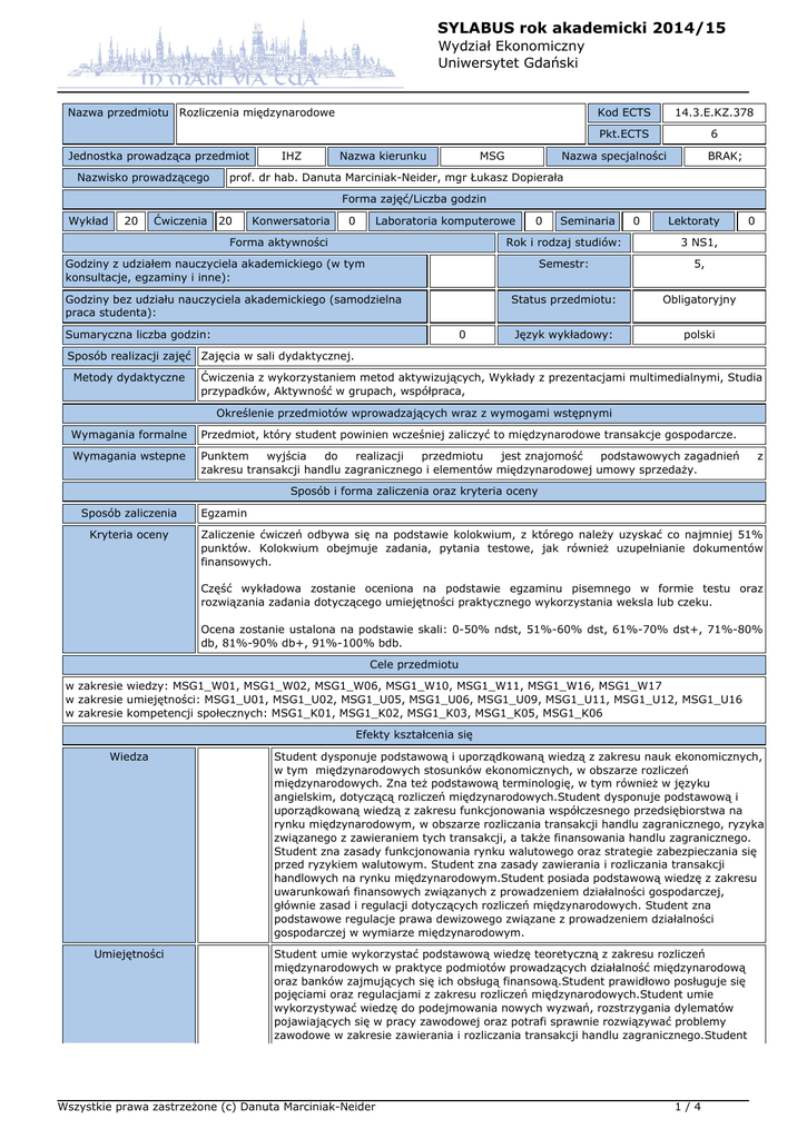 SYLABUS rok akademicki 2014/15 Wydział Ekonomiczny Uniwersytet Gdański Nazwa przedmiotu Rozliczenia międzynarodowe Jednostka prowadząca przedmiot Nazwisko prowadzącego IHZ Nazwa kierunku MSG Kod ECTS 14.3.E.KZ.378 Pkt.ECTS 6 Nazwa specjalności BRAK; prof. dr hab. Danuta Marciniak-Neider, mgr Łukasz Dopierała Forma zajęć/Liczba godzin Wykład 20 Ćwiczenia 20 Konwersatoria 0 Laboratoria komputerowe Forma aktywności 0 Sumaryczna liczba godzin: 0 0 Lektoraty Rok i rodzaj studiów: 3 NS1, Semestr: 5, Status przedmiotu: Obligatoryjny Język wykładowy: polski Godziny z udziałem nauczyciela akademickiego (w tym konsultacje, egzaminy i inne): Godziny bez udziału nauczyciela akademickiego (samodzielna praca studenta): Seminaria 0 Sposób realizacji zajęć Zajęcia w sali dydaktycznej. Metody dydaktyczne Ćwiczenia z wykorzystaniem metod aktywizujących, Wykłady z prezentacjami multimedialnymi, Studia przypadków, Aktywność w grupach, współpraca, Określenie przedmiotów wprowadzających wraz z wymogami wstępnymi Wymagania formalne Przedmiot, który student powinien wcześniej zaliczyć to międzynarodowe transakcje gospodarcze. Wymagania wstepne Punktem wyjścia do realizacji przedmiotu jest znajomość podstawowych zagadnień zakresu transakcji handlu zagranicznego i elementów międzynarodowej umowy sprzedaży. z Sposób i forma zaliczenia oraz kryteria oceny Sposób zaliczenia Kryteria oceny Egzamin Zaliczenie ćwiczeń odbywa się na podstawie kolokwium, z którego należy uzyskać co najmniej 51% punktów. Kolokwium obejmuje zadania, pytania testowe, jak również uzupełnianie dokumentów finansowych. Część wykładowa zostanie oceniona na podstawie egzaminu pisemnego w formie testu oraz rozwiązania zadania dotyczącego umiejętności praktycznego wykorzystania weksla lub czeku. Ocena zostanie ustalona na podstawie skali: 0-50% ndst, 51%-60% dst, 61%-70% dst+, 71%-80% db, 81%-90% db+, 91%-100% bdb. Cele przedmiotu w zakresie wiedzy: MSG1_W01, MSG1_W02, MSG1_W06, MSG1_W10, MSG1_W11, MSG1_W16, MSG1_W17 w zakresie umiejętności: MSG1_U01, MSG1_U02, MSG1_U05, MSG1_U06, MSG1_U09, MSG1_U11, MSG1_U12, MSG1_U16 w zakresie kompetencji społecznych: MSG1_K01, MSG1_K02, MSG1_K03, MSG1_K05, MSG1_K06 Efekty kształcenia się Wiedza Umiejętności Student dysponuje podstawową i uporządkowaną wiedzą z zakresu nauk ekonomicznych, w tym międzynarodowych stosunków ekonomicznych, w obszarze rozliczeń międzynarodowych. Zna też podstawową terminologię, w tym również w języku angielskim, dotyczącą rozliczeń międzynarodowych.Student dysponuje podstawową i uporządkowaną wiedzą z zakresu funkcjonowania współczesnego przedsiębiorstwa na rynku międzynarodowym, w obszarze rozliczania transakcji handlu zagranicznego, ryzyka związanego z zawieraniem tych transakcji, a także finansowania handlu zagranicznego. Student zna zasady funkcjonowania rynku walutowego oraz strategie zabezpieczania się przed ryzykiem walutowym. Student zna zasady zawierania i rozliczania transakcji handlowych na rynku międzynarodowym.Student posiada podstawową wiedzę z zakresu uwarunkowań finansowych związanych z prowadzeniem działalności gospodarczej, głównie zasad i regulacji dotyczących rozliczeń międzynarodowych. Student zna podstawowe regulacje prawa dewizowego związane z prowadzeniem działalności gospodarczej w wymiarze międzynarodowym. Student umie wykorzystać podstawową wiedzę teoretyczną z zakresu rozliczeń międzynarodowych w praktyce podmiotów prowadzących działalność międzynarodową oraz banków zajmujących się ich obsługą finansową.Student prawidłowo posługuje się pojęciami oraz regulacjami z zakresu rozliczeń międzynarodowych.Student umie wykorzystywać wiedzę do podejmowania nowych wyzwań, rozstrzygania dylematów pojawiających się w pracy zawodowej oraz potrafi sprawnie rozwiązywać problemy zawodowe w zakresie zawierania i rozliczania transakcji handlu zagranicznego.Student Wszystkie prawa zastrzeżone (c) Danuta Marciniak-Neider 1/4 SYLABUS rok akademicki 2014/15 Wydział Ekonomiczny Uniwersytet Gdański potrafi zidentyfikować wybrane rodzaje ryzyk związanych z działalnością międzynarodową przedsiębiorstw (w tym ryzyko nieotrzymania płatności przez eksportera, ryzyko niewłaściwego wykonania kontraktu przez importera, ryzyko walutowe), określić prawidłowo ich konsekwencje i sposoby zabezpieczania się przed tymi ryzykami. Student potrafi zastosować strategie zabezpieczające przed ryzykiem walutowym. Student potrafi wybrać i zastosować odpowiednią formę rozliczenia transakcji handlu zagranicznego, a także korzystać z dostępnych na rynku instrumentów finansowania handlu zagranicznego. Kompetencje Student zna ograniczenia własnej wiedzy oraz umiejętności w zakresie rozliczania obrotów międzynarodowych, ponadto zdaje sobie sprawę ze zmieniającego się otoczenia, dlatego też rozumie potrzebę uczenia się przez całe życie oraz pogłębiania i uzupełniania nabytej wiedzy i umiejętności; wyznacza kierunki własnego rozwoju i uczenia się.Student potrafi współpracować w zespole, w sposób właściwy komunikuje się z otoczeniem, potrafi odpowiednio określić priorytety służące realizacji określonego przez siebie lub innych zadania oraz ponosić odpowiedzialność za podejmowane działania.Student potrafi efektywnie uczestniczyć w podejmowaniu i realizacji grupowych zadań projektowych dotyczących rozliczeń obrotów handlowych dokonywanych przez współczesne podmioty gospodarcze w warunkach postępującego umiędzynarodawiania działalności gospodarczej. Student potrafi myśleć w sposób przedsiębiorczy, podejmując decyzje o zarządzania ryzykiem przy przeprowadzaniu transakcji handlu zagranicznego. Treści programowe 1. Zasady rozliczeń w handlu międzynarodowym - formy rozliczania transakcji w handlu zagranicznym (pieniężne, niepieniężne - kompensacyjne) rachunek nostro, vostro, loro 