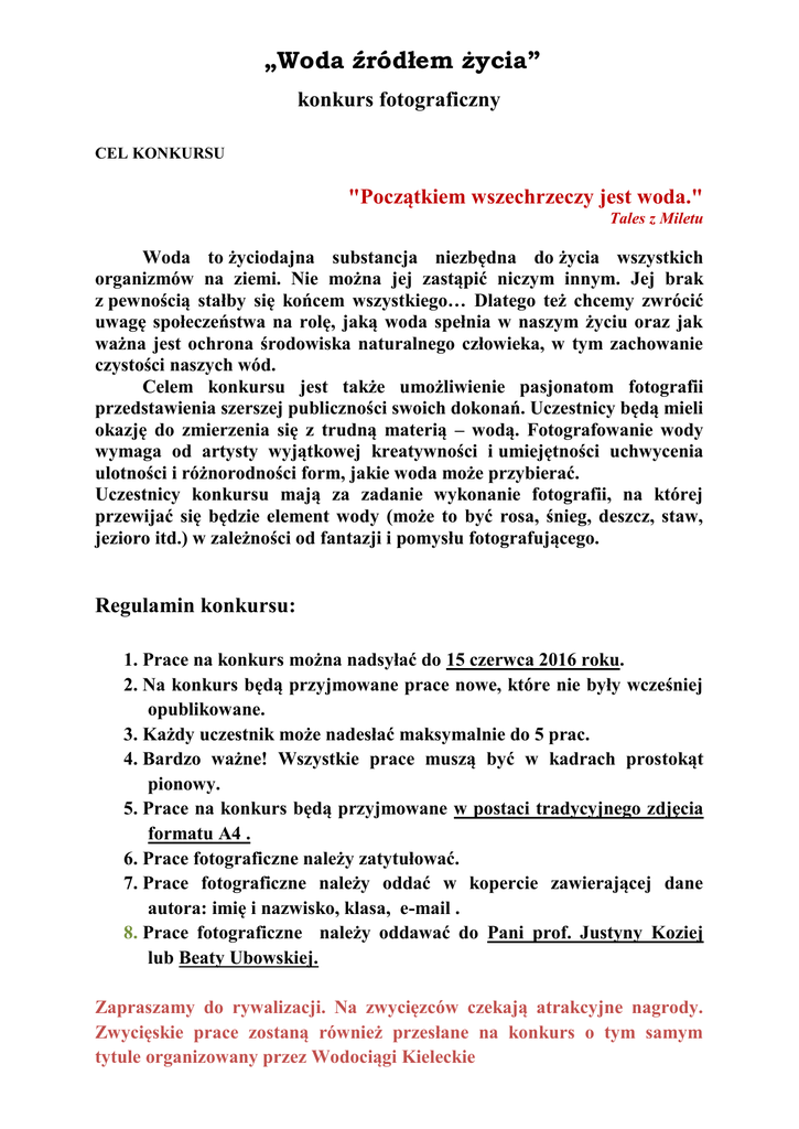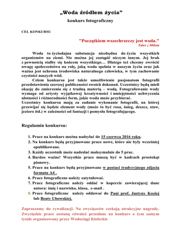 „Woda źródłem życia” konkurs fotograficzny CEL KONKURSU "Początkiem wszechrzeczy jest woda." Tales z Miletu Woda to życiodajna substancja niezbędna do życia wszystkich organizmów na ziemi. Nie można jej zastąpić niczym innym. Jej brak z pewnością stałby się końcem wszystkiego… Dlatego też chcemy zwrócić uwagę społeczeństwa na rolę, jaką woda spełnia w naszym życiu oraz jak ważna jest ochrona środowiska naturalnego człowieka, w tym zachowanie czystości naszych wód. Celem konkursu jest także umożliwienie pasjonatom fotografii przedstawienia szerszej publiczności swoich dokonań. Uczestnicy będą mieli okazję do zmierzenia się z trudną materią – wodą. Fotografowanie wody wymaga od artysty wyjątkowej kreatywności i umiejętności uchwycenia ulotności i różnorodności form, jakie woda może przybierać. Uczestnicy konkursu mają za zadanie wykonanie fotografii, na której przewijać się będzie element wody (może to być rosa, śnieg, deszcz, staw, jezioro itd.) w zależności od fantazji i pomysłu fotografującego. Regulamin konkursu: 1. Prace na konkurs można nadsyłać do 15 czerwca 2016 roku. 2. Na konkurs będą przyjmowane prace nowe, które nie były wcześniej opublikowane. 3. Każdy uczestnik może nadesłać maksymalnie do 5 prac. 4. Bardzo ważne! Wszystkie prace muszą być w kadrach prostokąt pionowy. 5. Prace na konkurs będą przyjmowane w postaci tradycyjnego zdjęcia formatu A4 . 6. Prace fotograficzne należy zatytułować. 7. Prace fotograficzne należy oddać w kopercie zawierającej dane autora: imię i nazwisko, klasa, e-mail . 8. Prace fotograficzne należy oddawać do Pani prof. Justyny Koziej lub Beaty Ubowskiej. Zapraszamy do rywalizacji. Na zwycięzców czekają atrakcyjne nagrody. Zwycięskie prace zostaną również przesłane na konkurs o tym samym tytule organizowany przez Wodociągi Kieleckie „ Jesteśmy społeczeństwem świadomym – oszczędzamy wodę ” Konkurs na hasło promujące oszczędzanie wody CEL KONKURSU Woda należy do najcenniejszych bogactw naturalnych występujących w przyrodzie. Bez niej niemożliwe byłoby jakiekolwiek życie na naszej planecie. Jest głównym składnikiem organizmów żywych, jej uzupełnianie jest koniecznością dla istnienia wszelkiego życia, dla życia roślin oraz zwierząt. Nieracjonalna, rabunkowa gospodarka zasobami naturalnymi stała się główną przyczyna zmniejszania się puli wody czystej na tyle, aby nadawała się do spożycia przez człowieka bez uszczerbku dla jego zdrowia. Skażenie wody niszczy nie tylko przyrodę, zwierzęta i rośliny, ale zagraża tez człowiekowi. Dalsze zanieczyszczenie wody może doprowadzić do zniszczenia różnorodności życia na Ziemi. Dziś nie ulega już wątpliwości fakt, ze oszczędność i ochrona czystości wody są jednymi z priorytetów ochrony środowiska. Regulamin konkursu 1. Prace konkursowe można oddawać do 21 marca 2016 roku, do godziny 10.30. 2. W konkursie mogą wziąć udział pojedyncze osoby lub grupy uczniów / może to być cała klasa / 3. Prace konkursowe należy oddać w kopercie zawierającej dane autora / autorów /: imię i nazwisko, klasa. 9. Prace należy oddawać do Pani prof. Justyny Koziej lub Beaty Ubowskiej. Zapraszamy do udziału w konkursie. Na zwycięzców czekają atrakcyjne nagrody. Zwycięskie hasło będzie jednocześnie tytułem zdjęcia wszystkich uczniów szkoły wykonanego na hali 22 marca 2016 roku