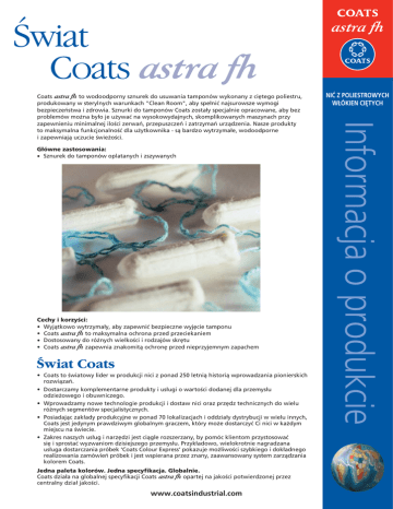 astra fh astra fh Główne zastosowania: • Sznurek do tamponów oplatanych i zszywanych Cechy i korzyści: • Wyjątkowo wytrzymały, aby zapewnić bezpieczne wyjęcie tamponu • Coats astra fh to maksymalna ochrona przed przeciekaniem • Dostosowany do różnych wielkości i rodzajów skrętu • Coats astra fh zapewnia znakomitą ochronę przed nieprzyjemnym zapachem • Coats to światowy lider w produkcji nici z ponad 250 letnią historią wprowadzania pionierskich rozwiązań. • Dostarczamy komplementarne produkty i usługi o wartości dodanej dla przemysłu odzieżowego i obuwniczego. • Wprowadzamy nowe technologie produkcji i dostaw nici oraz przędz technicznych do wielu różnych segmentów specjalistycznych. • Posiadając zakłady produkcyjne w ponad 70 lokalizacjach i oddziały dystrybucji w wielu innych, Coats jest jedynym prawdziwym globalnym graczem, który może dostarczyć Ci nici w każdym miejscu na świecie. • Zakres naszych usług i narzędzi jest ciągle rozszerzany, by pomóc klientom przystosować się i sprostać wyzwaniom dzisiejszego przemysłu. Przykładowo, wielokrotnie nagradzana usługa dostarczania próbek ‘Coats Colour Express’ pokazuje możliwości szybkiego i dokładnego realizowania zamówień próbek i jest wspierana przez znany, zaawansowany system zarządzania kolorem Coats. Jedna paleta kolorów. Jedna specyfikacja. Globalnie. Coats działa na globalnej specyfikacji Coats astra fh opartej na jakości potwierdzonej przez centralny dział jakości. www.coatsindustrial.com NIĆ Z POLIESTROWYCH WŁÓKIEN CIĘTYCH Informacja o produkcie Coats astra fh to wodoodporny sznurek do usuwania tamponów wykonany z ciętego poliestru, produkowany w sterylnych warunkach "Clean Room", aby spełnić najsurowsze wymogi bezpieczeństwa i zdrowia. Sznurki do tamponów Coats zostały specjalnie opracowane, aby bez problemów można było je używać na wysokowydajnych, skomplikowanych maszynach przy zapewnieniu minimalnej ilości zerwań, przepuszczeń i zatrzymań urządzenia. Nasze produkty to maksymalna funkcjonalność dla użytkownika - są bardzo wytrzymałe, wodoodporne i zapewniają uczucie świeżości. astra fh Dane techniczne: Nr Tex z Oferty Globalnej Tkt Składowe 18 27 27 40 60 80 105 180 120 120 80 50 30 25 2 2 3 2 2 3 4 Przeciętna Wydłużenie % Zalecany Rozmiar Igły* Wytrzymałość Min. - Maks. cN Gramów Singer Metryczny 601 924 974 1,408 2,081 3,178 4,253 613 942 993 1,436 2,122 3,241 4,337 12 - 19 13 - 20 12 - 19 13 - 20 13 - 21 13 - 21 16 - 22 9 - 11 11 - 14 11 - 14 14 - 18 16 - 19 18 - 21 19 - 22 65 - 75 75 - 90 75 - 90 90 - 110 100 - 120 110 - 130 120 - 140 Fizyczne i chemiczne właściwości nici z poliestrowych włókien ciętych: Właściwości termiczne: • Topi się w temperaturze 250 - 260ºC, mięknie w temperaturze 220 - 240ºC • Wykurcz poniżej 1% w temperaturze 150ºC Właściwości chemiczne: • Kwasy organiczne: • Alkalia: • Rozpuszczalniki organiczne: • Wybielanie: • Insekty / mikroorganizmy (pleśnie, grzyby): • Pranie / pranie na sucho: • Absorbcja wilgoci: © Prawa autorskie zastrzeżone 2013 Odporna na większość kwasów mineralnych Zasadniczo odporna na słabe zasady, jednak mniej odporna na zasady w wyższych stężeniach, zwłaszcza w wysokich temperaturach Generalnie odporna, jednak rozpuszcza się w związkach fenolowych Nie zmienia właściwości Nie zmienia właściwości Nie zmienia właściwości 0.4% www.coatsindustrial.com Informacja o produkcie * Podane rekomendacje igieł należy traktować wyłącznie jako wskazówkę. Ich ostateczny wybór zależy od rodzaju zastosowania. Biorąc pod uwagę, że warunki i zastosowanie nici mogą być bardzo zróżnicowane, użytkownik nici powinien wcześniejszymi pozytywnymi testami próbnymi potwierdzić użycie danej nici do konkretnego przeznaczenia. Powyższe dane techniczne oparte są na pomiarach uśrednionych i powinny być traktowane jako orientacyjne. NIĆ Z POLIESTROWYCH WŁÓKIEN CIĘTYCH