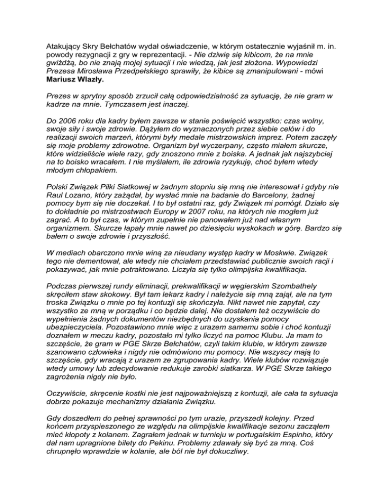Atakujący Skry Bełchatów wydał oświadczenie, w którym ostatecznie wyjaśnił m. in. powody rezygnacji z gry w reprezentacji. - Nie dziwię się kibicom, że na mnie gwiżdżą, bo nie znają mojej sytuacji i nie wiedzą, jak jest złożona. Wypowiedzi Prezesa Mirosława Przedpełskiego sprawiły, że kibice są zmanipulowani - mówi Mariusz Wlazły. Prezes w sprytny sposób zrzucił całą odpowiedzialność za sytuację, że nie gram w kadrze na mnie. Tymczasem jest inaczej. Do 2006 roku dla kadry byłem zawsze w stanie poświęcić wszystko: czas wolny, swoje siły i swoje zdrowie. Dążyłem do wyznaczonych przez siebie celów i do realizacji swoich marzeń, którymi były medale mistrzowskich imprez. Potem zaczęły się moje problemy zdrowotne. Organizm był wyczerpany, często miałem skurcze, które widzieliście wiele razy, gdy znoszono mnie z boiska. A jednak jak najszybciej na to boisko wracałem. I nie myślałem, ile zdrowia ryzykuję, choć byłem wtedy młodym chłopakiem. Polski Związek Piłki Siatkowej w żadnym stopniu się mną nie interesował i gdyby nie Raul Lozano, który zażądał, by wysłać mnie na badanie do Barcelony, żadnej pomocy bym się nie doczekał. I to był ostatni raz, gdy Związek mi pomógł. Działo się to dokładnie po mistrzostwach Europy w 2007 roku, na których nie mogłem już zagrać. A to był czas, w którym zupełnie nie panowałem już nad własnym organizmem. Skurcze łapały mnie nawet po dziesięciu wyskokach w górę. Bardzo się bałem o swoje zdrowie i przyszłość. W mediach obarczono mnie winą za nieudany występ kadry w Moskwie. Związek tego nie dementował, ale wtedy nie chciałem przedstawiać publicznie swoich racji i pokazywać, jak mnie potraktowano. Liczyła się tylko olimpijska kwalifikacja. Podczas pierwszej rundy eliminacji, prekwalifikacji w węgierskim Szombathely skręciłem staw skokowy. Był tam lekarz kadry i należycie się mną zajął, ale na tym troska Związku o mnie po tej kontuzji się skończyła. Nikt nawet nie zapytał, czy wszystko ze mną w porządku i co będzie dalej. Nie dostałem też oczywiście do wypełnienia żadnych dokumentów niezbędnych do uzyskania pomocy ubezpieczyciela. Pozostawiono mnie więc z urazem samemu sobie i choć kontuzji doznałem w meczu kadry, pozostało mi tylko liczyć na pomoc Klubu. Ja mam to szczęście, że gram w PGE Skrze Bełchatów, czyli takim klubie, w którym zawsze szanowano człowieka i nigdy nie odmówiono mu pomocy. Nie wszyscy mają to szczęście, gdy wracają z urazem ze zgrupowania kadry. Wiele klubów rozwiązuje wtedy umowy lub zdecydowanie redukuje zarobki siatkarza. W PGE Skrze takiego zagrożenia nigdy nie było. Oczywiście, skręcenie kostki nie jest najpoważniejszą z kontuzji, ale cała ta sytuacja dobrze pokazuje mechanizmy działania Związku. Gdy doszedłem do pełnej sprawności po tym urazie, przyszedł kolejny. Przed końcem przyspieszonego ze względu na olimpijskie kwalifikacje sezonu zacząłem mieć kłopoty z kolanem. Zagrałem jednak w turnieju w portugalskim Espinho, który dał nam upragnione bilety do Pekinu. Problemy zdawały się być za mną. Coś chrupnęło wprawdzie w kolanie, ale ból nie był dokuczliwy. Tuż przed igrzyskami wybiłem sobie palec - lewy kciuk. Ten sam palec złamałem potem podczas igrzysk w Pekinie, w meczu z Serbią. Drugą połowę igrzysk, czyli trzy mecze, grałem na blokadach i nie miałem żadnej wątpliwości, że warto podjąć takie ryzyko. To chyba ostatecznie obala zarzuty, że nie chcę grać dla kadry lub że nie zależy mi na jej sukcesach. Zawsze chciałem jej pomóc i pomagałem kolegom za wszelką cenę, także swojego zdrowia. Po powrocie z Pekinu powtórzyła się historia sprzed roku. Jedyny kontakt ze strony PZPS nie był związany z pytaniem o stan mojej dłoni, a z nakazem występów w barażach o mistrzostwa Europy przeciwko Belgii. A ja zagrać nie mogłem, bo zakazali mi tego lekarze. Kolejne złamanie w tym momencie groziłoby kilkumiesięczną przerwą. Więcej telefonów ze Związku nie dostałem. To bolało, choć bardziej cieszyło mnie, że nie ma żadnych nacisków ze strony Klubu, bym wcześniej wracał do gry. Od PGE Skry dostałem wszelką pomoc, zawsze mogłem liczyć na wsparcie ludzi z Bełchatowa. To są moi Przyjaciele przez duże „P". Znając swoje wcześniejsze doświadczenia z kontuzjami w meczach kadry, postanowiłem zadbać o pełną dokumentację medyczną urazu z Pekinu. Gdy zadzwoniłem do PZPS, odesłano mnie do odpowiedzialnego za to Pana Marka Irka, który stwierdził, że nie może właśnie rozmawiać i... oddzwoni następnego dnia. Nie mieliśmy kontaktu aż do spotkania w... 2010 roku, czyli przez dwa lata. Podczas tego spotkania wraz z Prezesem Przedpełskim rozmawialiśmy - żeby było śmieszniej, a może tragiczniej - o... ubezpieczeniach. Po tym spotkaniu podszedłem do Pana Irka, przypominając sprawę kontuzji z Pekinu i naszej rozmowy. Odpowiedział, że kojarzy sprawę, pamięta i... zadzwoni jutro. Nie zadzwonił do dziś, drugi raz okłamał mnie w ten sam sposób. Dlatego tak ciężko mi współpracować z ludźmi, którzy w Związku odpowiadają za to, by nam pomagać. A tego nie robią. Nie ufam im już. W 2009 roku leczyłem głównie zniszczone kolano. Od zakończenia sezonu przebywałem na rehabilitacji. Od maja do końca października, równe pół roku, gdy walczyłem o powrót na boisko, nie zadzwonił do mnie nikt ze Związku. Nikt. Nie odebrałem ani jednego telefonu. Oprócz kolegów z kadry moją rehabilitacją interesował się tylko Daniel Castellani i bardzo go za to cenię. Prawdziwych przyjaciół poznaje się w biedzie i on mnie nie zawiódł. Choć właściwie jeden telefon z PZPS był. Po 4 miesiącach, przed mistrzostwami Europy w Izmirze, zadzwonił do mnie Witold Roman, ówczesny menedżer reprezentacji. Nie dzwonił zapytać, jak się czuję, a poinformował mnie jedynie, że odebrano mi stypendium
