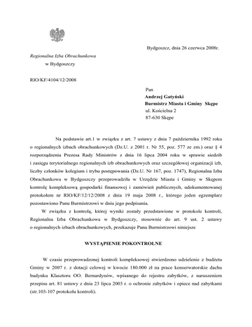 Bydgoszcz, dnia 26 czerwca 2008r. Regionalna Izba Obrachunkowa w Bydgoszczy RIO/KF/4104/12/2008 Pan Andrzej Gatyński Burmistrz Miasta i Gminy Skępe ul. Kościelna 2 87-630 Skępe Na podstawie art.1 w związku z art. 7 ustawy z dnia 7 października 1992 roku o regionalnych izbach obrachunkowych (Dz.U. z 2001 r. Nr 55, poz. 577 ze zm.) oraz § 4 rozporządzenia Prezesa Rady Ministrów z dnia 16 lipca 2004 roku w sprawie siedzib i zasięgu terytorialnego regionalnych izb obrachunkowych oraz szczegółowej organizacji izb, liczby członków kolegium i trybu postępowania (Dz.U. Nr 167, poz. 1747), Regionalna Izba Obrachunkowa w Bydgoszczy przeprowadziła w Urzędzie Miasta i Gminy w Skępem kontrolę kompleksową gospodarki finansowej i zamówień publicznych, udokumentowanej protokołem nr RIO/KF/12/12/2008 z dnia 19 maja 2008 r., którego jeden egzemplarz pozostawiono Panu Burmistrzowi w dniu jego podpisania. W związku z kontrolą, której wyniki zostały przedstawione w protokole kontroli, Regionalna Izba Obrachunkowa w Bydgoszczy, stosownie do art. 9 ust. 2 ustawy o regionalnych izbach obrachunkowych, przekazuje Panu Burmistrzowi niniejsze WYSTĄPIENIE POKONTROLNE W czasie przeprowadzonej kontroli kompleksowej stwierdzono udzielenie z budżetu Gminy w 2007 r. z dotacji celowej w kwocie 180.000 zł na prace konserwatorskie dachu budynku Klasztoru OO. Bernardynów, wpisanego do rejestru zabytków, z naruszeniem przepisu art. 81 ustawy z dnia 23 lipca 2003 r. o ochronie zabytków i opiece nad zabytkami (str.103-107 protokołu kontroli). Ustalono, że Samorządowe Województwo Kujawsko-Pomorskie zawarło z Gminą porozumienie Nr INW.I.0116-WSPF/84/2007 z dnia 20 lipca 2007 roku w sprawie udzielenia pomocy finansowej Gminie Skępe ze środków własnych Województwa w formie dotacji celowej, w celu wykonania zadania związanego z pracami konserwatorskimi, polegającymi na remoncie dachu budynku klasztoru O.O. Bernardynów. Podstawą zawarcie porozumienia była uchwała Sejmiku Województwa Kujawsko - Pomorskiego Nr VIII/108/07 z dnia 28 maja 2007 r., podjęta na mocy przepisów art.167 ust.2 pkt 5 i art. 175 ustawy z dnia 30 czerwca 2005 r. o finansach publicznych. Zgodnie z postanowieniami zawartymi w porozumieniu Gmina zobowiązana została do merytorycznego i finansowego rozliczenia zadania i otrzymanej dotacji. Wymienione środki zostały wprowadzone do budżetu Gminy Skepe Uchwałą Nr IX/54/2007 Rady Miejskiej z dnia 19 lipca 2007 r. Uchwałą tą zwiększono plan wydatków budżetowych o dotację celową na finansowanie lub dofinansowanie prac remontowych i konserwatorskich obiektów zabytkowych dla jednostek niezaliczanych do sektora finansów publicznych (§2720 klasyfikacji budżetowej), w kwocie 180.000 zł oraz dokonano zwiększenia o tę kwotę planu dochodów budżetowych (dział 921, rozdział 92120, §2330). W dniu 23 lipca 2007 r. Gmina Skępe zawarła porozumienie Nr 1/2007 z Klasztorem O.O. Bernardynów w sprawie przekazania Klasztorowi otrzymanej od Województwa KujawskoPomorskiego dotacji celowej, z przeznaczeniem na wykonanie w terminie do 31 sierpnia 2007 r. prac remontowo-konserwatorskich dachu budynku klasztoru O.O. Bernardynów. Na podstawie przedłożonej do kontroli dokumentacji księgowej ustalono, że dotacja w kwocie 180.000 zł wpłynęła na rachunek budżetu gminy w dniu 22 sierpnia 2007 r. i w tym samym dniu została przekazana przez gminę Skępe na rachunek bankowy Klasztoru O.O. Bernardynów w Skępem. Dotowany podmiot rozliczył się z otrzymanej dotacji, w sposób określony w powołanym wyżej porozumieniu zawartym z Gminą. Przekazanie przez Burmistrza Miasta i Gminy dotacji celowej Klasztorowi O.O. Bernardynów w Skępem, stanowi naruszenie przepisu art. 81 ust. 1 ustawy z dnia 23 lipca 2003 r. o ochronie zabytków i opiece nad zabytkami (Dz.U. z 2003 r. Nr 162, poz.1568 ze zmianami), zgodnie z którym dotacja na prace konserwatorskie przy zabytku wpisanym do rejestru może być udzielona wyłącznie przez organ stanowiący gminy, na zasadach określonych w podjętej przez ten organ uchwale. Zgodnie z ustaleniami kontroli Rada Miejska w Skępe nie podjęła uchwały określającej zasady udzielania dotacji na prace konserwatorskie, restauratorskie lub roboty budowlane przy zabytkach wpisanych do rejestru, nie podjęła również uchwały w sprawie udzielenia dotacji Klasztorowi OO. Bernardynów. 2 Odpowiedzialność za stwierdzoną nieprawidłowość, związaną z udzieleniem dotacji z pominięciem procedur i zasad jej udzielenia ponosi Burmistrz Miasta i Gminy w Skępem, na podstawie art. 44 ust.1 ustawy z dnia 30 czerwca 2005 r. o finansach publicznych. Niezależnie od powyższego, stwierdzono także inne nieprawidłowości, do których należą: ─ nierzetelne sporządzenie sprawozdań budżetowych za 2005 i 2006 r. o symbolu Rb-27S z wykonania planu dochodów budżetowych oraz Rb-PDP z wykonania podstawowych dochodów podatkowych, poprzez zaniżenie skutków z tytułu obniżenia górnych stawek podatku rolnego, o łączną kwotę 1.198,99 zł, z tego: a) za okres od początku roku do 31 grudnia 2005 r. - o kwotę 411,10 zł, b) za okres od początku roku do 31 grudnia 2006 r. - o kwotę 787,89 zł. Z wyjaśnienia udzielonego przez Skarbnika Miast i Gminy w Skępem wynika, że przyczyną powstania wskazanych wyżej nieprawidłowości był nieprawidłowo funkcjonujący program komputerowy. W trakcie kontroli dokonano korekty ww. sprawozdań budżetowych i w dniu 28 kwietnia 2008 r. skorygowane sprawozdania przesłano elektronicznie do Regionalnej Izby Obrachunkowej w Bydgoszczy (str. 51 i 57 i 58 protokołu kontroli), ─ nieokreślenie w decyzjach w sprawie zwolnienia od podatku rolnego gruntów nabytych w drodze kupna kwoty udzielonego w roku podatkowym zwolnienia (str. 72 protokołu kontroli). ─ zastosowanie instytucji odrzucenia oferty, zamiast wykluczenia z postępowania o zamówienie publiczne wobec wykonawców, którzy nie dostarczyli 