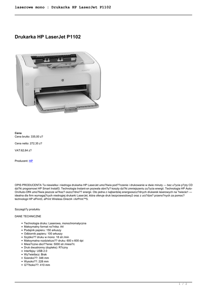 laserowe mono : Drukarka HP LaserJet P1102 Drukarka HP LaserJet P1102 Cena Cena brutto: 335,00 z? Cena netto: 272,35 z? VAT:62,64 z? Producent: HP OPIS PRODUCENTA Ta niewielka i niedroga drukarka HP LaserJet umo?liwia pod??czenie i drukowanie w dwie minuty — bez u?ycia p?yty CD dzi?ki programowi HP Smart Install3. Technologia Instant-on pozwala obni?y? koszty dzi?ki zmniejszeniu zu?ycia energii. Technologia HP AutoOn/Auto-Off4 umo?liwia jeszcze wi?ksz? oszcz?dno?? energii. Oto jedna z najbardziej energooszcz?dnych drukarek laserowych na ?wiecie1 — idealna dla firm wymagaj?cych niedrogiej drukarki LaserJet, która oferuje druk bezprzewodowy2 oraz z urz?dze? przeno?nych za pomoc? technologii HP ePrint3, ePrint Wireless Direct4 i AirPrint™5. Szczegó?y produktu DANE TECHNICZNE Technologia druku: Laserowa, monochromatyczna Maksymalny format no?nika: A4 Podajnik papieru: 150 arkuszy Odbiornik papieru: 100 arkuszy Szybko?? druku w mono: 18 str./min Maksymalna rozdzielczo?? druku: 600 x 600 dpi Miesi?czne obci??enie: 5000 str./miesi?c Druk dwustronny (dupleks): R?czny Interfejsy: USB 2.0 Wy?wietlacz: Brak Szeroko??: 348 mm Wysoko??: 228 mm G??boko??: 410 mm 1 / 2 laserowe mono : Drukarka HP LaserJet P1102 Waga: 5,3 kg Do??czone akcesoria: Kabel zasilaj?cy, Toner startowy 2 / 2 Powered by TCPDF (www.tcpdf.org)
