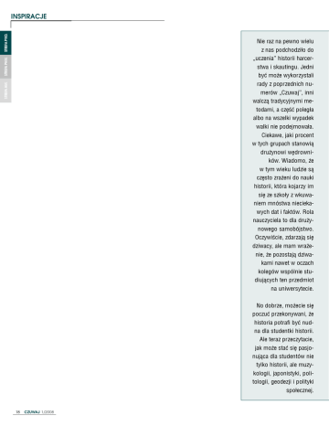 STREFA PWD. INSPIRACJE STREFA PHM. „uczenia” historii harcerstwa i skautingu. Jedni byæ mo¿e wykorzystali STREFA HM. Nie raz na pewno wielu z nas podchodzi³o do rady z poprzednich numerów „Czuwaj”, inni walcz¹ tradycyjnymi metodami, a czêœæ poleg³a albo na wszelki wypadek walki nie podejmowa³a. Ciekawe, jaki procent w tych grupach stanowi¹ dru¿ynowi wêdrowników. Wiadomo, ¿e w tym wieku ludzie s¹ czêsto zra¿eni do nauki historii, która kojarzy im siê ze szko³y z wkuwaniem mnóstwa nieciekawych dat i faktów. Rola nauczyciela to dla dru¿ynowego samobójstwo. Oczywiœcie, zdarzaj¹ siê dziwacy, ale mam wra¿enie, ¿e pozostaj¹ dziwakami nawet w oczach kolegów wspólnie studiuj¹cych ten przedmiot na uniwersytecie. No dobrze, mo¿ecie siê poczuæ przekonywani, ¿e historia potrafi byæ nudna dla studentki historii. Ale teraz przeczytacie, jak mo¿e staæ siê pasjonuj¹ca dla studentów nie tylko historii, ale muzykologii, japonistyki, politologii, geodezji i polityki spo³ecznej. 18 CZUWAJ 1/2008 PASJE I ROZWÓJ BYÆ JAK Motywacji „ci u nas dostatek”, oto zestaw argumentów: dla siebie, dla Elaine (wspomniana wy¿ej skautka), dla Alana (to on przechowywa³ Strza³ê); dla BadenPowella; dla frajdy; dla satysfakcji (ka¿dy z nas ju¿ j¹ czuje, gdy wyobra¿a sobie nasze zdjêcie ze Strza³¹); dla historii; dla harcerstwa; dla skautingu; dla zasady; dla Muzeum Harcerstwa, dla s³awy. STREFA PHM. sie, a przede wszystkim podzielimy siê zdobyt¹ wiedz¹ i zapa³em. STREFA PWD. POSZUKIWACZE ZAGINIONEJ STRZA£Y BOD¯CE ZEWNÊTRZNE Sierpieñ 2007 – podczas pobytu w Salisbury w Anglii zaprzyjaŸniona skautka przychodzi do nas i zadaje kluczowe pytanie: „Czy wiecie, gdzie jest Z³ota Strza³a?”. Speszeni, nie mamy pojêcia, o czym mówi, a ona wyjaœnia nam (jakby to by³o oczywiste), ¿e sam Robert Baden-Powell przekaza³ j¹ Polakom na Trzecim Œwiatowym Jamboree w 1929 r. Ma znajomego skauta, który przechowywa³ Strza³ê przez pewien czas, kiedy znajdowa³a siê w Anglii, miêdzy drug¹ wojn¹ œwiatow¹ a powrotem ZHP do WOSM. Oni wiedz¹, ¿e Strza³a jest gdzieœ w Polsce, bo na pewno zosta³a przekazana harcerzom, ale nie ma jej w Muzeum Harcerstwa i bêd¹c w Polsce, nie mogli jej znaleŸæ. Myœla³a, ¿e mo¿e my coœ wiemy, i prosi, ¿ebyœmy dali jej znaæ, jak siê zorientujemy. Przynios³a skan zdjêcia, na którym dwóch harcerzy trzyma Strza³ê. STREFA HM. INDIANA JONES Strza³y jeszcze nie odnaleŸliœmy, ale w trakcie poszukiwañ uda³o nam siê ju¿ zorientowaæ, ¿e jest niezwyk³a. Prze¿ywaliœmy okres zw¹tpienia, gdy mieliœmy wra¿enie, ¿e, poza Elaine i nami, œwiat nic o Strzale nie wie, podejrzewaliœmy wrêcz spisek! Mieliœmy te¿ chwile euforii, gdy dostaliœmy list z Anglii, ¿e w 2000 r. Strza³a wisia³a w G³ównej Kwaterze. Dziœ ju¿ nie wisi – poszukiwania trwaj¹. Takie doœwiadczenie jest dla nas czymœ zupe³nie nowym i fenomenalnym. Czujemy siê jak detektywi, tropi¹c Strza³ê, która wci¹¿ jest tu¿ obok, ale siê wymyka. Poznajemy nowych ludzi i na nowo przekonujemy siê, ¿e jest jakaœ wspólna energia, która ³¹czy wszystkich harcerzy i skautów. Buszujemy w starych ksiêgach, w listach, relacjach, w dodatku w dwóch jêzykach. Wspó³pracujemy ze sob¹, czuj¹c wspólnotê Strza³y. Bo historia te¿ jest gr¹! Jeœli macie jakieœ materia³y mog¹ce nas wspomóc w realizacji zadañ, które sobie postawiliœmy – prosimy o kontakt: [email protected]. Interesuje nas w³aœciwie wszystko, co jest zwi¹zane ze Strza³¹. Nawet sama informacja, ¿e w Waszym œrodowisku jej historia jest znana. BOD¯CE WEWN¥TRZ GRUPY Sierpieñ 2007 – kolejny kluczowy tekst pada z naszej strony – „Ona na serio jest drewniana? Wygl¹da na tekturow¹…”. Ogl¹damy zdjêcie z nadziej¹, ¿e coœ z niego ·· wyczytamy. Stare mundury, ¿a³oba na krzy¿u – mo¿e po PWD. KATARZYNA DZIÊCIO£OWSKA Z HUFCA WARSZAWA OCHOTA druhu Mirowskim… Czy to skórzany sznur? NaramienZESPÓ£: EWA, PAWE£, MICHA£, PIOTR I WOJTEK nik wêdrowniczy? Chusta jest czarna albo granatowa Z HUFCA WARSZAWA ¯OLIBORZ z ¿ó³t¹ obwódk¹. I te niemodne ju¿ dzisiaj okulary… Po PATRONAT HONOROWY NAD AKCJ¥ „odczytaniu” znaków podejmujemy decyzjê: SPRAWUJE MUZEUM HARCERSTWA musimy j¹ znaleŸæ! Ka¿dy z nas zacz¹³ sobie wyobra¿aæ, jak Strza³a dok³adnie wygl¹da, gdzie mo¿e siê znajdowaæ, jak bêdzie wygl¹GOLDEN ARROW – Z£OTA STRZA£A daæ na œcianie w Muzeum… Nasz skarb… Styczeñ 2008 – teraz, a minê³o prawie pó³ roku od pocz¹tku tej historii, ka¿dy kolejny tekst okazuje siê kluczowym, zanim nie pojawi siê nastêpny. Realizujemy próbê na Wêdrowniczy Znak S³u¿by Pamiêci. Mamy pakiet ambitnych zadañ do wykonania. Nie tylko znajdziemy Strza³ê, ale stworzymy publikacjê na jej temat, przygotujemy wystawê, poznamy dog³êbnie historiê harcerstwa i skautingu w tamtym okre- Jest to drewniana strza³a d³ugoœci ok. 30–40 cm. Symbol pokoju i braterstwa. Trasa lotu, któr¹ uda³o nam siê dotychczas ustaliæ: · · · · Trzecie Œwiatowe Jamboree w Arrowe Park – 1929 r. gen. Robert Baden-Powell wypuszcza Z³ote Strza³y na cztery strony œwiata – w tym jedna trafia w rêce Polaków. Druga wojna œwiatowa – Strza³a trafia z powrotem do Anglii wraz z ¿o³nierzem – przedwojennym harcerzem, by tam by³a bezpieczna. W czasach PRL-u przele¿a³a u angielskich skautów (m.in. u Alana), by³y podejmowane próby przekazania jej Polakom. W 1996 r. w czasie zlotu „Brytyjscy Partnerzy” nad Wis³¹ zosta³a przekazana (na proœbê Alana) polskim harcerzom. CZUWAJ 1/2008 19