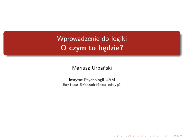 Wprowadzenie do logiki O czym to będzie? Mariusz Urbański Instytut Psychologii UAM [email protected] Dwa fundamentalne pytania: Czym zajmuje się logika? Czym my się zajmować będziemy? amu kognitywistyka, rok I (IP UAM) Wprowadzenie do logiki 2/6 Logika (w sensie tak szerokim, jak to tylko możliwe) to nauka o języku jako systemie znaków słownych. Jej trzy zasadnicze działy to: semiotyka nauka o znakach, w szczególności znakach słownych metodologia nauk zajmuje się badaniem metod poznawania świata, a zwłaszcza uzasadnianiem twierdzeń logika formalna nauka o związkach między wartościami logicznymi zdań, zachodzącymi ze względu na ich budowę amu kognitywistyka, rok I (IP UAM) Wprowadzenie do logiki 3/6 Logika (w sensie tak szerokim, jak to tylko możliwe) to nauka o języku jako systemie znaków słownych. Jej trzy zasadnicze działy to: semiotyka nauka o znakach, w szczególności znakach słownych metodologia nauk zajmuje się badaniem metod poznawania świata, a zwłaszcza uzasadnianiem twierdzeń logika formalna nauka o związkach między wartościami logicznymi zdań, zachodzącymi ze względu na ich budowę amu kognitywistyka, rok I (IP UAM) Wprowadzenie do logiki 3/6 Czym będziemy się zajmować? z zakresu semiotyki: znak, język, kategorie syntaktyczne wyrażeń, nazwy, definicje, pytania, wnioskowania konwersacyjne, implikatury z zakresu metodologii nauk: klasyfikacja rozumowań, sposoby uzasadniania twierdzeń z zakresu logiki formalnej: elementy rachunków: zdań i predykatów oraz sylogistyki, pojęcie wynikania, klasyfikacja rozumowań amu kognitywistyka, rok I (IP UAM) Wprowadzenie do logiki 4/6 Z czego będziemy korzystać? Ajdukiewicz, K. (1975), Logika pragmatyczna, Warszawa: PWN. Tokarz, M. (1993), Elementy pragmatyki logicznej, Warszawa: PWN. Stanosz, B. (1998), Ćwiczenia z logiki, Warszawa: PWN. Ziembiński, Z. (2003), Logika praktyczna, Warszawa: PWN. Żarnecka-Biały, E. (1999), Mała logika, Kraków: Wyd. UJ. Żarnecka-Biały, E. (1998), Z historii logiki dawniejszej, Kraków: Wyd. UJ. http://logika.wikidot.com amu kognitywistyka, rok I (IP UAM) Wprowadzenie do logiki 5/6 Czym nie będziemy się zajmować? historią logiki (choć jest fascynująca); drobiazgową analizą pojęć i teorii (stary dylemat oracza, a poza tym, jak wiadomo, „Wprowadzenia...” zwykle kłamią); tym co najciekawsze , (czyli współczesną logiką formalną i językoznawstwem; na to przyjdzie czas nieco później – najpierw trzeba się obsługi narzędzi nauczyć). amu kognitywistyka, rok I (IP UAM) Wprowadzenie do logiki 6/6