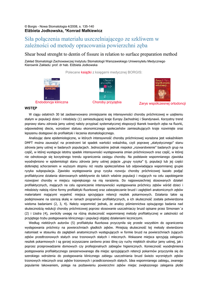 © Borgis - Nowa Stomatologia 4/2008, s. 135-140 Elżbieta Jodkowska, *Konrad Małkiewicz Siła połączenia materiału uszczelniającego ze szkliwem w zależności od metody opracowania powierzchni zęba Shear boud strenght to dentin of fissure in relation to surface preparation method Zakład Stomatologii Zachowawczej Instytutu Stomatologii Warszawskiego Uniwersytetu Medycznego Kierownik Zakładu: prof. dr hab. Elżbieta Jodkowska Polecane książki z księgarni medycznej BORGIS: Endodoncja kliniczna Choroby przyzębia Zarys współczesnej ortodoncji WSTĘP W ciągu ostatnich 30 lat zaobserwowano zmniejszanie się intensywności choroby próchnicowej w uzębieniu stałym w populacji dzieci i młodzieży (1) zamieszkującej kraje Europy Zachodniej i Skandynawii. Korzystny trend poprawy stanu zdrowia jamy ustnej należy przypisać systematycznej ekspozycji tkanek twardych zęba na fluorki, odpowiedniej diecie, wzrostowi statusu ekonomicznego społeczeństw zamieszkujących kraje rozwinięte oraz lepszemu dostępowi do profilaktyki i leczenia stomatologicznego. Analizując dane epidemiologiczne, w których intensywność choroby próchnicowej wyrażona jest wskaźnikiem DMFT można zauważyć na przestrzeni lat spadek wartości wskaźnika, czyli poprawę „statystycznego” stanu zdrowia jamy ustnej w badanych populacjach. Jednocześnie jednak niepokoi „rozwarstwienie” badanych grup na część, w której występuje istotny spadek intensywności występowania zmian próchnicowych oraz część, w której nie odnotowuje się korzystnego trendu ograniczenia zasięgu choroby. Na podstawie wspomnianego zjawiska wyodrębniono w epidemiologii stanu zdrowia jamy ustnej pojęcie „grupy ryzyka” tj. populacji lub jej części dotkniętej schorzeniem w wyższym stopniu niż reszta społeczeństwa lub odpowiadająca wspomnianej grupie ryzyka subpopulacja. Zjawisko występowania grup ryzyka rozwoju choroby próchnicowej kazało podjąć profilaktyczne działania skierowanych selektywnie do takich właśnie populacji i mających na celu zapobieganie rozwojowi choroby w miejscu największego na nią narażenia. Do najpowszechniej stosowanych działań profilaktycznych, mających na celu ograniczenie intensywności występowania próchnicy zębów wśród dzieci i młodzieży należą różne formy profilaktyki fluorkowej oraz zabezpieczanie bruzd i zagłębień anatomicznych zębów materiałami mającymi wypełnić miejsca sprzyjające retencji resztek pokarmowych. Działania takie są podejmowane na szerszą skalę w ramach programów profilaktycznych, a ich skuteczność została potwierdzona wieloma badaniami (2, 3, 4). Należy wspomnieć jednak, że analizy piśmiennictwa opisującego badania nad skutecznością redukcji choroby próchnicowej poprzez stosowanie uszczelniaczy bruzd opisane przez Simonsen´a (2) i Llodra (4), zwróciły uwagę na różną skuteczność wspomnianej metody profilaktycznej w zależności od przyjętego trybu postępowania klinicznego i populacji objętej działaniami leczniczymi. Według niektórych autorów (5) profilaktyka fluorkowa przyczyniła się przede wszystkim do ograniczenia występowania próchnicy na powierzchniach gładkich zębów. Mniejszą skuteczność tej metody stwierdzono natomiast w stosunku do zagłębień anatomicznych występujących w formie bruzd na powierzchniach żujących zębów przedtrzonowych stałych oraz trzonowych stałych i mlecznych. Wskazane miejsca sprzyjają zaleganiu resztek pokarmowych i są gorzej oczyszczane zarówno przez ślinę czy ruchy miękkich struktur jamy ustnej, jak i poprzez przeprowadzanie domowych czy profesjonalnych zabiegów higienicznych. Konieczność wyodrębnienia postępowania profilaktycznego zarezerwowanego dla miejsc sprzyjających retencji pokarmów przyczyniła się do szerokiego wdrożenia do postępowania klinicznego zabiegu uszczelniania bruzd świeżo wyrzniętych zębów trzonowych mlecznych oraz zębów trzonowych i przedtrzonowych stałych. Idea wspomnianego zabiegu, zwanego popularnie lakowaniem, polega na pozbawieniu powierzchni zębów miejsc zwiększonego zalegania płytki bakteryjnej oraz pozbawienia bytującej na dnie szczelin anatomicznych drobnoustrojów substratów pokarmowych niezbędnych do syntezy działających kariogennie metabolitów. Uszczelniacze bruzd są półpłynnymi substancjami należącymi do różnych grup materiałowych, wśród których najczęściej wymieniane są: materiały oparte na żywicach Bis-GMA wzmocnione lub nie cząstkami wypełniacza oraz w niektórych przypadkach wzbogacone zawartością fluoru, cementy szkło-jonomerowe konwencjonalne lub modyfikowane żywicą HEMA oraz cementy wzmocnione opiłkami srebra (tzw. cermety). W zależności od typu materiału po aplikacji na powierzchnię zęba są utwardzane z wykorzystaniem światła lampy polimeryzacyjnej lub na drodze reakcji chemicznej zachodzącej po zmieszaniu tworzących je past. Wśród wielu czynników mających wpływ na długoterminową skuteczność profilaktycznego uszczelnienia zębów szczególną uwagę należy zwrócić na szczelność zaaplikowanego materiału w odniesieniu do powierzchni zabezpieczonego zęba. Istnienie szczeliny pomiędzy naniesionym materiałem a szkliwem nie tylko nie hamuje inwazji bakterii w głąb bruzd zęba, ale dodatkowo utrudnia diagnostykę zmian próchnicowych rozwijających się pod materiałem (5, 6). Na szczelne połączenie uszczelniacza z tkankami zęba wpływa nie tylko rodzaj materiału ale także technika przygotowania szkliwa przed aplikacją materiału. Nie ulega wątpliwości, że istotne znaczenie dla powodzenia zabiegu ma oczyszczenie powierzchni zęba z płytki bakteryjnej. W piśmiennictwie znajdujemy również doniesienia o zwiększeniu stopnia retencji materiału uszczelniającego na skutek wytrawiania szkliwa roztworem kwasu (cyt. za 1, 7) Zarówno rodzaj stosowanego kwasu, czas aplikacji oraz jego stężenie mają znaczny wpływ na s