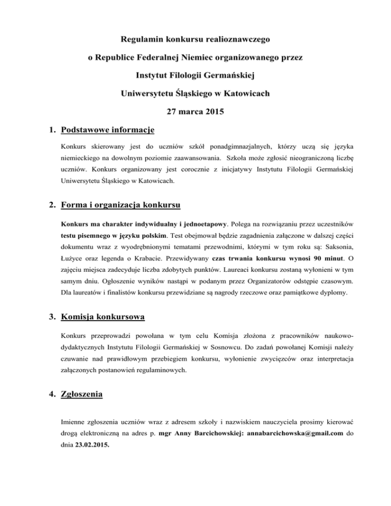Regulamin konkursu realioznawczego o Republice Federalnej Niemiec organizowanego przez Instytut Filologii Germańskiej Uniwersytetu Śląskiego w Katowicach 27 marca 2015 1. Podstawowe informacje Konkurs skierowany jest do uczniów szkół ponadgimnazjalnych, którzy uczą się języka niemieckiego na dowolnym poziomie zaawansowania. Szkoła może zgłosić nieograniczoną liczbę uczniów. Konkurs organizowany jest corocznie z inicjatywy Instytutu Filologii Germańskiej Uniwersytetu Śląskiego w Katowicach. 2. Forma i organizacja konkursu Konkurs ma charakter indywidualny i jednoetapowy. Polega na rozwiązaniu przez uczestników testu pisemnego w języku polskim. Test obejmował będzie zagadnienia załączone w dalszej części dokumentu wraz z wyodrębnionymi tematami przewodnimi, którymi w tym roku są: Saksonia, Łużyce oraz legenda o Krabacie. Przewidywany czas trwania konkursu wynosi 90 minut. O zajęciu miejsca zadecyduje liczba zdobytych punktów. Laureaci konkursu zostaną wyłonieni w tym samym dniu. Ogłoszenie wyników nastąpi w podanym przez Organizatorów odstępie czasowym. Dla laureatów i finalistów konkursu przewidziane są nagrody rzeczowe oraz pamiątkowe dyplomy. 3. Komisja konkursowa Konkurs przeprowadzi powołana w tym celu Komisja złożona z pracowników naukowodydaktycznych Instytutu Filologii Germańskiej w Sosnowcu. Do zadań powołanej Komisji należy czuwanie nad prawidłowym przebiegiem konkursu, wyłonienie zwycięzców oraz interpretacja załączonych postanowień regulaminowych. 4. Zgłoszenia Imienne zgłoszenia uczniów wraz z adresem szkoły i nazwiskiem nauczyciela prosimy kierować drogą elektroniczną na adres p. mgr Anny Barcichowskiej: [email protected] do dnia 23.02.2015. 5. Zakres tematyczny Podstawowe dane geopolityczne (geografia, państwa związkowe i ich stolice, system partyjny, struktura państwa); Społeczeństwo; Tradycje i obyczaje, święta narodowe; Saksonia; Łużyce (Lausitz) – położenie geograficzne, historia, język i kultura; Legenda o Krabacie – treść, historia powstania, ekranizacja; Osobistości związane z Saksonią: Friedrich Nietzsche Richard Wagner Friedrich August I. der Starke 6. Proponowana literatura Bęza, S. (2004): Eine kleine Landeskunde deutschsprachiger Länder. Warszawa: WSiP. Białecki, A., Kromp, I. (2012): Deutschland in allen Facetten. Bielsko-Biała: Park Edukacja. Kappler, A. (2003): Tatsachen über Deutschland. Frankfurt/Main: Societäts-Verlag. Matecki, U. (2001): Dreimal Deutsch. Stuttgart: Klett. Pietraszek, K. (2012): Österreich, die Schweiz, Liechtenstein und Luxemburg in allen Facetten. Bielsko-Biała: Park Edukacja. Scholl, J. (2007): 50 Klassiker. Deutsche Schriftsteller. Hildesheim: Gerstenberg Verlag. Schuh, B. (2008): 50 Klassiker. Naturwissenschaftler. Hildesheim: Gerstenberg Verlag. Wachowska, H. (2007): Feste und Bräuche der DACHL-Länder. Święta i zwyczaje w krajach niemieckojęzycznych. Warszawa: Wydawnictwo Szkolne PWN. 7. Źródła internetowe Łużyce: www.lausitz.de/de/kulturregion.html www.bautzen.de/dokumente/Kurzimage_Bautzen_polnisch.pdf www.bautzen.de/dokumente/Brosch%C3%BCre_Sorben.pdf www.oberlausitz.com/shop/default.aspx Legenda o Krabacie: Informacje dotyczące ekranizacji: www.filmweb.pl/film/Ucze%C5%84+czarnoksi%C4%99%C5%BCnika-2008-323371 Obszerny projekt o Krabacie (zawiera materiały dla nauczycieli): http://opus.kobv.de/ubp/volltexte/2008/2731/pdf/zfl_krabat_iii.pdf Pierwotna wersja legendy: www.krabatregion.de/index.php?id=910