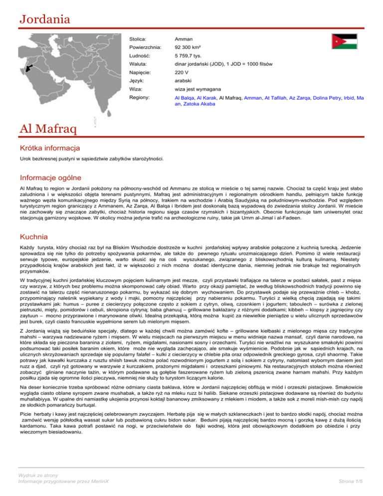 Jordania Stolica: Amman Powierzchnia: 92 300 km² Ludność: 5 759,7 tys. Waluta: dinar jordański (JOD), 1 JOD = 1000 filsów Napięcie: 220 V Język: arabski Wiza: wiza jest wymagana Regiony: Al Balqa, Al Karak, Al Mafraq, Amman, At Tafilah, Az Zarqa, Dolina Petry, Irbid, Ma an, Zatoka Akaba Al Mafraq Krótka informacja Urok bezkresnej pustyni w sąsiedztwie zabytków starożytności. Informacje ogólne Al Mafraq to region w Jordanii położony na północny-wschód od Ammanu ze stolicą w mieście o tej samej nazwie. Chociaż ta część kraju jest słabo zaludniona i w większości objęta terenami pustynnymi, Mafraq jest administracyjnym i regionalnym ośrodkiem handlu, pełniącym także funkcję ważnego węzła komunikacyjnego między Syrią na północy, Irakiem na wschodzie i Arabią Saudyjską na południowym-wschodzie. Pod względem turystycznym region graniczący z Ammanem, Az Zarqa, Al Balqa i Ibridem jest doskonałą bazą wypadową do zwiedzania stolicy Jordanii. W mieście nie zachowały się znaczące zabytki, chociaż historia regionu sięga czasów rzymskich i bizantyjskich. Obecnie funkcjonuje tam uniwersytet oraz stacjonują garnizony wojskowe. W okolicy można jedynie trafić na archeologiczne ruiny, takie jak Umm al-Jimal i al-Fadeen. Kuchnia Każdy turysta, który chociaż raz był na Bliskim Wschodzie dostrzeże w kuchni jordańskiej wpływy arabskie połączone z kuchnią turecką. Jedzenie sprowadza się nie tylko do potrzeby spożywania pokarmów, ale także do pewnego rytuału urozmaicającego dzień. Pomimo iż wiele restauracji serwuje typowe, europejskie jedzenie, warto skusić się na coś wyszukanego, związanego z bliskowschodnią kulturą kulinarną. Niestety przypadłością krajów arabskich jest fakt, iż w większości z nich można dostać identyczne dania, niemniej jednak nie brakuje też regionalnych przysmaków. W tradycyjnej kuchni jordańskiej kluczowym pojęciem kulinarnym jest mezze, czyli przystawki trafiające na talerze w postaci sałatek, past z mięsa czy warzyw, z których bez problemu można skomponować cały obiad. Warto przy okazji pamiętać, że według bliskowschodnich tradycji powinno się zostawić na talerzu część nienaruszonego pokarmu, by wykazać się dobrym wychowaniem. Do przystawek podaje się przeważnie chleb – khobz, przypominający naleśnik wypiekany z wody i mąki, pomocny najczęściej przy nabieraniu pokarmu. Turyści z wielką chęcią zajadają się takimi przystawkami jak: humus – puree z ciecierzycy połączone często z sokiem z cytryn, oliwą, czosnkiem i jogurtem; taboulech – surówka z zielonej pietruszki, mięty, pomidorów i cebuli, skropiona cytryną; baba ghanuuj – grillowane bakłażany z różnymi dodatkami; kibbeh – klopsy z jagnięciny czy zaytuun – mocno przyprawione i marynowane oliwki. Idealną przekąską, którą można kupić za niewielkie pieniądze u wielu ulicznych sprzedawców jest burek, czyli ciasto francuskie wypełnione serem lub mielonym mięsem. Z Jordanią wiążą się beduińskie specjały, dlatego w każdej chwili można zamówić kofte – grillowane kiełbaski z mielonego mięsa czy tradycyjne mahshi – warzywa nadziewane ryżem i mięsem. W wielu miejscach na pierwszym miejscu w menu widnieje nazwa mansaf, czyli danie narodowe, na które składa się pieczona baranina z ziołami, ryżem, migdałami, nasionami sosny i orzechami. Turyści nie wrażliwi na wyszukane smakołyki powinni podsumować taki posiłek baranim okiem, które może nie wygląda zachęcająco, ale smakuje wyśmienicie. Podobnie jak w sąsiednich krajach, na ulicznych skrzyżowaniach sprzedaje się popularny falafel – kulki z ciecierzycy w chlebie pita oraz odpowiednik greckiego gyrosa, czyli shaormę. Takie potrawy jak kawałki kurczaka z rusztu shiish tawuk można polać rozwodnionym jogurtem z solą i sokiem z cytryny, natomiast wybornym daniem jest ruzz a djad, czyli ryż gotowany w warzywie z kurczakiem, prażonymi migdałami i orzeszkami piniowymi. Na restauracyjnych stołach można również zobaczyć gliniane naczynie tażin, w którym podawane są gołębie faszerowane ryżem lub zieloną pszenicą zwane hamam mahshi. Przy każdym posiłku zjada się ogromne ilości pieczywa, niemniej nie służy to turystom liczącym kalorie. Na deser koniecznie trzeba spróbować różne odmiany ciasta baklava, które w Jordanii najczęściej obfitują w miód i orzeszki pistacjowe. Smakowicie wygląda ciasto oblane syropem zwane mushabak, a także ryż na mleku ruzz bi haliib. Siekane orzeszki pistacjowe dodawane są również do budyniu muhallabiyya. W upalne dni namiastkę ukojenia przynosi koktajl bananowy zmiksowany z mlekiem i miodem, a także sok z moreli mish-mish czy napój ze słodkich pomarańczy burtuqal. Picie herbaty i kawy jest najczęściej celebrowanym zwyczajem. Herbatę pija się w małych szklaneczkach i jest to bardzo słodki napój, chociaż można zamówić wersję półsłodką wassat sukar lub pozbawioną cukru bidon sukar. Beduini pijają najczęściej bardzo mocną i gorzką kawę z dużą ilością kardamonu. Taka kawa potrafi postawić na nogi, w przeciwieństwie do fajki wodnej, która jest obowiązkowym dodatkiem po obiedzie i przy wieczornym biesiadowaniu. Wydruk ze strony Informacje przygotowane przez MerlinX Strona 1/5 Obyczaje Mieszkańcy Bliskiego Wschodu są wyczuleni na punkcie dobrych manier, dlatego warto żyć z nimi w zgodzie i bez powodu nie narażać się na niepotrzebne nieprzyjemności. Dla utrzymania dobrych stosunków z przemiłymi mieszkańcami tego kraju wchodząc do baru, sklepu czy też wsiadając do taksówki z uprzejmości można przywitać się zwrotem „salem alejkum” (pokój z tobą/wami). Liczna i udana rodzina to powód do dumy, dlatego w trakcie rozmowy na ten temat nie należy być skrępowanym, a nawet dopytywać się o stan zdrowia i samopoczucie najbliższych. Podróżując po jordańskich miastach można zauważyć wyraźny p