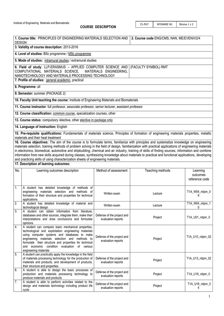 Institute of Engineering Materials and Biomaterials COURSE DESCRIPTION Z1-PU7 WYDANIE N1 Strona 1 z 2 1. Course title: PRINCIPLES OF ENGINEERING MATERIALS SELECTION AND 2. Course code ENG/CMS, NAN, ME/EVEN/II/2/4 DESIGN 3. Validity of course description: 2013-2016 4. Level of studies: BSc programme / MSc programme 5. Mode of studies: intramural studies / extramural studies 6. Field of study: LLP-ERASMUS – APPLIED COMPUTER SCIENCE AND (FACULTY SYMBOL) RMT COMPUTATIONAL MATERIALS SCIENCE, MATERIALS ENGINEERING, NANOTECHNOLOGY AND MATERIALS PROCESSING TECHNOLOGY 7. Profile of studies: general academic, practical 8. Programme: all 9. Semester: summer (PACKAGE 2) 10. Faculty Unit teaching the course: Institute of Engineering Materials and Biomaterials 11. Course instructor: full professor, associate professor, senior lecturer, assistant professor 12. Course classification: common course, specialization courses, other 13. Course status: compulsory /elective, other elective in package only 14. Language of instruction: English 15. Pre-requisite qualifications: Fundamentals of materials science, Principles of formation of engineering materials properties, metallic materials and their heat treatment 16. Course objectives: The aim of the course is to formulate terms, familiarize with principles and systematize knowledge on engineering materials selection, training methods of problem solving in the field of design, familiarization with practical applications of engineering materials in electronics, biomedical, automotive and shipbuilding, chemical and air industry, training of skills of finding sources, information and combine information from new skills acquired during classes, synthesizing knowledge about materials to practical and functional applications, developing and practicing skills of using characterization sheets of engineering materials. 17. Description of learning outcomes: No. 1. 2. 3. 4. 5. 6. 7. Learning outcomes description 1A student has detailed knowledge of methods of . engineering materials selection and methods of formation of their structure and properties for technical applications 2A student has detailed knowledge of material and . technological design 3A student can obtain information from literature, . databases and other sources, integrate them, make their interpretations and draw conclusions and formulate opinions 4A student can compare basic mechanical properties, . technological and exploitation engineering materials using computer systems and databases to make engineering materials selection and methods to formulate their structure and properties for technical and economic condition evaluation of various engineering materials 5A student can practically apply the knowledge in the field . of materials processing technology for the production of materials and products, and development of products, their structure and properties 6A student is able to design the basic processes of . production and materials processing technology to produce materials and products 7A student is able to perform activities related to the . design and materials technology including product life cycle Method of assessment Teaching methods Learning outcomes reference code Written exam Lecture T1A_W04_nitpm_0 9 Written exam Lecture T1A_W04_nitpm_1 0 Defense of the project and evaluation reports Project T1A_U01_nitpm_0 Defense of the project and evaluation reports Project Defense of the project and evaluation reports Project Defense of the project and evaluation reports Project T1A_U16_nitpm_0 Defense of the project and evaluation reports Project T1A_U16_nitpm_0 4 T1A_U10_nitpm_02 T1A_U13_nitpm_02 1 A student can think and act in a creative and 8 enterprising way 18. Teaching modes and hours 8. Defense of the project and evaluation reports Project T1A_K06_nitpm_01 Lecture / BA /MA Seminar / Class / Project / Laboratory 15 h lectures, 15 h project 19. Syllabus description: Lecture: Designing materials as an inseparable part of product engineering design - elements of engineering design, structural design, working out shape geometric charactersitic of products to fulfill human needs, materials design, to ensure the required durability of a product or its components made from materials with the required properties of engineering technology, design technology to give required properties of individual elements of a product. Technical design and its structure: the formulation and analysis of the problem, looking for ideas, evaluation and selection of solutions. Aspects of engineering design influencing materials selections for products and their elements - functional aspects of engineering design, product life cycle analysis, sociological, ecological and economic factors of design. Main factors determining the selection of engineering materials in engineering design. Main groups of non-metallic materials and the characterization of their properties in the application of the products and their elements - metals and their alloys, polymeric materials, ceramic, composite materials, shape memory alloys, metallic glasses. Project: Getting to know the process of design and material groups used in engineering practice and their properties.Materials selection for a chosen item, taking into account key factors determining its application. 20. Examination: YES, NO 21. Primary sources: 1. Dobrzański L.A.: Zasady doboru materiałów inżynierskich z kartami charakterystyk, wyd. II, Wyd. Pol. Śląskiej, 2001. 2. Dobrzański L.A.: Podstawy nauki o materiałach i metaloznawstwo. Materiały inżynierskie z podstawami projektowania materiałowego, WNT, Warszawa, 2002. 3. Dobrzański L.A.: Metalowe materiały inżynierskie, WNT, Warszawa, 2004. 4. Dobrzański L.A.: Podstawy kształtowania struktury i własności materiałów metalowych, Wyd. Pol. Śląskiej, Gliwice, 2007. 5. Ciszewski B., Przetakiewicz W.: Nowoczesne materiały w technice, Wyd. Bellona, Warszawa, 1993. 22. Secondary sources: 1. Ashby M.F.: Dobór mater