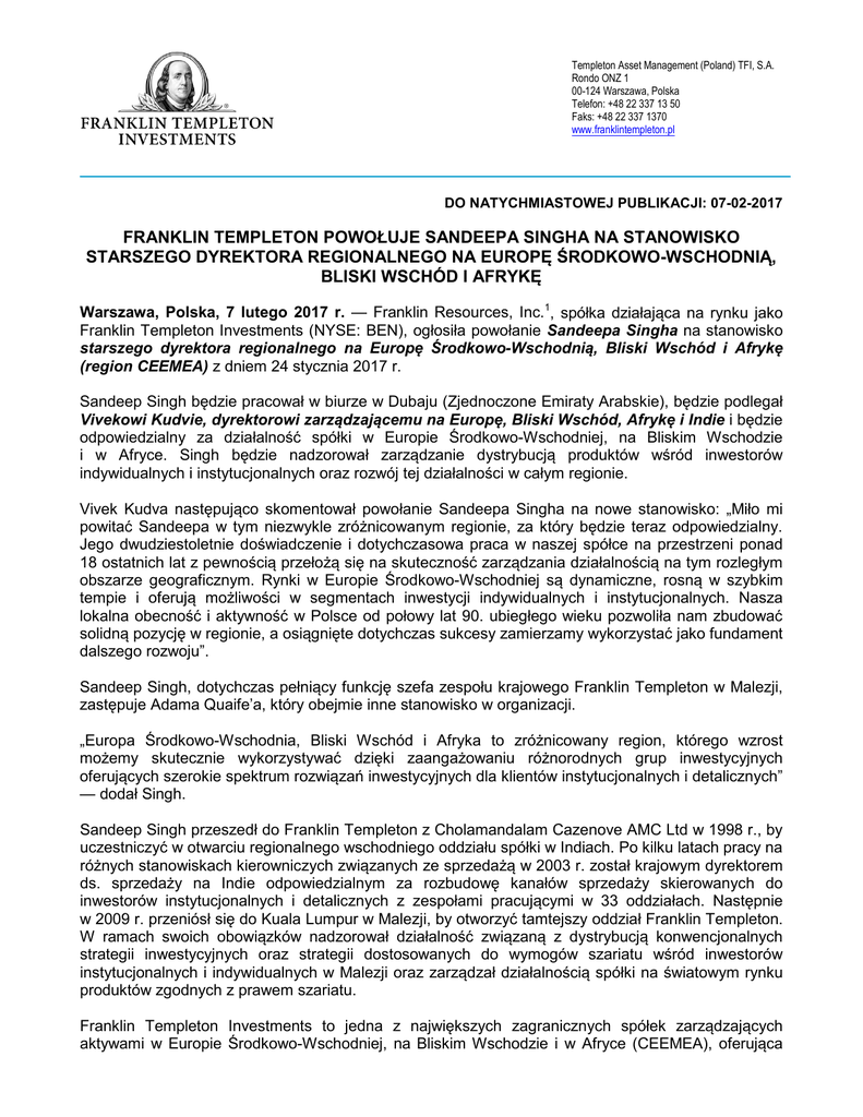 Templeton Asset Management (Poland) TFI, S.A. Rondo ONZ 1 00-124 Warszawa, Polska Telefon: +48 22 337 13 50 Faks: +48 22 337 1370 www.franklintempleton.pl DO NATYCHMIASTOWEJ PUBLIKACJI: 07-02-2017 FRANKLIN TEMPLETON POWOŁUJE SANDEEPA SINGHA NA STANOWISKO STARSZEGO DYREKTORA REGIONALNEGO NA EUROPĘ ŚRODKOWO-WSCHODNIĄ, BLISKI WSCHÓD I AFRYKĘ Warszawa, Polska, 7 lutego 2017 r. — Franklin Resources, Inc.1, spółka działająca na rynku jako Franklin Templeton Investments (NYSE: BEN), ogłosiła powołanie Sandeepa Singha na stanowisko starszego dyrektora regionalnego na Europę Środkowo-Wschodnią, Bliski Wschód i Afrykę (region CEEMEA) z dniem 24 stycznia 2017 r. Sandeep Singh będzie pracował w biurze w Dubaju (Zjednoczone Emiraty Arabskie), będzie podlegał Vivekowi Kudvie, dyrektorowi zarządzającemu na Europę, Bliski Wschód, Afrykę i Indie i będzie odpowiedzialny za działalność spółki w Europie Środkowo-Wschodniej, na Bliskim Wschodzie i w Afryce. Singh będzie nadzorował zarządzanie dystrybucją produktów wśród inwestorów indywidualnych i instytucjonalnych oraz rozwój tej działalności w całym regionie. Vivek Kudva następująco skomentował powołanie Sandeepa Singha na nowe stanowisko: „Miło mi powitać Sandeepa w tym niezwykle zróżnicowanym regionie, za który będzie teraz odpowiedzialny. Jego dwudziestoletnie doświadczenie i dotychczasowa praca w naszej spółce na przestrzeni ponad 18 ostatnich lat z pewnością przełożą się na skuteczność zarządzania działalnością na tym rozległym obszarze geograficznym. Rynki w Europie Środkowo-Wschodniej są dynamiczne, rosną w szybkim tempie i oferują możliwości w segmentach inwestycji indywidualnych i instytucjonalnych. Nasza lokalna obecność i aktywność w Polsce od połowy lat 90. ubiegłego wieku pozwoliła nam zbudować solidną pozycję w regionie, a osiągnięte dotychczas sukcesy zamierzamy wykorzystać jako fundament dalszego rozwoju”. Sandeep Singh, dotychczas pełniący funkcję szefa zespołu krajowego Franklin Templeton w Malezji, zastępuje Adama Quaife’a, który obejmie inne stanowisko w organizacji. „Europa Środkowo-Wschodnia, Bliski Wschód i Afryka to zróżnicowany region, którego wzrost możemy skutecznie wykorzystywać dzięki zaangażowaniu różnorodnych grup inwestycyjnych oferujących szerokie spektrum rozwiązań inwestycyjnych dla klientów instytucjonalnych i detalicznych” — dodał Singh. Sandeep Singh przeszedł do Franklin Templeton z Cholamandalam Cazenove AMC Ltd w 1998 r., by uczestniczyć w otwarciu regionalnego wschodniego oddziału spółki w Indiach. Po kilku latach pracy na różnych stanowiskach kierowniczych związanych ze sprzedażą w 2003 r. został krajowym dyrektorem ds. sprzedaży na Indie odpowiedzialnym za rozbudowę kanałów sprzedaży skierowanych do inwestorów instytucjonalnych i detalicznych z zespołami pracującymi w 33 oddziałach. Następnie w 2009 r. przeniósł się do Kuala Lumpur w Malezji, by otworzyć tamtejszy oddział Franklin Templeton. W ramach swoich obowiązków nadzorował działalność związaną z dystrybucją konwencjonalnych strategii inwestycyjnych oraz strategii dostosowanych do wymogów szariatu wśród inwestorów instytucjonalnych i indywidualnych w Malezji oraz zarządzał działalnością spółki na światowym rynku produktów zgodnych z prawem szariatu. Franklin Templeton Investments to jedna z największych zagranicznych spółek zarządzających aktywami w Europie Środkowo-Wschodniej, na Bliskim Wschodzie i w Afryce (CEEMEA), oferująca szeroki wachlarz rozwiązań inwestycyjnych dla inwestorów detalicznych i instytucjonalnych. Po otwarciu pierwszego oddziału w regionie CEEMEA w Republice Południowej Afryki w 1995 r., spółka uruchomiła kolejne oddziały w Polsce (1997 r.) i Zjednoczonych Emiratach Arabskich (2000 r.), rozbudowując sieć Franklin Templeton obejmującą 35 oddziałów na całym świecie. -KONIEC- Uwagi dla redaktorów: 1. Franklin Resources, Inc. to globalna organizacja zarządzająca inwestycjami działająca na rynku jako Franklin Templeton Investments. Franklin Templeton Investments oferuje międzynarodowe i krajowe rozwiązania inwestorom indywidualnym, instytucjonalnym i rządowym z ponad 150 krajów. Dzięki połączonym kompetencjom różnych specjalistycznych zespołów spółka skutecznie zarządza wszystkimi klasami aktywów, m.in. akcjami, instrumentami o stałym dochodzie, inwestycjami alternatywnymi i indywidualnie projektowanymi produktami. Ponad 600 profesjonalnych inwestorów korzysta ze wsparcia zintegrowanego globalnego zespołu specjalistów ds. zarządzania ryzykiem oraz globalnej sieci tradingowej. Spółka z siedzibą w Kalifornii i oddziałami w 35 krajach ma ponad 65 lat doświadczenia w branży inwestycyjnej i zarządza aktywami o wartości sięgającej 720 mld USD (dane na dzień 31 grudnia 2016 r.). Jako wiodąca globalna organizacja zarządzająca inwestycjami spółka osiągnęła solidną pozycję w Europie Środkowo-Wschodniej (oddziały w Moskwie, Warszawie, Budapeszcie i Stambule). Pod przewodnictwem Viveka Kudvy, dyrektora zarządzającego odpowiedzialnego za Indie i region CEEMEA (Europa Środkowo-Wschodnia, Bliski Wschód, Afryka), Franklin Templeton oferuje luksemburskie fundusze FTIF i inne indywidualnie dostosowane rozwiązania inwestorom indywidualnym i instytucjonalnym z różnych krajów tego regionu, m.in. z Estonii, Łotwy, Litwy, Polski, Czech, Słowacji, Węgier, Słowenii i Rumunii. Niniejszy komunikat prasowy został sporządzony wyłącznie do celów informacyjnych i nie stanowi żadnego rodzaju profesjonalnej porady. Wszelkie informacje zawarte w niniejszym komunikacie prasowym zostały zebrane i opracowane przez Franklin Templeton Investments oraz zespoły zarządzających FTI z zachowaniem zasad profesjonalizmu i należytej staranności. Franklin Templeton Investments nie gwarantuje, że wszystkie informacje zawart