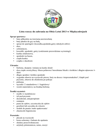 Lista rzeczy do zabrania na Obóz Letni 2013 w Międzyzdrojach Sprzęt sportowy: • buty piłkarskie na trawiastą nawierzchnię • buty płaskie do gry na halę, • sprzęt do sparingów (koszulka,spodenki,getry młodych orłów) • dres, • ochraniacze, • koszulki, spodenki, getry (codziennie przewidziane są treningi) • kurtka ortalionowa, • spodenki na basen, • ciepła kurtka • czapka z daszkiem Ubrania: • bielizna, skarpety /zmiana na każdy dzień/ • dwa ciepłe swetry,bluzy /bluza polarowa/ bawełniane bluzki z krótkim i długim rękawem /tshirt/ • długie spodnie i krótkie spodenki • wygodne obuwie na wycieczki piesze, buty na deszcz /nieprzemakalne!/, klapki pod prysznic, obuwie do chodzenia po pokoju • pidżama • ręczniki /2 standardowe i 1 kąpielowy/ • worek materiałowy na brudną bieliznę Środki czystości: • mydło w mydelniczce • żel pod prysznic • dezodorant, antyperspirant • szampon • pasta do zębów, szczoteczka do zębów • grzebień lub szczotka do włosów • środek do prania /małe opakowanie/ • chusteczki higieniczne Pozostałe: • plecak na wycieczki • krem ochronny i balsam do opalania • okulary przeciwsłoneczne • artykuły piśmiennicze, notes, zeszyt Dokumenty - ważna legitymacja szkolna, podbita na 2013 r., aktualne badania lekarskie Pieniądze - kieszonkowe do maksymalnie 200-300 złotych (w banknotach po 10, 20zł. w podpisanej kopercie) – pieniądze winny być zdeponowane u wychowawcy /Ci przekażą je do sejfu ośrodka/ w celu uniknięcia zgubienia lub kradzieży i przekazywane będą dzieciom na ich prośbę. Lekarstwa: jeżeli dziecko stale zażywa ( podpisane i z opisem dawkowania) (Dzieci z chorobą lokomocyjną zaopatrzyć w zapas Aviomarinu na wycieczki i powrót do domu (lek włożyć do koperty z pieniędzmi, w przypadku braku Aviomarinu, dziecko będzie musiało zakupić go ze swoich pieniędzy) NIE BIERZEMY ODPOWIEDZIALNOŚCI ZA BIŻUTERIĘ, APARATY FOTOGRAFICZNE, TELEFONY KOMÓRKOWE, MP-3 I MP-4, LAPTOPY ORAZ INNE URZĄDZENIA ELEKTRONICZNE - nie ma możliwości zdeponowania u wychowawców! Kontakt z dziećmi najlepiej poprzez opiekunów i trenerów :)