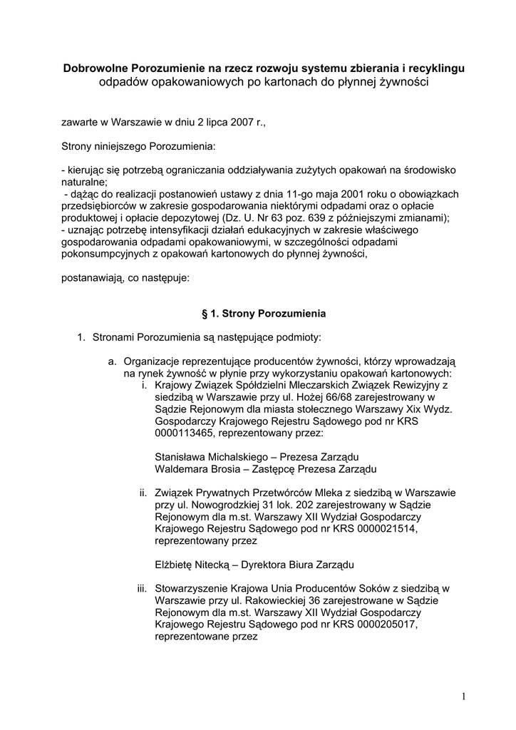 Dobrowolne Porozumienie na rzecz rozwoju systemu zbierania i recyklingu odpadów opakowaniowych po kartonach do płynnej żywności zawarte w Warszawie w dniu 2 lipca 2007 r., Strony niniejszego Porozumienia: - kierując się potrzebą ograniczania oddziaływania zużytych opakowań na środowisko naturalne; - dążąc do realizacji postanowień ustawy z dnia 11-go maja 2001 roku o obowiązkach przedsiębiorców w zakresie gospodarowania niektórymi odpadami oraz o opłacie produktowej i opłacie depozytowej (Dz. U. Nr 63 poz. 639 z późniejszymi zmianami); - uznając potrzebę intensyfikacji działań edukacyjnych w zakresie właściwego gospodarowania odpadami opakowaniowymi, w szczególności odpadami pokonsumpcyjnych z opakowań kartonowych do płynnej żywności, postanawiają, co następuje: § 1. Strony Porozumienia 1. Stronami Porozumienia są następujące podmioty: a. Organizacje reprezentujące producentów żywności, którzy wprowadzają na rynek żywność w płynie przy wykorzystaniu opakowań kartonowych: i. Krajowy Związek Spółdzielni Mleczarskich Związek Rewizyjny z siedzibą w Warszawie przy ul. Hożej 66/68 zarejestrowany w Sądzie Rejonowym dla miasta stołecznego Warszawy Xix Wydz. Gospodarczy Krajowego Rejestru Sądowego pod nr KRS 0000113465, reprezentowany przez: Stanisława Michalskiego – Prezesa Zarządu Waldemara Brosia – Zastępcę Prezesa Zarządu ii. Związek Prywatnych Przetwórców Mleka z siedzibą w Warszawie przy ul. Nowogrodzkiej 31 lok. 202 zarejestrowany w Sądzie Rejonowym dla m.st. Warszawy XII Wydział Gospodarczy Krajowego Rejestru Sądowego pod nr KRS 0000021514, reprezentowany przez Elżbietę Nitecką – Dyrektora Biura Zarządu iii. Stowarzyszenie Krajowa Unia Producentów Soków z siedzibą w Warszawie przy ul. Rakowieckiej 36 zarejestrowane w Sądzie Rejonowym dla m.st. Warszawy XII Wydział Gospodarczy Krajowego Rejestru Sądowego pod nr KRS 0000205017, reprezentowane przez 1 Juliana Pawlaka – Prezesa Romualda Ozimka – Wiceprezesa zwane dalej „Organizacjami Zrzeszającymi Użytkowników Opakowań” b. Podmioty, które prowadzą działalność gospodarczą na terytorium Polski w zakresie produkcji lub sprzedaży kartonowego materiału opakowaniowego do płynnej żywności i. Elopak SA, z siedzibą w Czosnowie, przy ul. Duńskiej 3 zarejestrowany w Sądzie Rejonowym dla m.st. Warszawy XIV Wydział Gospodarczy pod nr KRS 0000118262, reprezentowana przez Edwarda Zakrzewskiego – Prezesa Zarządu Arkadiusza Nowaka – Członka Zarządu ii. SIG Combibloc Sp. z o.o., z siedzibą w Warszawie, przy ul. Bekasów 63/65, zarejestrowany w Sądzie Rejonowym dla m.st. Warszawy XIII Wydział Gospodarczy pod nr KRS 0000185533 reprezentowana przez Jerzego Górczyńskiego – Prezesa Zarządu iii. Tetra Pak Sp. z o.o., z siedzibą w Warszawie, przy ul. 1 Sierpnia 8a, zarejestrowana w Sądzie Rejonowym dla m.st. Warszawy XIII Wydział Gospodarczy, pod nr KRS 0000027538, reprezentowana przez: Evana Klintnera – Dyrektora Generalnego – Członka Zarządu Jana Jasińskiego - Prokurenta zwane dalej „Dostawcami Materiału Opakowaniowego”. c. Organizacje działające na rzecz rozwoju gospodarki żywnościowej i opakowaniowej: i. Stowarzyszenie Polska Koalicja Przemysłowa na Rzecz Opakowań Przyjaznych Środowisku Eko-Pak, z siedzibą w Warszawie, przy ul. Pańskiej 73, zarejestrowaną w Sądzie Rejonowym dla m.st. Warszawy XIII Wydział Gospodarczy pod nr KRS 0000144806, reprezentowana przez: Agnieszkę Krejner – Pawełas – Prezesa Zarządu ii. Stowarzyszenie Polska Federacja Producentów Żywności, z siedzibą w Warszawie, przy ul. Chałubińskiego 8, zarejestrowana w Sądzie Rejonowym dla m.st. Warszawy XII Wydział Gospodarczy pod nr KRS 0000143024, reprezentowana przez: Małgorzatę Skonieczną – Prezesa 2 Małgorzatę Faraś – Wiceprezes Zarządu iii. Krajowa Izba Gospodarcza „Przemysł Spożywczy”, z siedzibą w Warszawie, przy al. Wilanowskiej 97E, zarejestrowana w Sądzie Rejonowym dla m.st. Warszawy XIII Wydział Gospodarczy pod nr KRS 0000239258, reprezentowana przez: Tadeusza Pokrywkę – Prezesa KIG „PS” § 2. Przedmiot i cel porozumienia 1. Przedmiotem Porozumienia jest uregulowanie zasad współpracy zainteresowanych Stron Porozumienia przy tworzeniu i finansowaniu wspomagania systemu selektywnego zbierania i recyklingu odpadów opakowaniowych po kartonach do płynnej żywności w Polsce. 2. Porozumienie jest otwarte dla wszystkich organizacji, które prowadzą działalność na terytorium Polski w zakresie reprezentowania podmiotów gospodarczych: a. zajmujących się produkcją lub sprzedażą opakowań kartonowych do płynnej żywności lub b. wprowadzających na rynek krajowy żywność w płynie przy wykorzystaniu opakowań kartonowych, w tym podmiotów zlecających wytworzenie produktu w opakowaniu kartonowym pod marką własną oraz importerów opakowań (dalej: Użytkownicy opakowań). 3. Przystąpienie do Porozumienia jest dobrowolne. 4. Porozumienie ma na celu stworzenie mechanizmu wspomagania systemu selektywnego zbierania i recyklingu, odpadów opakowaniowych po kartonach do płynnej żywności w Polsce, zapewniającego osiągnięcie zakładanych wskaźników recyklingu tych odpadów. § 3. Definicje Użyte w niniejszym Porozumieniu pojęcia oznaczają, co następuje: a) Strony Porozumienia - podmioty wymienione w paragrafie 1, a także każdą organizację, która zadeklarowała poparcie dla celów i zasad działania Porozumienia oraz zgłosiła przystąpienie do Porozumienia i została przyjęta uchwałą Rady Porozumienia. b) System recyklingu opakowań - system selektywnego zbierania i recyklingu, odpadów opakowaniowych po kartonach do płynnej żywności wprowadzonych wyłącznie na polski rynek. 3 c) Ustawa o gospodarowaniu odpadami - ustawa z dnia 11-go maja 2001 roku o obowiązkach przedsiębiorców w zakresie gospodarowania niektórymi odpadami oraz o opłacie produktowej i opłacie dep