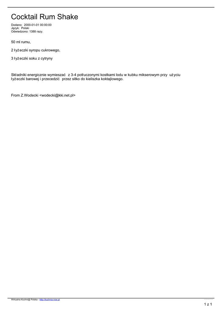 Cocktail Rum Shake Dodano: 2000-01-01 00:00:00 Język: Polski Odwiedzono: 1388 razy. 50 ml rumu, 2 łyżeczki syropu cukrowego, 3 łyżeczki soku z cytryny Składniki energicznie wymieszać z 3-4 potłuczonymi kostkami lodu w kubku mikserowym przy użyciu łyżeczki barowej i przecedzić przez sitko do kieliszka koktajlowego. From Z.Wodecki <[email protected]> Wirtualna Kuchni@ Polska - http://kuchnia.now.pl przepis nr 1825, plik wygenerowano 2017.03.08 18:36 1z1