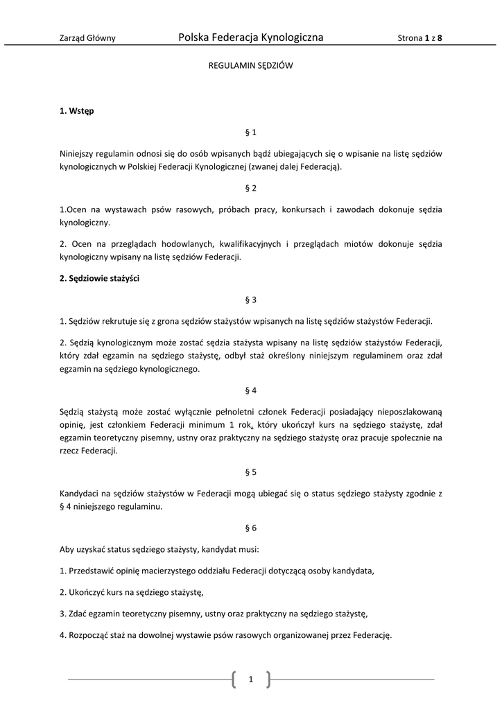 Zarząd Główny Polska Federacja Kynologiczna Strona 1 z 8 REGULAMIN SĘDZIÓW 1. Wstęp §1 Niniejszy regulamin odnosi się do osób wpisanych bądź ubiegających się o wpisanie na listę sędziów kynologicznych w Polskiej Federacji Kynologicznej (zwanej dalej Federacją). §2 1.Ocen na wystawach psów rasowych, próbach pracy, konkursach i zawodach dokonuje sędzia kynologiczny. 2. Ocen na przeglądach hodowlanych, kwalifikacyjnych i przeglądach miotów dokonuje sędzia kynologiczny wpisany na listę sędziów Federacji. 2. Sędziowie stażyści §3 1. Sędziów rekrutuje się z grona sędziów stażystów wpisanych na listę sędziów stażystów Federacji. 2. Sędzią kynologicznym może zostać sędzia stażysta wpisany na listę sędziów stażystów Federacji, który zdał egzamin na sędziego stażystę, odbył staż określony niniejszym regulaminem oraz zdał egzamin na sędziego kynologicznego. §4 Sędzią stażystą może zostać wyłącznie pełnoletni członek Federacji posiadający nieposzlakowaną opinię, jest członkiem Federacji minimum 1 rok, który ukończył kurs na sędziego stażystę, zdał egzamin teoretyczny pisemny, ustny oraz praktyczny na sędziego stażystę oraz pracuje społecznie na rzecz Federacji. §5 Kandydaci na sędziów stażystów w Federacji mogą ubiegać się o status sędziego stażysty zgodnie z § 4 niniejszego regulaminu. §6 Aby uzyskać status sędziego stażysty, kandydat musi: 1. Przedstawić opinię macierzystego oddziału Federacji dotyczącą osoby kandydata, 2. Ukończyć kurs na sędziego stażystę, 3. Zdać egzamin teoretyczny pisemny, ustny oraz praktyczny na sędziego stażystę, 4. Rozpocząć staż na dowolnej wystawie psów rasowych organizowanej przez Federację. 1 Zarząd Główny Polska Federacja Kynologiczna Strona 2 z 8 §7 Kurs oraz egzaminy, o których mowa w §6 pkt. 2 i 3 przeprowadza Kolegium Sędziów przy Polskiej Federacji Kynologicznej (zwane dalej Kolegium Sędziów). §8 Sposób przeprowadzania kursu oraz egzaminów, przyjmowania kandydatów określa Kolegium Sędziów w odpowiedniej uchwale zatwierdzonej przez Zarząd Główny Polskiej Federacji Kynologicznej (zwanego dalej Zarządem Głównym). §9 Organizatorem kursu oraz egzaminów jest Zarząd Główny, który powołuje mocą uchwały komisje egzaminacyjną odpowiedzialną za przeprowadzenie kursów oraz egzaminów w skład której mogą wejść członkowie Kolegium sędziów § 10 Egzamin teoretyczny pisemny na sędziego stażystę obejmuje wiedzę z zakresu: – fizjologii psa, – anatomii i osteologii psa, – genetyki, – podstawowej znajomości wzorców ras psów, – znajomości prowadzenia przeglądów: hodowlanych, miotów oraz kwalifikacyjnych, – znajomości podstaw zoopsychologii. – znajomość Statutu oraz Regulaminów Federacji, – kandydat zobowiązany jest opracować pisemnie w formie referatu zagadnienia z zakresu wiedzy o chorobach, pasożytach, historii ras, komentarzach do wzorców, podstaw zoopsychologii, zagadnień z genetyki. Egzamin ustny obejmuje: 1) znajomość historii pochodzenia psów, ras psów ze szczególnym uwzględnieniem tych ras, w których sędzia stażysta będzie chciał w przyszłości się specjalizować. 2) znajomość regulaminów Federacji z uwzględnieniem regulaminu hodowli, regulaminu wystaw oraz regulaminu sędziów kynologicznych. 3) znajomość zasad pielęgnacji, żywienia psów oraz oceny ogólnej kondycji psa i miotu. Egzamin praktyczny obejmuje: Wykorzystanie wcześniej nabytej wiedzy w: 2 Zarząd Główny Polska Federacja Kynologiczna Strona 3 z 8 – ocenie psów na ringu wystawowym (kandydat stażysta uczestniczy jako obserwator podczas oceny psów przez sędziego kynologicznego na ringu wystawowym, notuje swoje spostrzeżenia i uwagi) – podczas przeglądu hodowlanego i kwalifikacyjnego (uczestniczy w roli obserwatora notuje uwagi i spostrzeżenia) – podczas przeglądu miotu (uczestniczy w roli obserwatora notuje uwagi i spostrzeżenia). Sprawdzenie znajomości: – prowadzenia dokumentacji hodowlanej – obowiązków osób funkcyjnych na ringu wystawowym. § 11 Po zaliczeniu egzaminu teoretycznego pisemnego, ustnego oraz praktycznego, kandydat otrzymuje nominację na sędziego stażystę. § 12 Nominacja, o której mowa w § 11 uprawnia stażystę do przebywania na ringu podczas wystawy w charakterze asystenta sędziego kynologicznego, sekretarza ringowego oraz opiekuna ringu. Sędzia stażysta z racji pełnionej funkcji uprawniony jest do wykonywania przeglądów miotów. § 13 1. Staż sędziego nie może trwać dłużej niż 4 lata od momentu otrzymania nominacji na sędziego stażystę. 2. W czasie trwania stażu, sędzia zobowiązany jest to zaliczenia określonej przez Kolegium Sędziów w drodze uchwały ilości asyst, przeglądów, sekretarzowania oraz opiekuna ringu. 3. Po okresie czterech lat od momentu otrzymania nominacji, w przypadku braku podejścia do egzaminu na sędziego kynologicznego, nominacja zostaje anulowana. 4. Nominacja może zostań również anulowana za niezaliczenie egzaminu na sędziego kynologicznego, nieprzestrzeganie Statutu oraz Regulaminów Federacji lub nieprzestrzeganie rozporządzeń, decyzji, nałożonych kar oraz uchwał wydanych przez władze Federacji. 5. W przypadku anulowania nominacji sędziemu stażyście, o którym mowa w § 13 pkt. 3 i 4, dana osoba zostaje wykreślona z listy sędziów stażystów. W przypadku chęci ponownego przystąpienia do egzaminu na sędziego stażystę w celu przywrócenia nominacji, kandydat musi zaliczyć ponownie kurs na sędziego stażystę. Zaliczone staże z poprzedniej nominacji przepadają i nie wliczają się do obowiązków określonych w §13 pkt. 2. 6. Nominacja na sędziego stażystę anulowana jest w drodze wydania decyzji przez Zarząd Główny na wniosek Kolegium Sędziów. 3 Zarząd Główny Polska Federacja Kynologiczna Strona 4 z 8 § 14 Sędzia stażysta, otrzymuje od Kolegium Sędziów ind