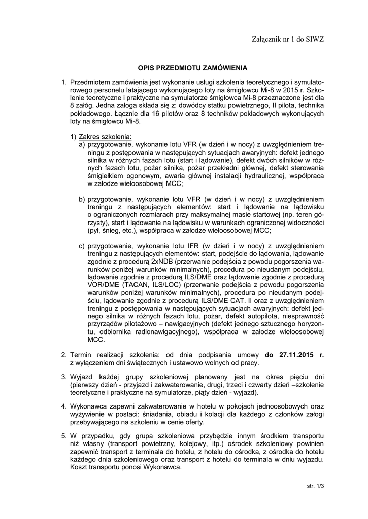 Załącznik nr 1 do SIWZ OPIS PRZEDMIOTU ZAMÓWIENIA 1. Przedmiotem zamówienia jest wykonanie usługi szkolenia teoretycznego i symulatorowego personelu latającego wykonującego loty na śmigłowcu Mi-8 w 2015 r. Szkolenie teoretyczne i praktyczne na symulatorze śmigłowca Mi-8 przeznaczone jest dla 8 załóg. Jedna załoga składa się z: dowódcy statku powietrznego, II pilota, technika pokładowego. Łącznie dla 16 pilotów oraz 8 techników pokładowych wykonujących loty na śmigłowcu Mi-8. 1) Zakres szkolenia: a) przygotowanie, wykonanie lotu VFR (w dzień i w nocy) z uwzględnieniem treningu z postępowania w następujących sytuacjach awaryjnych: defekt jednego silnika w różnych fazach lotu (start i lądowanie), defekt dwóch silników w różnych fazach lotu, pożar silnika, pożar przekładni głównej, defekt sterowania śmigiełkiem ogonowym, awaria głównej instalacji hydraulicznej, współpraca w załodze wieloosobowej MCC; b) przygotowanie, wykonanie lotu VFR (w dzień i w nocy) z uwzględnieniem treningu z następujących elementów: start i lądowanie na lądowisku o ograniczonych rozmiarach przy maksymalnej masie startowej (np. teren górzysty), start i lądowanie na lądowisku w warunkach ograniczonej widoczności (pył, śnieg, etc.), współpraca w załodze wieloosobowej MCC; c) przygotowanie, wykonanie lotu IFR (w dzień i w nocy) z uwzględnieniem treningu z następujących elementów: start, podejście do lądowania, lądowanie zgodnie z procedurą 2xNDB (przerwanie podejścia z powodu pogorszenia warunków poniżej warunków minimalnych), procedura po nieudanym podejściu, lądowanie zgodnie z procedurą ILS/DME oraz lądowanie zgodnie z procedurą VOR/DME (TACAN, ILS/LOC) (przerwanie podejścia z powodu pogorszenia warunków poniżej warunków minimalnych), procedura po nieudanym podejściu, lądowanie zgodnie z procedurą ILS/DME CAT. II oraz z uwzględnieniem treningu z postępowania w następujących sytuacjach awaryjnych: defekt jednego silnika w różnych fazach lotu, pożar, defekt autopilota, niesprawność przyrządów pilotażowo – nawigacyjnych (defekt jednego sztucznego horyzontu, odbiornika radionawigacyjnego), współpraca w załodze wieloosobowej MCC. 2. Termin realizacji szkolenia: od dnia podpisania umowy do 27.11.2015 r. z wyłączeniem dni świątecznych i ustawowo wolnych od pracy. 3. Wyjazd każdej grupy szkoleniowej planowany jest na okres pięciu dni (pierwszy dzień - przyjazd i zakwaterowanie, drugi, trzeci i czwarty dzień –szkolenie teoretyczne i praktyczne na symulatorze, piąty dzień - wyjazd). 4. Wykonawca zapewni zakwaterowanie w hotelu w pokojach jednoosobowych oraz wyżywienie w postaci: śniadania, obiadu i kolacji dla każdego z członków załogi przebywającego na szkoleniu w cenie oferty. 5. W przypadku, gdy grupa szkoleniowa przybędzie innym środkiem transportu niż własny (transport powietrzny, kolejowy, itp.) ośrodek szkoleniowy powinien zapewnić transport z terminala do hotelu, z hotelu do ośrodka, z ośrodka do hotelu każdego dnia szkoleniowego oraz transport z hotelu do terminala w dniu wyjazdu. Koszt transportu ponosi Wykonawca. str. 1/3 6. Wykonawca przeprowadzi szkolenie w ośrodku szkoleniowym posiadającym ważny certyfikat do prowadzenia szkoleń na symulatorze lotu oraz ważną polisę ubezpieczeniową. W przypadku braku polisy musi posiadać ważny dokument potwierdzający ubezpieczenie od odpowiedzialności cywilnej w zakresie prowadzonej działalności gospodarczej (prowadzonego szkolenia). 7. Program szkolenia lotniczego dla każdego pilota powinien zawierać: 1) W każdej załodze: a) szkolenie naziemne – 4 godz. - przygotowanie do lotu zgodnie z przepisami do lotu VFR (planowanie lotu, postępowanie w przypadku wystąpienia niesprawności śmigłowca, współpraca w załodze wieloosobowej CRM) – czas przygotowania 60 min. przed każdą misją (2x60 min.); - debriefing po locie VFR – czas omówienia 20 min. (2x20 min.); - przygotowanie do lotu zgodnie z przepisami do lotu IFR (planowanie lotu, postępowanie w przypadku wystąpienia niesprawności śmigłowca, współpraca w załodze wieloosobowej CRM) – czas przygotowania 60 min.; - debriefing po locie IFR – czas omówienia 20 min. b) szkolenie praktyczne na symulatorze – jako pilot lecący (FP) – 5 godz. - SIM1 – misja polegająca na przygotowaniu, wykonaniu lotu VFR z uwzględnieniem treningu z postępowania w następujących sytuacjach awaryjnych: defekt jednego silnika w różnych fazach lotu (start i lądowanie), defekt dwóch silników w różnych fazach lotu, pożar silnika, pożar przekładni głównej, defekt sterowania śmigiełkiem ogonowym, awaria głównej instalacji hydraulicznej z uwzględnieniem zasad współpracy w załodze wieloosobowej MCC – czas misji 120 min.; - SIM2 – misja polegająca na przygotowaniu, wykonaniu lotu VFR (w dzień i w nocy) z uwzględnieniem treningu z następujących elementów: start i lądowanie na lądowisku o ograniczonych rozmiarach przy maksymalnej masie startowej (np. teren górzysty), start i lądowanie na lądowisku w warunkach ograniczonej widoczności (pył, śnieg, etc.), współpraca w załodze wieloosobowej MCC – czas misji 120 min.; - SIM3 - misja polegająca na przygotowaniu, wykonaniu lotu IFR (w dzień i w nocy) z uwzględnieniem treningu z następujących elementów: start, podejście do lądowania, lądowanie zgodnie z procedurą 2xNDB (przerwanie podejścia z powodu pogorszenia warunków poniżej warunków minimalnych), procedura po nieudanym podejściu, lądowanie zgodnie z procedurą ILS/DME oraz lądowanie zgodnie z procedurą VOR/DME (TACAN, ILS/LOC) (przerwanie podejścia z powodu pogorszenia warunków poniżej warunków minimalnych), procedura po nieudanym podejściu, lądowanie zgodnie z procedurą ILS/DME CAT. II oraz z uwzględnieniem treningu z postępowania w następujących sytuacjach awaryjnych: defekt jednego silnika w różnych fazach lotu, 