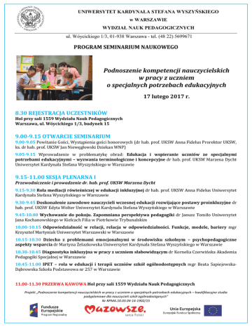 UNIWERSYTET KARDYNAŁA STEFANA WYSZYŃSKIEGO w WARSZAWIE WYDZIAŁ NAUK PEDAGOGICZNYCH ul. Wóycickiego 1/3, 01-938 Warszawa - tel. (48 22) 5699671 PROGRAM SEMINARIUM NAUKOWEGO Podnoszenie kompetencji nauczycielskich w pracy z uczniem o specjalnych potrzebach edukacyjnych 17 lutego 2017 r. 8.30 REJESTRACJA UCZESTNIKÓW Hol przy sali 1559 Wydziału Nauk Pedagogicznych Warszawa, ul. Wóycickiego 1/3, budynek 15 9.00-9.15 OTWARCIE SEMINARIUM 9.00-9.05 Powitanie Gości, Wystąpienia gości honorowych (dr hab. prof. UKSW Anna Fidelus Prorektor UKSW, ks. dr hab. prof. UKSW Jan Niewęgłowski Dziekan WNP) 9.05-9.15 Wprowadzenie w problematykę obrad: Edukacja i wspieranie uczniów ze specjalnymi potrzebami edukacyjnymi – wyzwania terminologiczne i koncepcyjne dr hab. prof. UKSW Marzena Dycht Uniwersytet Kardynała Stefana Wyszyńskiego w Warszawie 9.15-11.00 SESJA PLENARNA I Przewodniczenie i prowadzenie dr. hab. prof. UKSW Marzena Dycht 9.15-9.30 Rola mediacji rówieśniczej w edukacji inkluzyjnej dr hab. prof. UKSW Anna Fidelus Uniwersytet Kardynała Stefana Wyszyńskiego w Warszawie 9.30-9.45 Doskonalenie zawodowe nauczycieli wczesnej edukacji rozwijające postawy proinkluzyjne dr hab. prof. UKSW Edyta Wolter Uniwersytet Kardynała Stefana Wyszyńskiego w Warszawie 9.45-10.00 Wychowanie do pokoju. Zapomniana perspektywa pedagogiki dr Janusz Tomiło Uniwersytet Jana Kochanowskiego w Kielcach Filia w Piotrkowie Trybunalskim 10.00-10.15 Odpowiedzialność w relacji, relacja w odpowiedzialności. Funkcje, modele, bariery mgr Krzysztof Martyniak Uniwersytet Warszawski w Warszawie 10.15-10.30 Dziecko z problemami emocjonalnymi w środowisku szkolnym – psychopedagogiczne aspekty wsparcia dr Martyna Żelazkowska Uniwersytet Kardynała Stefana Wyszyńskiego w Warszawie 10.30-10.45 Diagnostyka inkluzyjna w pracy z uczniem słabowidzącym dr Kornelia Czerwińska Akademia Pedagogiki Specjalnej w Warszawie 10.45-11.00 IPET – rola w edukacji i terapii uczniów szkół ogólnodostępnych mgr Beata SapiejewskaDąbrowska Szkoła Podstawowa nr 257 w Warszawie 11.00-11.30 PRZERWA KAWOWA Hol przy sali 1559 Wydziału Nauk Pedagogicznych Projekt „Podnoszenie kompetencji nauczycielskich w pracy z uczniem o specjalnych potrzebach edukacyjnych – kwalifikacyjne studia podyplomowe dla nauczycieli szkół ogólnodostępnych” Nr RPMA.10.03.04-14-1902/15 UNIWERSYTET KARDYNAŁA STEFANA WYSZYŃSKIEGO w WARSZAWIE WYDZIAŁ NAUK PEDAGOGICZNYCH ul. Wóycickiego 1/3, 01-938 Warszawa - tel. (48 22) 5699671 11.30-13.50 SESJA PLENARNA II Przewodniczenie i prowadzenie: dr hab. prof. UKSW Edyta Wolter 11.30-11.45 Uczeń cudzoziemski w polskiej szkole. Szanse, trudności, wyzwania dr Edyta Januszewska Akademia Pedagogiki Specjalnej w Warszawie 11.45-12.00 Wspomaganie uczniów z dysfunkcją wzroku w szkołach ogólnodostępnych – działalność Poradni Centrum Edukacyjnego dla Uczniów Niewidomych i Słabowidzących CEDUNIS dr Joanna Witczak-Nowotna Poradnia CEDUNIS w Warszawie 12.00-12.15 Znaczenie diagnozy funkcjonalnej ucznia z niepełnosprawnością wzroku wobec kompetencji i potrzeb nauczycieli dr Małgorzata Paplińska Akademia Pedagogiki Specjalnej w Warszawie 12.15-12.30 Integrowanie technologii i technik brajlowskich w edukacji uczniów niewidzących dr Emilia Śmiechowska-Petrovskij Uniwersytet Kardynała Stefana Wyszyńskiego w Warszawie 12.30-12.45 Choroby przewlekłe u dzieci – czynniki ryzyka i profilaktyka dr Izabela Gątarek Uniwersytet Kardynała Stefana Wyszyńskiego w Warszawie 12.45-13.00 Edukacja inkluzyjna ucznia z autyzmem i z zespołem Aspergera w warunkach szkoły ogólnodostępnej mgr Karolina Zdziechowska-Dzierzgwa Akademia Pedagogiki Specjalnej w Warszawie 13.00-13.15 Drama jako metoda terapii pedagogicznej w pracy z dziećmi z zespołem Aspergera dr Karina Szafrańska WSNS Pedagogium w Warszawie 13.15-13.30 Zastosowanie technik pamięciowych w pracy z uczniem o specjalnych potrzebach edukacyjnych mgr Lidia Kurcińska Gimnazjum nr 1 im. Powstańców Warszawy w Piasecznie 13.30-13.40 Edukacja włączająca w opinii nauczycieli szkoły podstawowej i słuchaczy studiów podyplomowych mgr Agata Jardzioch Zespół Szkół nr 4 w Słomczynie, Szkoła Wyższa Przymierza Rodzin w Warszawie 13.40-13.50 Strategie wspomagające integrację społeczną uczniów ze specjalnymi potrzebami edukacyjnymi w szkole powszechnej mgr Jacek Dąbrowski Szkoła Podstawowa nr 118 w Warszawie 13.50-14.30 OBIAD Hol przy sali 1559 Wydziału Nauk Pedagogicznych 14.30-15.00 Wręczanie Uczestnikom Projektu nauczycielskie i materiałów dydaktycznych PKN materiałów podnoszących kompetencje 15.00 ZAKOŃCZENIE SEMINARIUM NAUKOWEGO Projekt „Podnoszenie kompetencji nauczycielskich w pracy z uczniem o specjalnych potrzebach edukacyjnych – kwalifikacyjne studia podyplomowe dla nauczycieli szkół ogólnodostępnych” Nr RPMA.10.03.04-14-1902/15