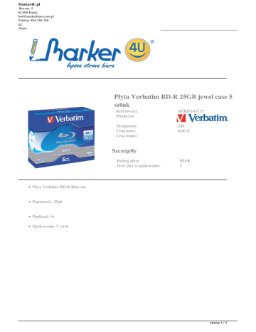 Marker4U.pl Boczna 5 62-800 Kalisz [email protected] Telefon: 884-760-760 gg: skype: Płyta Verbatim BD-R 25GB jewel case 5 sztuk Kod towaru: Producent: VERDY43715 Dostępność: Cena netto: Cena brutto: 24h 0.00 zł Szczegóły Rodzaj płyty: Ilość płyt w opakowaniu: BD-R 5 Płyty Verbatim BD-R Blue-ray Pojemność: 25gb Prędkość: 6x Opakowanie: 5 sztuk strona 1 / 1 Powered by TCPDF (www.tcpdf.org)