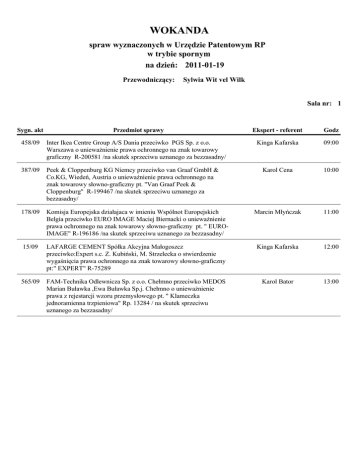 WOKANDA spraw wyznaczonych w Urzędzie Patentowym RP w trybie spornym na dzień: 2011-01-19 Przewodniczący: Sylwia Wit vel Wilk Sala nr: 1 Sygn. akt Przedmiot sprawy Ekspert - referent Godz Kinga Kafarska 09:00 Karol Cena 10:00 458/09 Inter Ikea Centre Group A/S Dania przeciwko PGS Sp. z o.o. Warszawa o unieważnienie prawa ochronnego na znak towarowy graficzny R-200581 /na skutek sprzeciwu uznanego za bezzasadny/ 387/09 Peek & Cloppenburg KG Niemcy przeciwko van Graaf GmbH & Co.KG, Wiedeń, Austria o unieważnienie prawa ochronnego na znak towarowy słowno-graficzny pt. "Van Graaf Peek & Cloppenburg" R-199467 /na skutek sprzeciwu uznanego za bezzasadny/ 178/09 Komisja Europejska działajaca w imieniu Wspólnot Europejskich Belgia przeciwko EURO IMAGE Maciej Biernacki o unieważnienie prawa ochronnego na znak towarowy słowno-graficzny pt. " EUROIMAGE" R-196186 /na skutek sprzeciwu uznanego za bezzasadny/ Marcin Młyńczak 11:00 15/09 LAFARGE CEMENT Spółka Akcyjna Małogoszcz przeciwko:Expert s.c. Z. Kubiński, M. Strzelecka o stwierdzenie wygaśnięcia prawa ochronnego na znak towarowy słowno-graficzny pt:" EXPERT" R-75289 Kinga Kafarska 12:00 565/09 FAM-Technika Odlewnicza Sp. z o.o. Chełmno przeciwko MEDOS Marian Buławka ,Ewa Buławka Sp.j. Chełmno o unieważnienie prawa z rejestarcji wzoru przemysłowego pt. " Klameczka jednoramienna trzpieniowa" Rp. 13284 / na skutek sprzeciwu uznanego za bezzasadny/ Karol Bator 13:00