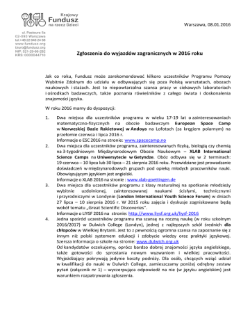 Warszawa, 08.01.2016 Zgłoszenia do wyjazdów zagranicznych w 2016 roku Jak co roku, Fundusz może zarekomendować kilkoro uczestników Programu Pomocy Wybitnie Zdolnym do udziału w odbywających się poza Polską warsztatach, obozach naukowych i stażach. Jest to niepowtarzalna szansa pracy w ciekawych laboratoriach i ośrodkach badawczych, także poznania rówieśników z całego świata i doskonalenia znajomości języka. W roku 2016 mamy do dyspozycji: 1. 2. 3. 4. Dwa miejsca dla uczestników programu w wieku 17-19 lat o zainteresowaniach matematyczno-fizycznych na obozie badawczym European Space Camp w Norweskiej Bazie Rakietowej w Andoya na Lofotach (za kręgiem polarnym) na przełomie czerwca i lipca 2016 r. Informacje o ESC 2016 na stronie: www.spacecamp.no Dwa miejsca dla uczestników programu, zainteresowanych fizyką, biologią czy chemią na 3-tygodniowym Międzynarodowym Obozie Naukowym – XLAB International Science Camps na Uniwersytecie w Getyndze. Obóz odbywa się w 2 terminach: 19 czerwca – 10 lipca lub 30 lipca – 21 sierpnia 2016 roku. Przewidziane jest prowadzanie doświadczeń w międzynarodowych grupach pod opieką młodych pracowników nauki. Obowiązującym językiem jest angielski. Informacje o XLAB 2016 na stronie : www.xlab-goettingen.de Dwa miejsca dla uczestników programu z klasy maturalnej na spotkanie młodzieży wybitnie uzdolnionej, zainteresowanej naukami ścisłymi, technicznymi i przyrodniczymi w Londynie (London International Youth Science Forum) w dniach 27 lipca – 10 sierpnia 2016 r. W 2015 roku zajęcia i dyskusje zogniskowane będą wokół tematu „Great Scientific Discoveries”. Informacje o LIYSF 2016 na stronie: http://www.liysf.org.uk/liysf-2016 Jedna spośród uczestników programu ma szansę na roczną naukę (w roku szkolnym 2016/2017) w Dulwich College (Londyn), jednej z najlepszych szkół średnich dla chłopców w Wielkiej Brytanii. Jest to z pewnością ogromna szansa na zapoznanie się z innym niż polski systemem edukacji i zdobycie wiedzy oraz praktyki językowej. Szersza informacja o szkole na stronie: www.dulwich.org.uk Od kandydatów oczekujemy, oprócz bardzo dobrej znajomości języka angielskiego, także gotowości do sprostania nowym wyzwaniom i wielkiej pracowitości. Wyjeżdżający pokrywają jedynie koszty podróży. Dla osób, chcących wziąć udział w kwalifikacji do nauki w Dulwich College, zamieszczamy poniżej odrębny zestaw pytań (załącznik nr 1) – wyczerpująca odpowiedź na nie (w języku angielskim) jest warunkiem rozpatrywania zgłoszenia. Osoby, które chcą wziąć udział w kwalifikacji do wyjazdów zagranicznych powinny przysłać do biura Funduszu (najlepiej drogą elektroniczną) zgłoszenie w języku angielskim, zawierające: 1. krótki opis zainteresowań, 2. krótki opis największych osiągnięć naukowych – prace badawcze, projekty naukowe, sukcesy w olimpiadach przedmiotowych, 3. uzasadnienie chęci wyjazdu z podaniem planów naukowych związanych z danym obozem/warsztatami. Żeby dobrze przygotować zgłoszenie warto zapoznać się z opisem wybranych obozów/warsztatów pod podanymi wyżej adresami internetowymi. Odpowiedzi na poszczególne pytania powinny być zwięzłe – w przypadku 2 pierwszych ok. 1.000 znaków, w przypadku 3 – do 2 tys. znaków. Można zgłosić się na więcej niż jeden wyjazd – w takim przypadku w punkcie 3. należy podać osobne uzasadnienia dla każdego wyjazdu oraz podać kolejność od najbardziej do najmniej preferowanego. Zgłoszenie powinno do nas dotrzeć do 1 lutego 2016. Na rozmowę kwalifikacyjną (która odbędzie się prawdopodobnie 20 lutego) zaprosimy tylko wybrane osoby spośród tych, które przyślą zgłoszenia do Biura Funduszu – o zaproszeniu na rozmowę poinformujemy oddzielnie. Fundusz zwróci koszty podróży PKP II kl. lub autobusem (na analogicznych zasadach jak w przypadku warsztatów naukowych). Pobyt za granicą jest we wszystkich przypadkach opłacany przez Fundusz, oczekujemy pokrycia przez wyjeżdżających kosztów podróży z miejsca zamieszkania do miejsca obozu/warsztatu i z powrotem. Jednocześnie informujemy, iż możesz starać się o dofinansowanie przez Fundusz zakupu biletów przez złożenie wniosku o stypendium celowe. Dodatkowe pytania dla osób zgłaszających się do Dulwich Collage Please respond to the following questions on separate paper if you apply for a place at Dulwich College. Limit your responses to a total of three typewritten pages. 1. What are your long-range goals? 2. State your three or four fields of interest in which you wish to work at Dulwich. In your fields of interest, please state what you see as most interesting questions/problems and why they are interesting to you. 3. What is your attitude towards life in a multicultural society. Please write a few words on your approach to life in a boarding-house with people coming from various cultures. 4. Describe extracurricular and community activities in which you have participated.
