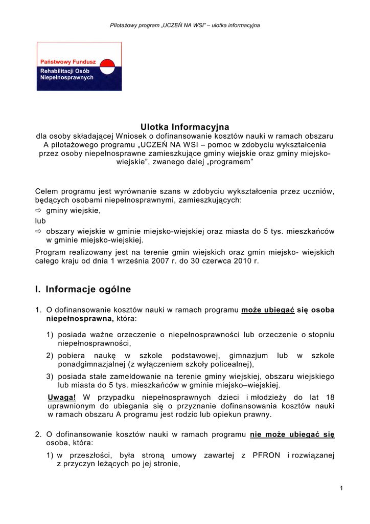 PIlotaŜowy program „UCZEŃ NA WSI” – ulotka informacyjna Ulotka Informacyjna dla osoby składającej Wniosek o dofinansowanie kosztów nauki w ramach obszaru A pilotaŜowego programu „UCZEŃ NA WSI – pomoc w zdobyciu wykształcenia przez osoby niepełnosprawne zamieszkujące gminy wiejskie oraz gminy miejskowiejskie”, zwanego dalej „programem” Celem programu jest wyrównanie szans w zdobyciu wykształcenia przez uczniów, będących osobami niepełnosprawnymi, zamieszkujących: gminy wiejskie, lub obszary wiejskie w gminie miejsko-wiejskiej oraz miasta do 5 tys. mieszkańców w gminie miejsko-wiejskiej. Program realizowany jest na terenie gmin wiejskich oraz gmin miejsko- wiejskich całego kraju od dnia 1 września 2007 r. do 30 czerwca 2010 r. I. Informacje ogólne 1. O dofinansowanie kosztów nauki w ramach programu moŜe ubiegać się osoba niepełnosprawna, która: 1) posiada waŜne orzeczenie o niepełnosprawności lub orzeczenie o stopniu niepełnosprawności, 2) pobiera naukę w szkole podstawowej, gimnazjum ponadgimnazjalnej (z wyłączeniem szkoły policealnej), lub w szkole 3) posiada stałe zameldowanie na terenie gminy wiejskiej, obszaru wiejskiego lub miasta do 5 tys. mieszkańców w gminie miejsko–wiejskiej. Uwaga! W przypadku niepełnosprawnych dzieci i młodzieŜy do lat 18 uprawnionym do ubiegania się o przyznanie dofinansowania kosztów nauki w ramach obszaru A programu jest rodzic lub opiekun prawny. 2. O dofinansowanie kosztów nauki w ramach programu nie moŜe ubiegać się osoba, która: 1) w przeszłości, była stroną umowy z przyczyn leŜących po jej stronie, zawartej z PFRON i rozwiązanej 1 PIlotaŜowy program „UCZEŃ NA WSI” – ulotka informacyjna 2) posiada średnie miesięczne dochody brutto przekraczające 120% najniŜszego wynagrodzenia przypadającego na jednego członka rodziny pozostającego we wspólnym gospodarstwie domowym. Zgodnie z postanowieniami pilotaŜowego programu „UCZEŃ NA WSI”, przez „najniŜsze wynagrodzenie” naleŜy rozumieć wynagrodzenie, o którym mowa w art. 2 pkt 1 ustawy z dnia 27 sierpnia 1997 r. o rehabilitacji zawodowej i społecznej oraz zatrudnianiu osób niepełnosprawnych (Dz. U. Nr 123, poz. 776 z późn. zm.), tj. minimalne wynagrodzenie za pracę obowiązujące w grudniu roku poprzedniego, ustalane na podstawie odrębnych przepisów. 3. Przyznana ze środków PFRON pomoc finansowa w ramach programu, moŜe obejmować następujące koszty: 1) zakupu przedmiotów ułatwiających lub umoŜliwiających naukę, 2) uczestnictwa w zajęciach mających na celu podniesienie sprawności fizycznej lub psychicznej (w tym wakacyjne obozy rehabilitacyjne), 3) związane z dostępem do internetu (instalacja i abonament), Uwaga! w ramach programu wykluczona została moŜliwość zakupu sprzętu komputerowego 4) kursów doszkalających w zakresie programu nauczania oraz kursów językowych (w przypadku kursów organizowanych poza miejscem zamieszkania ucznia, dofinansowaniu mogą podlegać równieŜ koszty dojazdu, zakwaterowania, wyŜywienia), 5) wyjazdów organizowanych w ramach zajęć szkolnych. 4. W przypadku uczniów szkół ponadgimnazjalnych przyznana finansowa moŜe obejmować dodatkowo następujące koszty: pomoc 1) opłaty za naukę (czesne), 2) zakwaterowania (gdy uczeń pobiera naukę poza miejscowością, w której jest zameldowany na pobyt stały) , 3) dojazdów do szkoły. 5. Wysokość pomocy finansowej ze środków PFRON nie moŜe przekroczyć: 1) w przypadku ucznia szkoły podstawowej lub gimnazjum – kwoty 2000 zł w ciągu jednego roku szkolnego, 2) w przypadku ucznia szkoły ponadgimnazjalnej bez obowiązku uiszczania czesnego – kwoty 3000 zł w ciągu jednego roku szkolnego, 3) w przypadku ucznia szkoły ponadgimnazjalnej zobowiązanego do uiszczania opłat za naukę (czesnego) – kwoty 4000 zł w ciągu jednego roku szkolnego. II. Tryb składania wniosków 1. Gmina zakwalifikowana przez PFRON do realizacji programu ustala i ogłasza termin przyjmowania wniosków o dofinansowanie kosztów nauki. W ogłoszeniu 2 PIlotaŜowy program „UCZEŃ NA WSI” – ulotka informacyjna gmina wskazuje jednostkę organizacyjną, która w jej imieniu przyjmować będzie wnioski o dofinansowanie kosztów nauki. 2. Po ogłoszeniu przez Gminę naboru wniosków, Wnioskodawca (tj. pełnoletni uczeń niepełnosprawny lub w przypadku dzieci i młodzieŜy do lat 18 jego rodzic lub opiekun prawny) składa wniosek o dofinansowanie kosztów nauki do dnia 30 września kaŜdego roku realizacji programu. 3. Wniosek o dofinansowanie kosztów nauki, sporządza się na formularzu stanowiącym załącznik nr 3 do procedur. Wnioski będą dostępne w Gminie oraz na stronie www.pfron.org.pl 4. Do wniosku o dofinansowanie naleŜy dołączyć: 1) kserokopię waŜnego orzeczenia o niepełnosprawności lub orzeczenia o stopniu niepełnosprawności ucznia, 2) oświadczenie Wnioskodawcy o dochodzie brutto przypadającym na jednego członka rodziny pozostającego w gospodarstwie domowym, którego wzór stanowi załącznik do formularza wniosku o dofinansowanie, 3) zaświadczenie ze szkoły o pobieraniu nauki przez ucznia podstawowej, gimnazjum lub szkole ponagimnazjalnej, w szkole 4) kserokopię aktu urodzenia ucznia – dotyczy Wnioskodawcy ubiegającego się o pomoc finansową w imieniu i na rzecz niepełnoletniego dziecka, 5) kserokopię dokumentu o ustanowieniu opieki prawnej nad podopiecznym dotyczy Wnioskodawców, będących opiekunami prawnymi ucznia. 5. Wniosek o dofinansowanie naleŜy składać w wyznaczonej przez Wójta jednostce organizacyjnej gminy, właściwej terytorialnie dla miejsca stałego zameldowania ucznia. 6. Za datę złoŜenia wniosku o dofinansowanie uwaŜa się datę jego wpłynięcia, a w przypadku wniosku o dofinansowanie składanego drogą pocztową, datę stempla pocztowego. 7. Wnioskodawca zobowiązany jest na Ŝądanie gminy dostarczyć dowody potwierdzające wysokość uzyskiwanych dochod