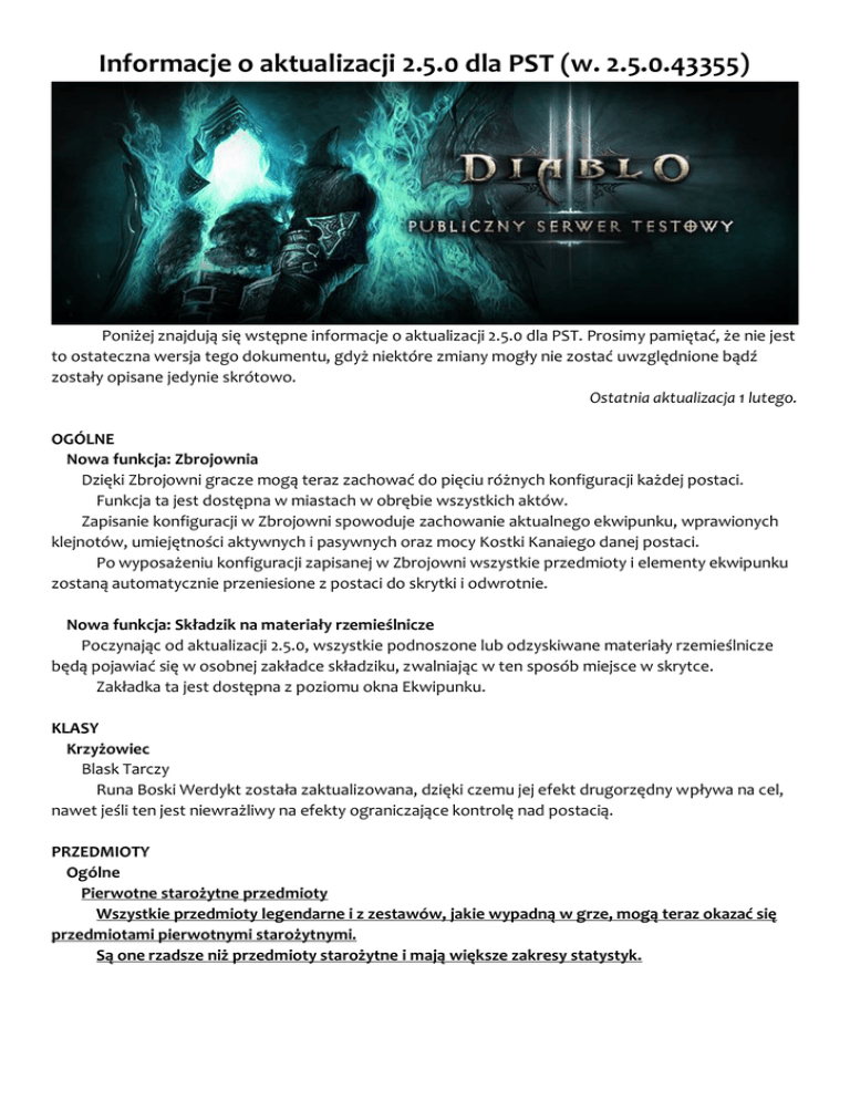 Informacje o aktualizacji 2.5.0 dla PST (w. 2.5.0.43355) Poniżej znajdują się wstępne informacje o aktualizacji 2.5.0 dla PST. Prosimy pamiętać, że nie jest to ostateczna wersja tego dokumentu, gdyż niektóre zmiany mogły nie zostać uwzględnione bądź zostały opisane jedynie skrótowo. Ostatnia aktualizacja 1 lutego. OGÓLNE Nowa funkcja: Zbrojownia Dzięki Zbrojowni gracze mogą teraz zachować do pięciu różnych konfiguracji każdej postaci. Funkcja ta jest dostępna w miastach w obrębie wszystkich aktów. Zapisanie konfiguracji w Zbrojowni spowoduje zachowanie aktualnego ekwipunku, wprawionych klejnotów, umiejętności aktywnych i pasywnych oraz mocy Kostki Kanaiego danej postaci. Po wyposażeniu konfiguracji zapisanej w Zbrojowni wszystkie przedmioty i elementy ekwipunku zostaną automatycznie przeniesione z postaci do skrytki i odwrotnie. Nowa funkcja: Składzik na materiały rzemieślnicze Poczynając od aktualizacji 2.5.0, wszystkie podnoszone lub odzyskiwane materiały rzemieślnicze będą pojawiać się w osobnej zakładce składziku, zwalniając w ten sposób miejsce w skrytce. Zakładka ta jest dostępna z poziomu okna Ekwipunku. KLASY Krzyżowiec Blask Tarczy Runa Boski Werdykt została zaktualizowana, dzięki czemu jej efekt drugorzędny wpływa na cel, nawet jeśli ten jest niewrażliwy na efekty ograniczające kontrolę nad postacią. PRZEDMIOTY Ogólne Pierwotne starożytne przedmioty Wszystkie przedmioty legendarne i z zestawów, jakie wypadną w grze, mogą teraz okazać się przedmiotami pierwotnymi starożytnymi. Są one rzadsze niż przedmioty starożytne i mają większe zakresy statystyk. Przedmioty legendarne Dostosowano następujące przedmioty: Serce Szronu Zwiększono szansę na zadziałanie mocy przedmiotu legendarnego na zamrożone cele z 10% do 20%. Silnorękie Karwasze Premia do obrażeń zapewniana przez ten przedmiot jest teraz naliczana przy odrzuceniu, a nie po wylądowaniu przez wroga. Wydłużono czas trwania premii do obrażeń do 6 sekund. Przedmioty klasowe Zmieniono działanie niektórych przedmiotów. Golibroda Broń jest teraz ceremonialnym nożem, a nie sztyletem, dzięki czemu może zadawać te same obrażenia co inne przedmioty dla szamana. Ponadto wprowadzono premię do obrażeń zadawanych przez ostatni wybuch mocy legendarnej tego przedmiotu. Moc legendarna tego przedmiotu zostanie również zaktualizowana w Kostce Kanaiego, jeśli już została pozyskana. Żeby skorzystać ze zaktualizowanej wersji mocy z Kostki, należy ponownie ją wyposażyć. Uzdrowienie Manalda Efekt zadawania obrażeń z Uzdrowienia Manalda będzie teraz aktywowany przy atakowaniu celu także przez przywołańce czarownicy, takie jak Hydra. Uwaga: Ta zmiana pojawi się wraz z nadchodzącą aktualizacją PST. TRYB PRZYGODOWY Głębokie Szczeliny Uwaga: Ta zmiana dotyczy wyłącznie graczy na PC/Mac. Zmieniono wymogi dotyczące udziału w grach publicznych o określonych poziomach trudności – teraz brany jest pod uwagę nie aktualny poziom mistrzowski, a najwyższy ukończony poziom Głębokiej Szczeliny w grze solo zgodnie z poniższymi wytycznymi: Udręka I – VI: Brak wymogów Udręka VII: 30 poziom Głębokiej Szczeliny w grze solo Udręka VIII: 35 poziom Głębokiej Szczeliny w grze solo Udręka IX: 40 poziom Głębokiej Szczeliny w grze solo Udręka X: 45 poziom Głębokiej Szczeliny w grze solo Udręka XI: 50 poziom Głębokiej Szczeliny w grze solo Udręka XII: 55 poziom Głębokiej Szczeliny w grze solo Udręka XIII: 60 poziom Głębokiej Szczeliny w grze solo Podziemia Zestawów Świętokradcza Esencja Pole znajdujące się w prawym górnym rogu podziemi zastąpiono takim, które zapewnia więcej miejsca na pojawianie się potworów. Pancerz Akkhana Zmniejszono z 12 do 10 liczbę wymaganych trafień Skazaniem grup złożonych z przynajmniej 10 przeciwników. Opus Magnum Delsere Zmniejszono liczbę przeciwników, których należy jednocześnie trafić przy pomocy Spowolnienia Czasu z 30 do 20, ale zwiększono liczbę powtórzeń trafienia z 3 do 4. Zlecenia Usunięto premiowane akty. Wraz z tą zmianą wykonanie pięciu zleceń w dowolnym akcie poskutkuje przyznaniem dużej skrzyni horadrimów, zawierającej takie same nagrody co skarby horadrimów i premiowe. Źródło: http://eu.battle.net/d3/pl/blog/20529333 Web rip by CWK dla SEZON.DIABLO.OVH środa, 1 lutego 2017 Więcej materiałów o Diablo III w wersji PDF do pobrania z PUB.DIABLO.OVH