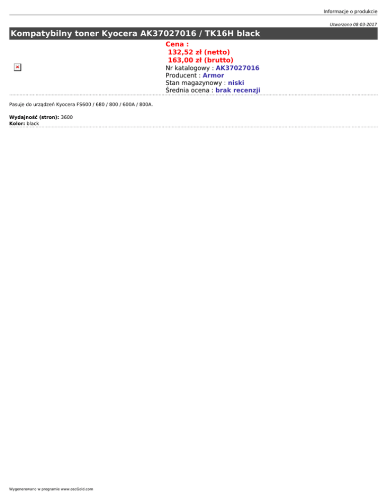 Informacje o produkcie Utworzono 08-03-2017 Kompatybilny toner Kyocera AK37027016 / TK16H black Cena : 132,52 zł (netto) 163,00 zł (brutto) Nr katalogowy : AK37027016 Producent : Armor Stan magazynowy : niski Średnia ocena : brak recenzji Pasuje do urządzeń Kyocera FS600 / 680 / 800 / 600A / 800A. Wydajność (stron): 3600 Kolor: black Wygenerowano w programie www.oscGold.com