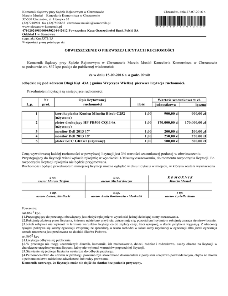 Komornik Sądowy przy Sądzie Rejonowym w Chrzanowie Marcin Musiał Kancelaria Komornicza w Chrzanowie 32-500 Chrzanów, al. Henryka 63 (32)7218901 fax (32)7505682 [email protected] www.chrzanow-komornik.pl 47102024980000850204442612 Powszechna Kasa Oszczędności Bank Polski SA Oddział 1 w Sosnowcu sygn. akt Km 5371/15 Chrzanów, dnia 27-07-2016 r. *1016072701240* W odpowiedzi proszę podać sygn. akt OBWIESZCZENIE O PIERWSZEJ LICYTACJI RUCHOMOŚCI Komornik Sądowy przy Sądzie Rejonowym w Chrzanowie Marcin Musiał Kancelaria Komornicza w Chrzanowie na podstawie art. 867 kpc podaje do publicznej wiadomości: że w dniu 15-09-2016 r. o godz. 09:40 odbędzie się pod adresem Długi Kąt 43A ( gmina Wręczyca Wielka) pierwsza licytacja ruchomości. Przedmiotem licytacji są następujące ruchomości: Nr prot. L.p. 1 Opis licytowanej ruchomości ilość kserokopiarka Konica Minolta Bizub C252 (używana) ploter drukujący HP FB500 CQ114A (używany) monitor Dell 2013 17' monitor Dell 2013 19' ploter GCC GRC61 (używany) 2 3 4 5 Wartość szacunkowa w zł. jednostkowa łączna 1,00 900,00 zł 900,00 zł 1,00 170.000,00 zł 170.000,00 zł 1,00 1,00 1,00 200,00 zł 250,00 zł 500,00 zł 200,00 zł 250,00 zł 500,00 zł Ceną wywoławczą każdej ruchomości w powyższej licytacji jest 3/4 wartości szacunkowej podanej w obwieszczeniu. Przystępujący do licytacji winni wpłacić rękojmię w wysokości 1/10sumy oszacowania, do momentu rozpoczęcia licytacji. Po rozpoczęciu licytacji rękojmia nie będzie przyjmowana. Ruchomości będące przedmiotem niniejszej licytacji można oglądać w dniu licytacji w miejscu, w którym została wyznaczona z up. asesor Marcin Trefon z up. asesor Michał Koczur KOMORNIK Marcin Musiał z up. asesor Łukasz Siedlecki z up. asesor Anita Borkowska - Moskalik z up. asesor Izabella Siuta Pouczenie: Art.8671 kpc. §1.Przystępujący do przetargu obowiązany jest złożyć rękojmię w wysokości jednej dziesiątej sumy oszacowania. §2.Rękojmię złożoną przez licytanta, któremu udzielono przybicia, zatrzymuje się; pozostałym licytantom rękojmię zwraca się niezwłocznie. §3.Jeżeli nabywca nie wykonał w terminie warunków licytacji co do zapłaty ceny, traci rękojmię, a skutki przybicia wygasają. Z utraconej rękojmi pokrywa się koszty egzekucji związanej ze sprzedażą, a reszta wchodzi w skład sumy uzyskanej w egzekucji albo jeżeli egzekucja została umorzona jest przelewana na dochód Skarbu Państwa. art.8672 kpc §1.Licytacja odbywa się publicznie. §2.W przetargu nie mogą uczestniczyć: dłużnik, komornik, ich małżonkowie, dzieci, rodzice i rodzeństwo, osoby obecne na licytacji w charakterze urzędowym oraz licytant, który nie wykonał warunków poprzedniej licytacji. §3.Stawienie się jednego licytanta wystarcza do odbycia przetargu. §4.Pełnomocnictwo do udziału w przetargu powinno być stwierdzone dokumentem z podpisem urzędowo poświadczonym, chyba że chodzi o pełnomocnictwo udzielone adwokatowi lub radcy prawnemu. Komornik zastrzega, że licytacja może nie dojść do skutku bez podania przyczyny.