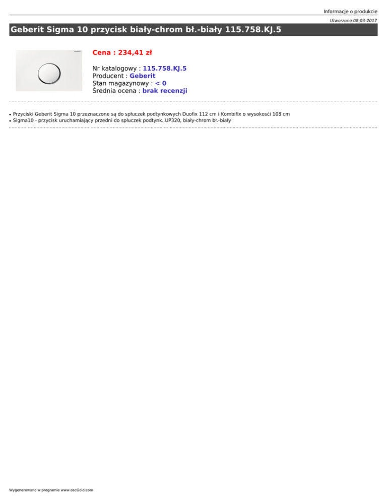 Informacje o produkcie Utworzono 08-03-2017 Geberit Sigma 10 przycisk biały-chrom bł.-biały 115.758.KJ.5 Cena : 234,41 zł Nr katalogowy : 115.758.KJ.5 Producent : Geberit Stan magazynowy : < 0 Średnia ocena : brak recenzji ● ● Przyciski Geberit Sigma 10 przeznaczone są do spłuczek podtynkowych Duofix 112 cm i Kombifix o wysokosći 108 cm Sigma10 - przycisk uruchamiający przedni do spłuczek podtynk. UP320, biały-chrom bł.-biały Wygenerowano w programie www.oscGold.com