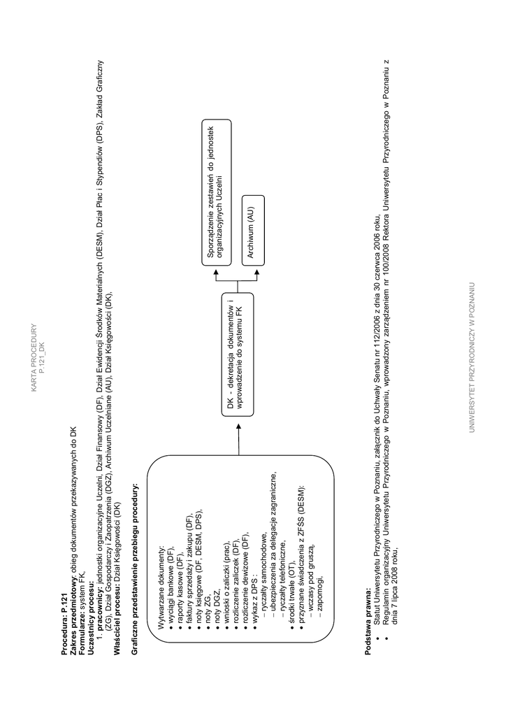 DK - dekretacja dokumentów i wprowadzenie do systemu FK Archiwum (AU) Sporządzenie zestawień do jednostek organizacyjnych Uczelni UNIWERSYTET PRZYRODNICZY W POZNANIU Podstawa prawna: • Statut Uniwersytetu Przyrodniczego w Poznaniu, załącznik do Uchwały Senatu nr 112/2006 z dnia 30 czerwca 2006 roku, • Regulamin organizacyjny Uniwersytetu Przyrodniczego w Poznaniu, wprowadzony zarządzeniem nr 100/2008 Rektora Uniwersytetu Przyrodniczego w Poznaniu z dnia 7 lipca 2008 roku, Wytwarzane dokumenty: • wyciągi bankowe (DF), • raporty kasowe (DF), • faktury sprzedaŜy i zakupu (DF), • noty księgowe (DF, DESM, DPS), • noty ZG, • noty DGZ, • wnioski o zaliczki (prac), • rozliczenie zaliczek (DF), • rozliczenie dewizowe (DF), • wykaz z DPS : − ryczałty samochodowe, − ubezpieczenia za delegacje zagraniczne, − ryczałty telefoniczne, • środki trwałe (OT), • przyznane świadczenia z ZFŚS (DESM): − wczasy pod gruszą, − zapomogi, Graficzne przedstawienie przebiegu procedury: Procedura: P.121 Zakres przedmiotowy: obieg dokumentów przekazywanych do DK Formularze: system FK, Uczestnicy procesu: 1. pracownicy: jednostki organizacyjne Uczelni, Dział Finansowy (DF), Dział Ewidencji Środków Materialnych (DESM), Dział Płac i Stypendiów (DPS), Zakład Graficzny (ZG), Dział Gospodarczy i Zaopatrzenia (DGZ), Archiwum Uczelniane (AU), Dział Księgowości (DK), Właściciel procesu: Dział Księgowości (DK) KARTA PROCEDURY P.121_DK
