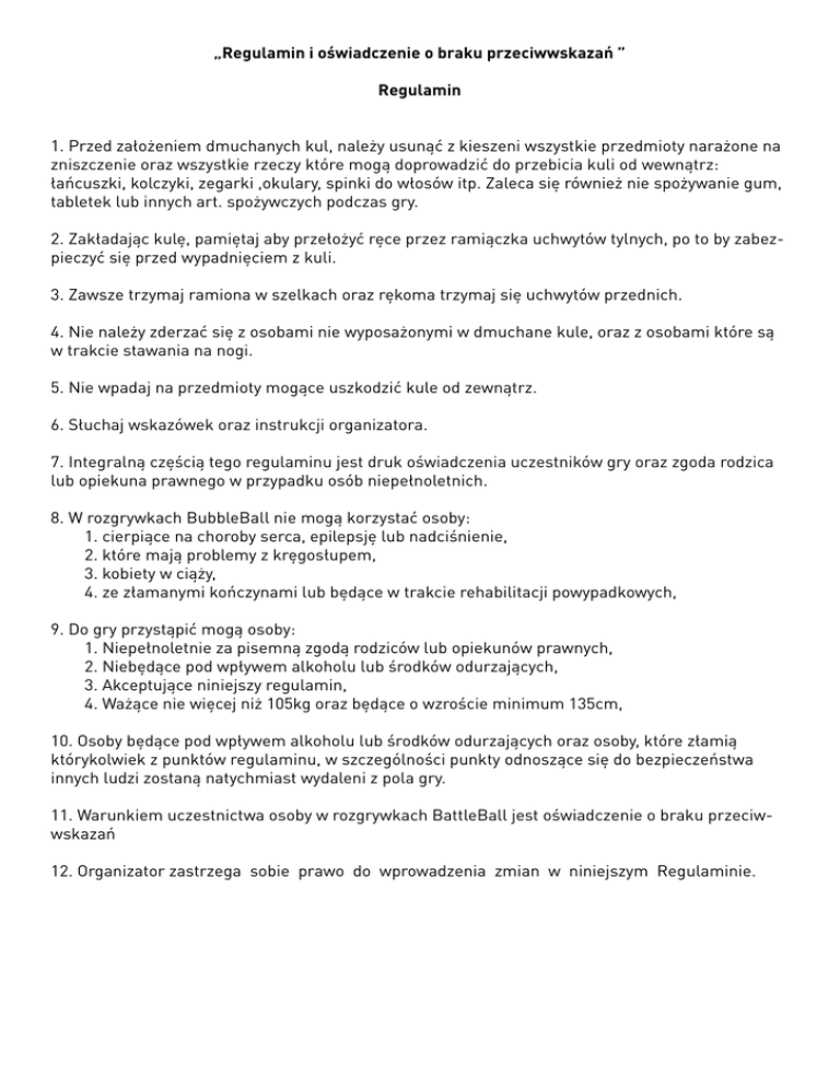 „Regulamin i oświadczenie o braku przeciwwskazań ” Regulamin 1. Przed założeniem dmuchanych kul, należy usunąć z kieszeni wszystkie przedmioty narażone na zniszczenie oraz wszystkie rzeczy które mogą doprowadzić do przebicia kuli od wewnątrz: łańcuszki, kolczyki, zegarki ,okulary, spinki do włosów itp. Zaleca się również nie spożywanie gum, tabletek lub innych art. spożywczych podczas gry. 2. Zakładając kulę, pamiętaj aby przełożyć ręce przez ramiączka uchwytów tylnych, po to by zabezpieczyć się przed wypadnięciem z kuli. 3. Zawsze trzymaj ramiona w szelkach oraz rękoma trzymaj się uchwytów przednich. 4. Nie należy zderzać się z osobami nie wyposażonymi w dmuchane kule, oraz z osobami które są w trakcie stawania na nogi. 5. Nie wpadaj na przedmioty mogące uszkodzić kule od zewnątrz. 6. Słuchaj wskazówek oraz instrukcji organizatora. 7. Integralną częścią tego regulaminu jest druk oświadczenia uczestników gry oraz zgoda rodzica lub opiekuna prawnego w przypadku osób niepełnoletnich. 8. W rozgrywkach BubbleBall nie mogą korzystać osoby: 1. cierpiące na choroby serca, epilepsję lub nadciśnienie, 2. które mają problemy z kręgosłupem, 3. kobiety w ciąży, 4. ze złamanymi kończynami lub będące w trakcie rehabilitacji powypadkowych, 9. Do gry przystąpić mogą osoby: 1. Niepełnoletnie za pisemną zgodą rodziców lub opiekunów prawnych, 2. Niebędące pod wpływem alkoholu lub środków odurzających, 3. Akceptujące niniejszy regulamin, 4. Ważące nie więcej niż 105kg oraz będące o wzroście minimum 135cm, 10. Osoby będące pod wpływem alkoholu lub środków odurzających oraz osoby, które złamią którykolwiek z punktów regulaminu, w szczególności punkty odnoszące się do bezpieczeństwa innych ludzi zostaną natychmiast wydaleni z pola gry. 11. Warunkiem uczestnictwa osoby w rozgrywkach BattleBall jest oświadczenie o braku przeciwwskazań 12. Organizator zastrzega sobie prawo do wprowadzenia zmian w niniejszym Regulaminie.