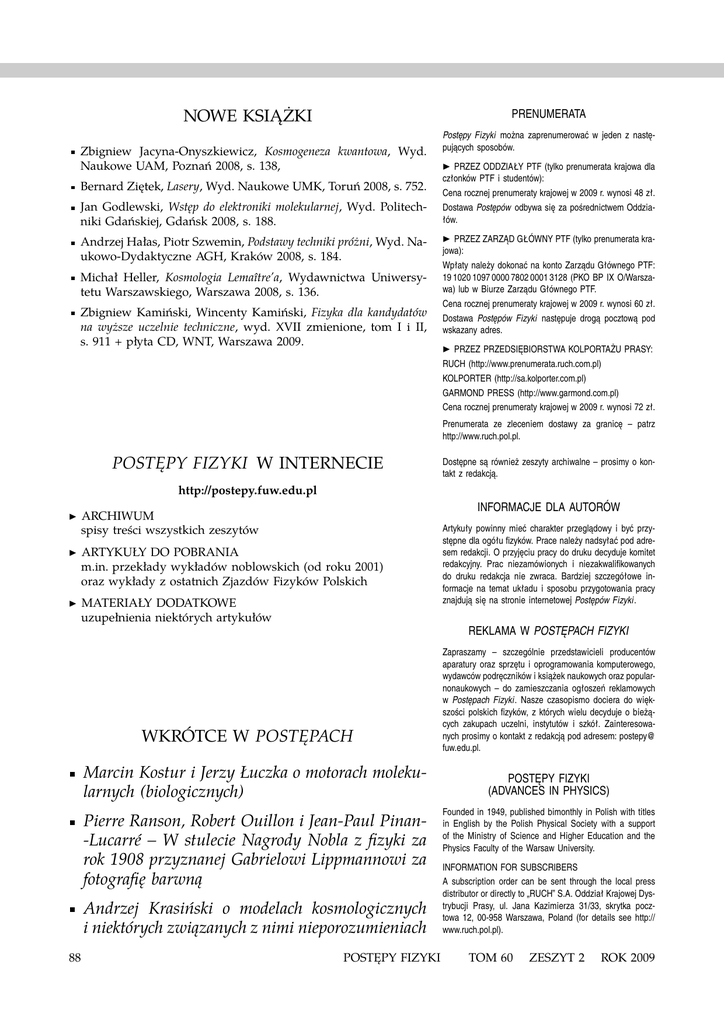NOWE KSIĄŻKI PRENUMERATA Zbigniew Jacyna-Onyszkiewicz, Kosmogeneza kwantowa, Wyd. Naukowe UAM, Poznań 2008, s. 138, Bernard Ziętek, Lasery, Wyd. Naukowe UMK, Toruń 2008, s. 752. Jan Godlewski, Wstęp do elektroniki molekularnej, Wyd. Politechniki Gdańskiej, Gdańsk 2008, s. 188. Andrzej Hałas, Piotr Szwemin, Podstawy techniki próżni, Wyd. Naukowo-Dydaktyczne AGH, Kraków 2008, s. 184. Michał Heller, Kosmologia Lemaître’a, Wydawnictwa Uniwersytetu Warszawskiego, Warszawa 2008, s. 136. Zbigniew Kamiński, Wincenty Kamiński, Fizyka dla kandydatów na wyższe uczelnie techniczne, wyd. XVII zmienione, tom I i II, s. 911 + płyta CD, WNT, Warszawa 2009. Postępy Fizyki można zaprenumerować w jeden z następujących sposobów. PRZEZ ODDZIAŁY PTF (tylko prenumerata krajowa dla członków PTF i studentów): Cena rocznej prenumeraty krajowej w 2009 r. wynosi 48 zł. Dostawa Postępów odbywa się za pośrednictwem Oddziałów. ◮ PRZEZ ZARZĄD GŁÓWNY PTF (tylko prenumerata krajowa): Wpłaty należy dokonać na konto Zarządu Głównego PTF: 19 1020 1097 0000 7802 0001 3128 (PKO BP IX O/Warszawa) lub w Biurze Zarządu Głównego PTF. Cena rocznej prenumeraty krajowej w 2009 r. wynosi 60 zł. Dostawa Postępów Fizyki następuje drogą pocztową pod wskazany adres. ◮ PRZEZ PRZEDSIĘBIORSTWA KOLPORTAŻU PRASY: RUCH (http://www.prenumerata.ruch.com.pl) KOLPORTER (http://sa.kolporter.com.pl) GARMOND PRESS (http://www.garmond.com.pl) Cena rocznej prenumeraty krajowej w 2009 r. wynosi 72 zł. ◮ Prenumerata ze zleceniem dostawy za granicę – patrz http://www.ruch.pol.pl. POSTĘPY FIZYKI W INTERNECIE Dostępne są również zeszyty archiwalne – prosimy o kontakt z redakcją. http://postepy.fuw.edu.pl INFORMACJE DLA AUTORÓW ◮ ARCHIWUM spisy treści wszystkich zeszytów ◮ ARTYKUŁY DO POBRANIA m.in. przekłady wykładów noblowskich (od roku 2001) oraz wykłady z ostatnich Zjazdów Fizyków Polskich ◮ MATERIAŁY DODATKOWE uzupełnienia niektórych artykułów REKLAMA W POSTĘPACH FIZYKI WKRÓTCE W POSTĘPACH Marcin Kostur i Jerzy Łuczka o motorach molekularnych (biologicznych) Pierre Ranson, Robert Ouillon i Jean-Paul Pinan-Lucarré – W stulecie Nagrody Nobla z fizyki za rok 1908 przyznanej Gabrielowi Lippmannowi za fotografię barwną Andrzej Krasiński o modelach kosmologicznych i niektórych związanych z nimi nieporozumieniach 88 Artykuły powinny mieć charakter przeglądowy i być przystępne dla ogółu fizyków. Prace należy nadsyłać pod adresem redakcji. O przyjęciu pracy do druku decyduje komitet redakcyjny. Prac niezamówionych i niezakwalifikowanych do druku redakcja nie zwraca. Bardziej szczegółowe informacje na temat układu i sposobu przygotowania pracy znajdują się na stronie internetowej Postępów Fizyki. POSTĘPY FIZYKI Zapraszamy – szczególnie przedstawicieli producentów aparatury oraz sprzętu i oprogramowania komputerowego, wydawców podręczników i książek naukowych oraz popularnonaukowych – do zamieszczania ogłoszeń reklamowych w Postępach Fizyki. Nasze czasopismo dociera do większości polskich fizyków, z których wielu decyduje o bieżących zakupach uczelni, instytutów i szkół. Zainteresowanych prosimy o kontakt z redakcją pod adresem: postepy@ fuw.edu.pl. POSTĘPY FIZYKI (ADVANCES IN PHYSICS) Founded in 1949, published bimonthly in Polish with titles in English by the Polish Physical Society with a support of the Ministry of Science and Higher Education and the Physics Faculty of the Warsaw University. INFORMATION FOR SUBSCRIBERS A subscription order can be sent through the local press distributor or directly to „RUCH” S.A. Oddział Krajowej Dystrybucji Prasy, ul. Jana Kazimierza 31/33, skrytka pocztowa 12, 00-958 Warszawa, Poland (for details see http:// www.ruch.pol.pl). TOM 60 ZESZYT 2 ROK 2009