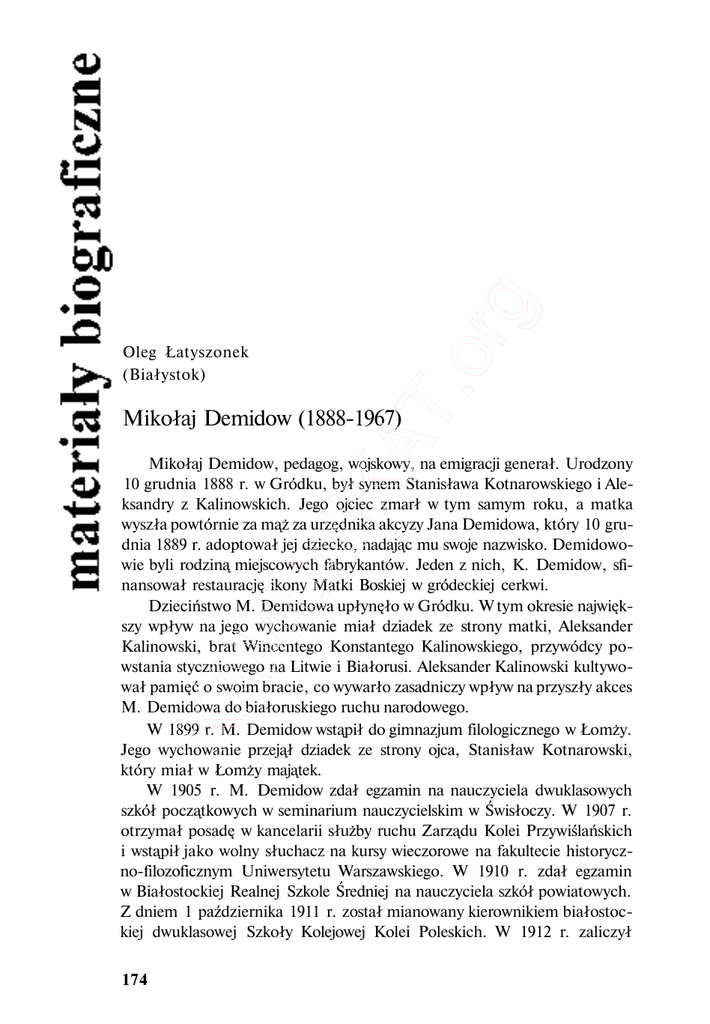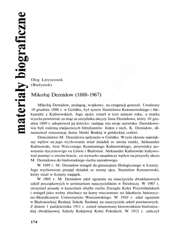 Oleg Ùatyszonek (Biaùystok) Mikoùaj Demidow (1888-1967) Mikoùaj Demidow, pedagog, wojskowy, na emigracji generaù. Urodzony 10 grudnia 1888 r. w Gródku, byù synem Stanisùawa Kotnarowskiego i Aleksandry z Kalinowskich. Jego ojciec zmarù w tym samym roku, a matka wyszùa powtórnie za mąż za urzędnika akcyzy Jana Demidowa, który 10 grudnia 1889 r. adoptowaù jej dziecko, nadając mu swoje nazwisko. Demidowowie byli rodziną miejscowych fabrykantów. Jeden z nich, K. Demidow, sfinansowaù restaurację ikony Matki Boskiej w gródeckiej cerkwi. Dzieciństwo M. Demidowa upùynęùo w Gródku. W tym okresie największy wpùyw na jego wychowanie miaù dziadek ze strony matki, Aleksander Kalinowski, brat Wincentego Konstantego Kalinowskiego, przywódcy powstania styczniowego na Litwie i Biaùorusi. Aleksander Kalinowski kultywowaù pamięć o swoim bracie, co wywarùo zasadniczy wpùyw na przyszùy akces M. Demidowa do biaùoruskiego ruchu narodowego. W 1899 r. M. Demidow wstąpiù do gimnazjum filologicznego w Ùomży. Jego wychowanie przejąù dziadek ze strony ojca, Stanisùaw Kotnarowski, który miaù w Ùomży majątek. W 1905 r. M. Demidow zdaù egzamin na nauczyciela dwuklasowych szkóù początkowych w seminarium nauczycielskim w Świsùoczy. W 1907 r. otrzymaù posadę w kancelarii sùużby ruchu Zarządu Kolei Przywiślańskich i wstąpiù jako wolny sùuchacz na kursy wieczorowe na fakultecie historyczno-filozoficznym Uniwersytetu Warszawskiego. W 1910 r. zdaù egzamin w Biaùostockiej Realnej Szkole Średniej na nauczyciela szkóù powiatowych. Z dniem 1 października 1911 r. zostaù mianowany kierownikiem biaùostockiej dwuklasowej Szkoùy Kolejowej Kolei Poleskich. W 1912 r. zaliczyù 174 w Wileńskim Instytucie Pedagogicznym letni kurs pedagogiki i metodyki oraz wykùady z historii tzw. Kraju Póùnocno-Zachodniego (tj. Litwy i Biaùorusi). Zdaù egzamin na nauczyciela historii i języka rosyjskiego szkóù miejskich Wileńskiego Okręgu Szkolnego. 18 lipca 1914 r. zostaù zmobilizowany do armii rosyjskiej. Sùużyù początkowo w pododdziaùach gospodarczych różnych jednostek wojskowych na Kowieńszczyźnie. Pod koniec stycznia 1915 r. przeniesiony na stanowisko pisarza wydziaùu mobilizacji oficerów w Piotrogrodzie. Pod koniec tegoż roku uczęszczaù na kursy w Wojskowej Akademii Mikoùajewskiej. W październiku 1916 r. skierowany do Pierwszej Pawùowskiej Szkoùy Wojskowej, którą ukończyù 1 lutego 1917 r. i mianowany zostaù oficerem kursowym 7 kompanii we wspomnianej szkole. Po rewolucji październikowej wstąpiù do związku oficerów-rewolucjonistów. Mianowany zostaù nowogrodzkim komisarzem obwodowym. Wykonując swe obowiązki odwiedziù Dźwińsk (dawniej Dyneburg, obecnie Daugavpils), gdzie dostaù się na początku marca 1918 r. do niewoli niemieckiej. Po rewolucji w Niemczech zostaù zwolniony z niewoli pod koniec listopada 1918 r. i udaù się do Wilna, gdzie aktywnie wùączyù się do organizacji biaùoruskich oddziaùów w armii litewskiej. 1 grudnia 1918 r. odkomenderowany jako oficer zapasu w stopniu porucznika do Litewskiego Ministerstwa Obrony. 20 grudnia 1918 r. przybyù w stopniu kapitana wraz z grupą biaùoruskich oficerów do Grodna, gdzie objąù stanowisko komendanta miasta. Zorganizowaù trzystupięćdziesięcioosobowy Samodzielny Batalion Komendy Grodzieńskiej, peùniący sùużbę wartowniczą i patrolową żandarmerię oraz sùużbę kolejową pocztową i telegraficzną. Do jego obowiązków należaùa także organizacja werbunku ochotników do oddziaùów biaùoruskich. Dzięki energicznym dziaùaniom M. Demidowa powstaùy punkty werbunkowe w Biaùymstoku, Bielsku, Brześciu, Druskiennikach, Prużanie, Sùonimiu, Sokóùce, Szczuczynie, Wasiliszkach i Woùkowysku. Mikoùaj Demidow organizowaù także ochronę alianckich misji, amerykańskiej i francuskiej, które odwiedziùy Grodno. 1 czerwca 1919 r. zostaù aresztowany przez wùadze polskie, które zamierzaùy wymienić go na więzionego w Kownie polonofilskiego dziaùacza biaùoruskiego Kazimierza Ćwirkę-Godyckiego aresztowanego wcześniej przez M. Demidowa. Pod koniec lipca 1919 r. zostaù internowany w obozie w Biaùymstoku. Po zwolnieniu z internowania, we wrześniu 1919 r. wstąpiù na biaùoruskie kursy nauczycielskie (i je ukończyù). W tym samym czasie wszedù w skùad Biaùoruskiej Komisji Wojskowej (BKW) w Wilnie, zalegalizowanej 22 października 1919 r. dekretem Józefa Piùsudskiego. Na początku października 1919 r. byù czùonkiem komisji organizacyjnej BKW. Na początku grudnia 1919 r. M. Demidow wraz z BKW przeniósù się do Mińska, a następnie skierowany zostaù do biaùoruskiej szkoùy podchorążych, utworzonej w Warszawie na mocy wspomnianego dekretu. 175 Zniechęcony bezczynnością BKW, M. Demidow wstąpiù latem 1920 r. (w czasie bolszewickiego pochodu na Warszawę) do armii gen. Stanisùawa Buùak-Baùachowicza. Generaù zleciù M. Demidowowi sformowanie Samodzielnego Batalionu Biaùoruskiego i mianowaù go dowódcą tego batalionu. Zwerbowani przez M. Demidowa ochotnicy pochodzili z Biaùostocczyzny. Batalion liczyù ok. 700 bagnetów (w tym 26 oficerów). W skùadzie Ostrowskiego Puùku Piechoty 2 Dywizji Piechoty wziąù udziaù w podjętej przez gen. S. Buùak-Baùachowicza w listopadzie 1920 r. zbrojnej próbie utworzenia niepodlegùej Biaùoruskiej Republiki Ludowej. Ostrowski Puùk Piechoty w dniach 10-14 listopada Mikoùaj Demidow w 1919 r. (?) 1920 r. toczyù zacięte walki o miasto Fot. ze zbiorów Mikoùaja Ùatuszkina i stację kolejową Kalenkowicze, które kilkakrotnie przechodziùy z rąk do rąk, zaś od 17 listopada 1920 r. osùaniaù odwrót grupy gen. Józefa Buùak-Baùachowicza spod Mozyrza. 27 listopada 1920 r. dowodzony przez M. Demidowa batalion zatrzymaù się na linii demarkacyjnej pomiędzy Olszanami i Maleszewem na prawym brzegu Prypeci wraz z biaùoruskim batalionem Smoleńskiego Puùku Piechoty. Tego samego dnia biaùo