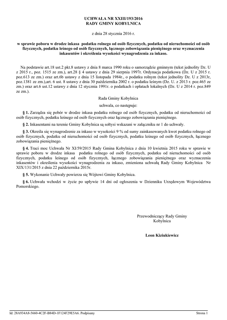 UCHWAŁA NR XXIII/193/2016 RADY GMINY KOBYLNICA z dnia 28 stycznia 2016 r. w sprawie poboru w drodze inkasa podatku rolnego od osób fizycznych, podatku od nieruchomości od osób fizycznych, podatku leśnego od osób fizycznych, łącznego zobowiązania pieniężnego oraz wyznaczenia inkasentów i określenia wysokości wynagrodzenia za inkaso. Na podstawie art.18 ust.2 pkt.8 ustawy z dnia 8 marca 1990 roku o samorządzie gminnym (tekst jednolity Dz. U z 2015 r., poz. 1515 ze zm.), art.28 § 4 ustawy z dnia 29 sierpnia 1997r. Ordynacja podatkowa (Dz. U z 2015 r. poz.613 ze zm.) oraz art.6b ustawy z dnia 15 listopada 1984r., o podatku rolnym (tekst jednolity Dz. U z 2013r, poz.1381 ze zm.),art. 6 ust. 8 ustawy z dnia 30 października 2002 r. o podatku leśnym (Dz. U. z 2013 r. poz.465 ze zm.) oraz art.6 ust.12 ustawy z dnia 12 stycznia 1991r. o podatkach i opłatach lokalnych (Dz. U z 2014 r. poz.849 ze zm.). Rada Gminy Kobylnica uchwala, co następuje: § 1. Zarządza się pobór w drodze inkasa podatku rolnego od osób fizycznych, podatku od nieruchomości od osób fizycznych, podatku leśnego od osób fizycznych oraz łącznego zobowiązania pieniężnego. § 2. Inkasentami na terenie Gminy Kobylnica są sołtysi wskazani w załączniku nr 1 do uchwały. § 3. Określa się wynagrodzenie za inkaso w wysokości 9 % od sumy zainkasowanych kwot podatku rolnego od osób fizycznych, podatku od nieruchomości od osób fizycznych, podatku leśnego od osób fizycznych, łącznego zobowiązania pieniężnego. § 4. Traci moc Uchwała Nr XI/59/2015 Rady Gmina Kobylnica z dnia 10 kwietnia 2015 roku w sprawie w sprawie poboru w drodze inkasa podatku rolnego od osób fizycznych, podatku od nieruchomości od osób fizycznych, podatku leśnego od osób fizycznych, łącznego zobowiązania pieniężnego oraz wyznaczenia inkasentów i określenia wysokości wynagrodzenia za inkaso, zmieniona uchwałą Rady Gminy Kobylnica Nr XIX/131/2015 z dnia 22 października 2015r. § 5. Wykonanie Uchwały powierza się Wójtowi Gminy Kobylnica. § 6. Uchwała wchodzi w życie po upływie 14 dni od ogłoszenia w Dzienniku Urzędowym Województwa Pomorskiego. Przewodniczący Rady Gminy Kobylnica Leon Kiziukiewicz Id: 28A934A8-5660-4C2F-B84D-1F124F29E5A6. Podpisany Strona 1 Załącznik do Uchwały Nr XXIII/193/2016 Rady Gminy Kobylnica z dnia 28 stycznia 2016 r. Wykaz inkasentów podatku rolnego od osób fizycznych, podatku od nieruchomości od osób fizycznych, podatku leśnego od osób fizycznych, łącznego zobowiązania pieniężnego dla poszczególnych sołectw: Lp. 1 2 3 4 5 6 7 8 9 10 11 12 13 14 15 16 17 18 19 20 21 22 23 24 25 SOŁECTWO Bolesławice Bzowo Kobylnica Komiłowo Komorczyn Kończewo Kruszyna Kuleszewo Kwakowo Lubuń Lulemino Łosino Płaszewo Reblino Runowo Sławieńskie Sierakowo Słonowice Słonowiczki Sycewice Ścięgnica Widzino Wrząca Zagórki Zębowo Żelkówko INKASENT Wolański Marian Biliński Piotr Grygier Aleksander Drapalski Piotr Przybył Mirosław Kędzior Robert Wawrzyniak Helena Stępień Barbara Cudziło Urszula Olech Marek Tates Kazimiera Kiziukiewicz Leon Szczepańska Mariola Brzykcy Krystyna Bielańczuk Julita Narodzonek Mariusz Koleśnikow Ewa Nowodworski Adam Poddębniak Alicja Latała Justyna Piątek Jarosław Wilkos Józef Skóra Waldemar Mazur Leszek Kaczmarska Paulina Id: 28A934A8-5660-4C2F-B84D-1F124F29E5A6. Podpisany Strona 1