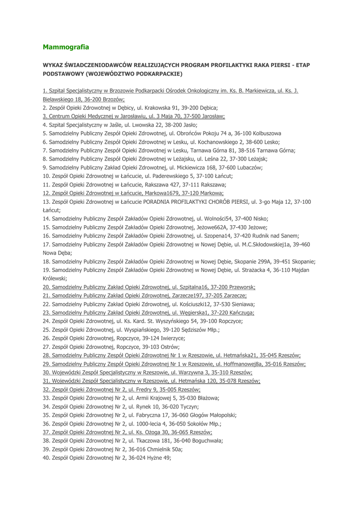Mammografia WYKAZ ŚWIADCZENIODAWCÓW REALIZUJĄCYCH PROGRAM PROFILAKTYKI RAKA PIERSI - ETAP PODSTAWOWY (WOJEWÓDZTWO PODKARPACKIE) 1. Szpital Specjalistyczny w Brzozowie Podkarpacki Ośrodek Onkologiczny im. Ks. B. Markiewicza, ul. Ks. J. Bielawskiego 18, 36-200 Brzozów; 2. Zespół Opieki Zdrowotnej w Dębicy, ul. Krakowska 91, 39-200 Dębica; 3. Centrum Opieki Medycznej w Jarosławiu, ul. 3 Maja 70, 37-500 Jarosław; 4. Szpital Specjalistyczny w Jaśle, ul. Lwowska 22, 38-200 Jasło; 5. Samodzielny Publiczny Zespół Opieki Zdrowotnej, ul. Obrońców Pokoju 74 a, 36-100 Kolbuszowa 6. Samodzielny Publiczny Zespół Opieki Zdrowotnej w Lesku, ul. Kochanowskiego 2, 38-600 Lesko; 7. Samodzielny Publiczny Zespół Opieki Zdrowotnej w Lesku, Tarnawa Górna 81, 38-516 Tarnawa Górna; 8. Samodzielny Publiczny Zespół Opieki Zdrowotnej w Leżajsku, ul. Leśna 22, 37-300 Leżajsk; 9. Samodzielny Publiczny Zakład Opieki Zdrowotnej, ul. Mickiewicza 168, 37-600 Lubaczów; 10. Zespół Opieki Zdrowotnej w Łańcucie, ul. Paderewskiego 5, 37-100 Łańcut; 11. Zespół Opieki Zdrowotnej w Łańcucie, Rakszawa 427, 37-111 Rakszawa; 12. Zespół Opieki Zdrowotnej w Łańcucie, Markowa1679, 37-120 Markowa; 13. Zespół Opieki Zdrowotnej w Łańcucie PORADNIA PROFILAKTYKI CHORÓB PIERSI, ul. 3-go Maja 12, 37-100 Łańcut; 14. Samodzielny Publiczny Zespół Zakładów Opieki Zdrowotnej, ul. Wolności54, 37-400 Nisko; 15. Samodzielny Publiczny Zespół Zakładów Opieki Zdrowotnej, Jeżowe662A, 37-430 Jeżowe; 16. Samodzielny Publiczny Zespół Zakładów Opieki Zdrowotnej, ul. Szopena14, 37-420 Rudnik nad Sanem; 17. Samodzielny Publiczny Zespół Zakładów Opieki Zdrowotnej w Nowej Dębie, ul. M.C.Skłodowskiej1a, 39-460 Nowa Dęba; 18. Samodzielny Publiczny Zespół Zakładów Opieki Zdrowotnej w Nowej Dębie, Skopanie 299A, 39-451 Skopanie; 19. Samodzielny Publiczny Zespół Zakładów Opieki Zdrowotnej w Nowej Dębie, ul. Strażacka 4, 36-110 Majdan Królewski; 20. Samodzielny Publiczny Zakład Opieki Zdrowotnej, ul. Szpitalna16, 37-200 Przeworsk; 21. Samodzielny Publiczny Zakład Opieki Zdrowotnej, Zarzecze197, 37-205 Zarzecze; 22. Samodzielny Publiczny Zakład Opieki Zdrowotnej, ul. Kościuszki12, 37-530 Sieniawa; 23. Samodzielny Publiczny Zakład Opieki Zdrowotnej, ul. Węgierska1, 37-220 Kańczuga; 24. Zespół Opieki Zdrowotnej, ul. Ks. Kard. St. Wyszyńskiego 54, 39-100 Ropczyce; 25. Zespół Opieki Zdrowotnej, ul. Wyspiańskiego, 39-120 Sędziszów Młp.; 26. Zespół Opieki Zdrowotnej, Ropczyce, 39-124 Iwierzyce; 27. Zespół Opieki Zdrowotnej, Ropczyce, 39-103 Ostrów; 28. Samodzielny Publiczny Zespół Opieki Zdrowotnej Nr 1 w Rzeszowie, ul. Hetmańska21, 35-045 Rzeszów; 29. Samodzielny Publiczny Zespół Opieki Zdrowotnej Nr 1 w Rzeszowie, ul. Hoffmanowej8a, 35-016 Rzeszów; 30. Wojewódzki Zespół Specjalistyczny w Rzeszowie, ul. Warzywna 3, 35-310 Rzeszów; 31. Wojewódzki Zespół Specjalistyczny w Rzeszowie, ul. Hetmańska 120, 35-078 Rzeszów; 32. Zespół Opieki Zdrowotnej Nr 2, ul. Fredry 9, 35-005 Rzeszów; 33. Zespół Opieki Zdrowotnej Nr 2, ul. Armii Krajowej 5, 35-030 Błażowa; 34. Zespół Opieki Zdrowotnej Nr 2, ul. Rynek 10, 36-020 Tyczyn; 35. Zespół Opieki Zdrowotnej Nr 2, ul. Fabryczna 17, 36-060 Głogów Małopolski; 36. Zespół Opieki Zdrowotnej Nr 2, ul. 1000-lecia 4, 36-050 Sokołów Młp.; 37. Zespół Opieki Zdrowotnej Nr 2, ul. Ks. Ożoga 30, 36-065 Rzeszów; 38. Zespół Opieki Zdrowotnej Nr 2, ul. Tkaczowa 181, 36-040 Boguchwała; 39. Zespół Opieki Zdrowotnej Nr 2, 36-016 Chmielnik 50a; 40. Zespół Opieki Zdrowotnej Nr 2, 36-024 Hyżne 49; 41. Zespół Opieki Zdrowotnej Nr 2, 36-007 Krasne 944; 42. Zespół Opieki Zdrowotnej Nr 2, 36-042 Lubenia 374; 43. Zespół Opieki Zdrowotnej Nr 2, 36-072 Świlcza 142; 44. Samodzielny Publiczny Zespół Opieki Zdrowotnej w Sanoku, ul. Jana Pawła II 38, 38-500 Sanok; 45. Samodzielny Publiczny Zespół Opieki Zdrowotnej w Sanoku, ul. Błonie 9, 38-500 Sanok; 46. Samodzielny Publiczny Zespół Opieki Zdrowotnej w Sanoku, Sanok, 800-lecia 26, 38-540 Zagórz, 47. Samodzielny Publiczny Zespół Opieki Zdrowotnej w Sanoku, 38-507 Bukowsko 48. Samodzielny Publiczny Zespół Opieki Zdrowotnej w Sanoku, ul. 800-lecia26, 38-500 Sanok, 49. Samodzielny Publiczny Zakład Opieki Zdrowotnej, ul. Kwiatkowskiego 2, 37-450 Stalowa Wola, 50. Samodzielny Publiczny Zespół Zakładów Opieki Zdrowotnej Powiatowy Szpital Specjalistyczny w Stalowej, ul. Staszica4, 37-450 Stalowa Wola; 51. Zespół Opieki Zdrowotnej w Strzyżowie, ul. Parkowa4, 38-100 Strzyżów; 52. Przychodnia Specjalistyczna w Tarnobrzegu, ul. 1 Maja 1, 39-400 Tarnobrzeg; 53. Samodzielny Publiczny Zespół Opieki Zdrowotnej w Ustrzykach Dolnych, ul. 29 Listopada57, 38-700 Ustrzyki Dolne; 54. Wojewódzki Szpital w Przemyślu, ul. Monte Cassino 18, 37-700 Przemyśl; 55. Wojewódzki Szpital im. Zofii z Zamoyskich Tarnowskiej w Tarnobrzegu, ul. Szpitalna 1, 39-400 Tarnobrzeg; 56. Wojewódzki Szpital Podkarpacki im. Jana Pawła II w Krośnie, ul. Korczyńska57, 38-400 Krosno; 57. Samodzielny Publiczny Zespół Zakładów Opieki Zdrowotnej "Sanatorium" im. Jana Pawła II w Górnie, Górno, 36-051 Górno; 58. Szpital Wojewódzki Nr 2 w Rzeszowie, ul. Lwowska 60, 35-301 Rzeszów; 59. Zakład Opieki Zdrowotnej Ministerstwa Spraw Wewnętrznych i Administracji w Rzeszowie; ul. Krakowska 16, 35-111 Rzeszów; 60. Zakład Opieki Zdrowotnej Ministerstwa Spraw Wewnętrznych i Administracji w Rzeszowie, ul. Portiusa, 38-400 Krosno; 61. Szpital Wojskowy z Przychodnią Samodzielny Publiczny Zakład Opieki Zdrowotnej w Przemyślu PORADNIA GINEKOLOGICZNA, ul. Słowackiego 85, 37-700 Przemyśl 62. Samodzielny Publiczny Zakład Podstawowej Opieki Zdrowotnej w Komańczy, Komańcza 161, 38-543 Komańcza; 63. Obwód Lecznictwa Kolejowego w Rzeszowie - s.p.z.o.z., ul. Dworcowy 2, 35-201 Rzeszów; 64. Samodzielny Publiczny Zakład Podstawowej Opieki Zdrowotnej w Besku, ul. Błonie 3, 38-524 Besko